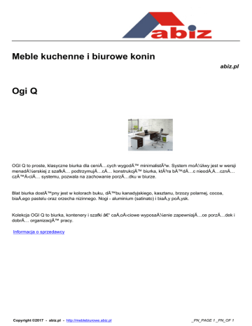 Meble kuchenne i biurowe konin abiz.pl Ogi Q OGI Q to proste, klasyczne biurka dla ceniÄ…cych wygodÄ™ minimalistów. System możliwy jest w wersji menadżerskiej z szafkÄ… podtrzymujÄ…cÄ… konstrukcjÄ™ biurka, która bÄ™dÄ…c nieodłącznÄ… częściÄ… systemu, pozwala na zachowanie porzÄ…dku w biurze. Blat biurka dostÄ™pny jest w kolorach buku, dÄ™bu kanadyjskiego, kasztanu, brzozy polarnej, cocoa, biaÅ‚ego pastelu oraz orzecha nizinnego. Nogi - aluminium (satinato) i biaÅ‚y poÅ‚ysk. Kolekcja OGI Q to biurka, kontenery i szafki – caÅ‚oÅ›ciowe wyposażenie zapewniajÄ…ce porzÄ…dek i dobrÄ… organizacjÄ™ pracy. Informacja o sprzedawcy Copyright ©2017 - abiz.pl - http://meblebiurowe.abiz.pl _PN_PAGE 1 _PN_OF 1