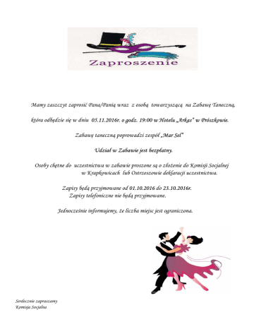 Mamy zaszczyt zaprosić Pana/Panią wraz z osobą towarzyszącą na Zabawę Taneczną, która odbędzie się w dniu 05.11.2016r. o godz. 19:00 w Hotelu „Arkas” w Prószkowie. Zabawę taneczną poprowadzi zespół „Mar Sel” Udział w Zabawie jest bezpłatny. Osoby chętne do uczestnictwa w zabawie proszone są o złożenie do Komisji Socjalnej w Krapkowicach lub Ostrzeszowie deklaracji uczestnictwa. Zapisy będą przyjmowane od 01.10.2016 do 23.10.2016r. Zapisy telefoniczne nie będą przyjmowane. Jednocześnie informujemy, że liczba miejsc jest ograniczona. Serdecznie zapraszamy Komisja Socjalna DEKLARACJA UCZESTNICTWA W ZABAWIE TANECZNEJ (PROSIMY O CZYTELNE WYPEŁNIENIE I ODESŁANIE DO DNIA 23.10.2016r) ............................................................................................................................ (imię i nazwisko) ............................................................................................................................ (dzial) ............................................................................................................................ (adres do korespondencji) ............................................................................................................................ (numer telefonu, faxu) ............................................................................................................................ (adres e-mail) Niniejszym deklaruję udział w Zabawie tanecznej, wraz z osobą ……………………………..……………..organizowanym przez Multiserwis Sp z o.o. w dniu 05.11.2016r. towarzyszącą* (imię i nazwisko osoby towarzyszącej) 1. Rezygnacja z udziału w zabawie tanecznej musi nastąpić w formie pisemnej (list polecony przesłany na adres spółki) lub pocztą elektroniczną na adres e-mail: [email protected] co najmniej na 7 dni przed balem. 2. W przypadku braku zgłoszenia rezygnacji z udziału w zabawie tanecznej (dla osób, które wcześniej zgłosiły chęć udziału) wyrażam zgodę na potrącenie z mojego wynagrodzenia kwoty: w wysokości 300,00 PLN/600,00 PLN** odpowiadającej kosztom uczestnictwa. 3. Wypełnienie i wysłanie formularza zgłoszeniowego na zabawę taneczną jest jednoznaczne z akceptacją warunków uczestnictwa i rezygnacji. Wszystkie pytania dotyczące organizacji Balu prosimy przesyłać na adres e-mail: [email protected]. -*) - niepotrzebne skreślić -**) - zaznaczyć kwotę w zależności od uczestnictwa – samodzielnie lub z osobą towarzyszącą .............................................., dnia ......../........./ .................................................................... podpis