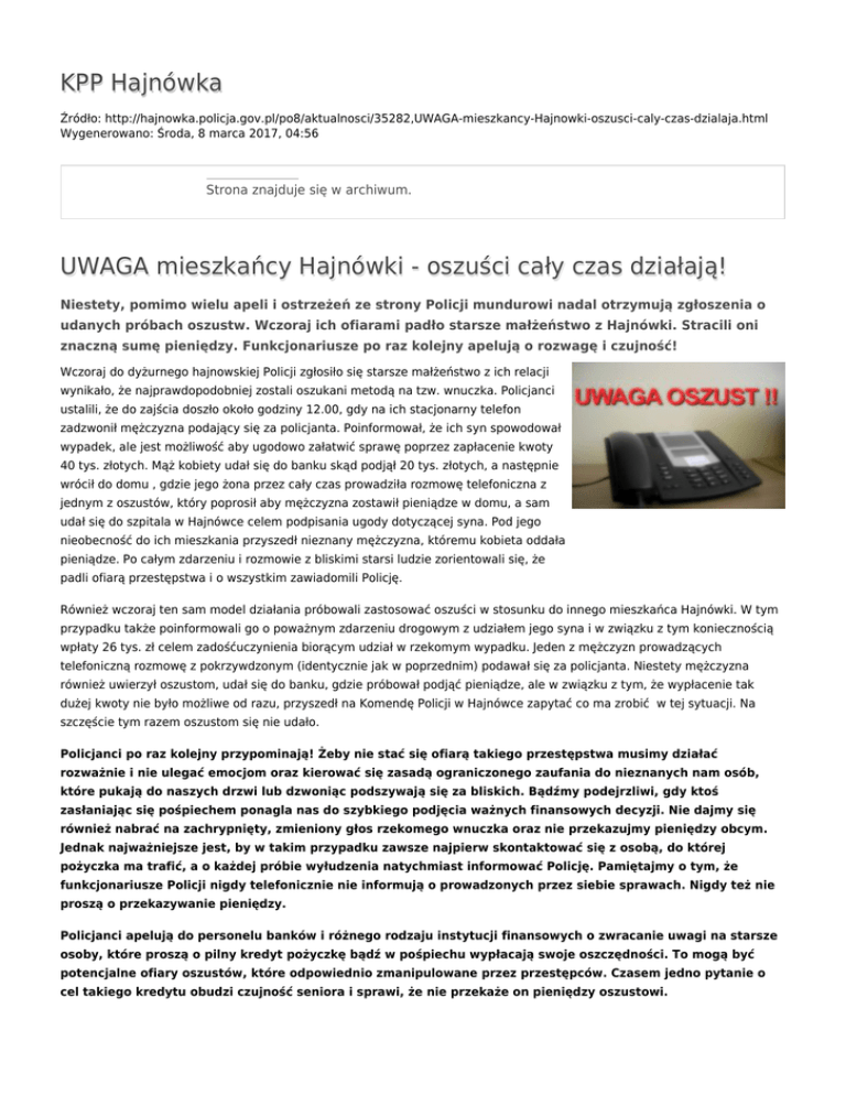 KPP Hajnówka Źródło: http://hajnowka.policja.gov.pl/po8/aktualnosci/35282,UWAGA-mieszkancy-Hajnowki-oszusci-caly-czas-dzialaja.html Wygenerowano: Środa, 8 marca 2017, 04:56 Strona znajduje się w archiwum. UWAGA mieszkańcy Hajnówki - oszuści cały czas działają! Niestety, pomimo wielu apeli i ostrzeżeń ze strony Policji mundurowi nadal otrzymują zgłoszenia o udanych próbach oszustw. Wczoraj ich ofiarami padło starsze małżeństwo z Hajnówki. Stracili oni znaczną sumę pieniędzy. Funkcjonariusze po raz kolejny apelują o rozwagę i czujność! Wczoraj do dyżurnego hajnowskiej Policji zgłosiło się starsze małżeństwo z ich relacji wynikało, że najprawdopodobniej zostali oszukani metodą na tzw. wnuczka. Policjanci ustalili, że do zajścia doszło około godziny 12.00, gdy na ich stacjonarny telefon zadzwonił mężczyzna podający się za policjanta. Poinformował, że ich syn spowodował wypadek, ale jest możliwość aby ugodowo załatwić sprawę poprzez zapłacenie kwoty 40 tys. złotych. Mąż kobiety udał się do banku skąd podjął 20 tys. złotych, a następnie wrócił do domu , gdzie jego żona przez cały czas prowadziła rozmowę telefoniczna z jednym z oszustów, który poprosił aby mężczyzna zostawił pieniądze w domu, a sam udał się do szpitala w Hajnówce celem podpisania ugody dotyczącej syna. Pod jego nieobecność do ich mieszkania przyszedł nieznany mężczyzna, któremu kobieta oddała pieniądze. Po całym zdarzeniu i rozmowie z bliskimi starsi ludzie zorientowali się, że padli ofiarą przestępstwa i o wszystkim zawiadomili Policję. Również wczoraj ten sam model działania próbowali zastosować oszuści w stosunku do innego mieszkańca Hajnówki. W tym przypadku także poinformowali go o poważnym zdarzeniu drogowym z udziałem jego syna i w związku z tym koniecznością wpłaty 26 tys. zł celem zadośćuczynienia biorącym udział w rzekomym wypadku. Jeden z mężczyzn prowadzących telefoniczną rozmowę z pokrzywdzonym (identycznie jak w poprzednim) podawał się za policjanta. Niestety mężczyzna również uwierzył oszustom, udał się do banku, gdzie próbował podjąć pieniądze, ale w związku z tym, że wypłacenie tak dużej kwoty nie było możliwe od razu, przyszedł na Komendę Policji w Hajnówce zapytać co ma zrobić w tej sytuacji. Na szczęście tym razem oszustom się nie udało. Policjanci po raz kolejny przypominają! Żeby nie stać się ofiarą takiego przestępstwa musimy działać rozważnie i nie ulegać emocjom oraz kierować się zasadą ograniczonego zaufania do nieznanych nam osób, które pukają do naszych drzwi lub dzwoniąc podszywają się za bliskich. Bądźmy podejrzliwi, gdy ktoś zasłaniając się pośpiechem ponagla nas do szybkiego podjęcia ważnych finansowych decyzji. Nie dajmy się również nabrać na zachrypnięty, zmieniony głos rzekomego wnuczka oraz nie przekazujmy pieniędzy obcym. Jednak najważniejsze jest, by w takim przypadku zawsze najpierw skontaktować się z osobą, do której pożyczka ma trafić, a o każdej próbie wyłudzenia natychmiast informować Policję. Pamiętajmy o tym, że funkcjonariusze Policji nigdy telefonicznie nie informują o prowadzonych przez siebie sprawach. Nigdy też nie proszą o przekazywanie pieniędzy. Policjanci apelują do personelu banków i różnego rodzaju instytucji finansowych o zwracanie uwagi na starsze osoby, które proszą o pilny kredyt pożyczkę bądź w pośpiechu wypłacają swoje oszczędności. To mogą być potencjalne ofiary oszustów, które odpowiednio zmanipulowane przez przestępców. Czasem jedno pytanie o cel takiego kredytu obudzi czujność seniora i sprawi, że nie przekaże on pieniędzy oszustowi. * wykorzystując zawarte na stronie treści, zdjęcia lub filmy proszę powoływać się na źródło informacji – www.podlaska.policja.gov.pl Ocena: 0/5 (0) Tweetnij