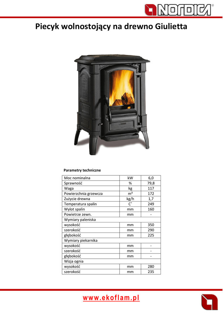 Piecyk wolnostojący na drewno Giulietta Parametry techniczne Moc nominalna Sprawnośd Waga Powierzchnia grzewcza Zużycie drewna Temperatura spalin Wylot spalin Powietrze zewn. Wymiary paleniska wysokośd szerokośd głębokośd Wymiary piekarnika wysokośd szerokośd głębokośd Wizja ognia wysokośd szerokośd kW % kg m³ kg/h C˚ mm mm 6,0 79,8 117 172 1,7 249 160 - mm mm mm 350 290 225 mm mm mm - mm mm 280 235 www .e kof l am .p l Wymiary www .e kof l am .p l