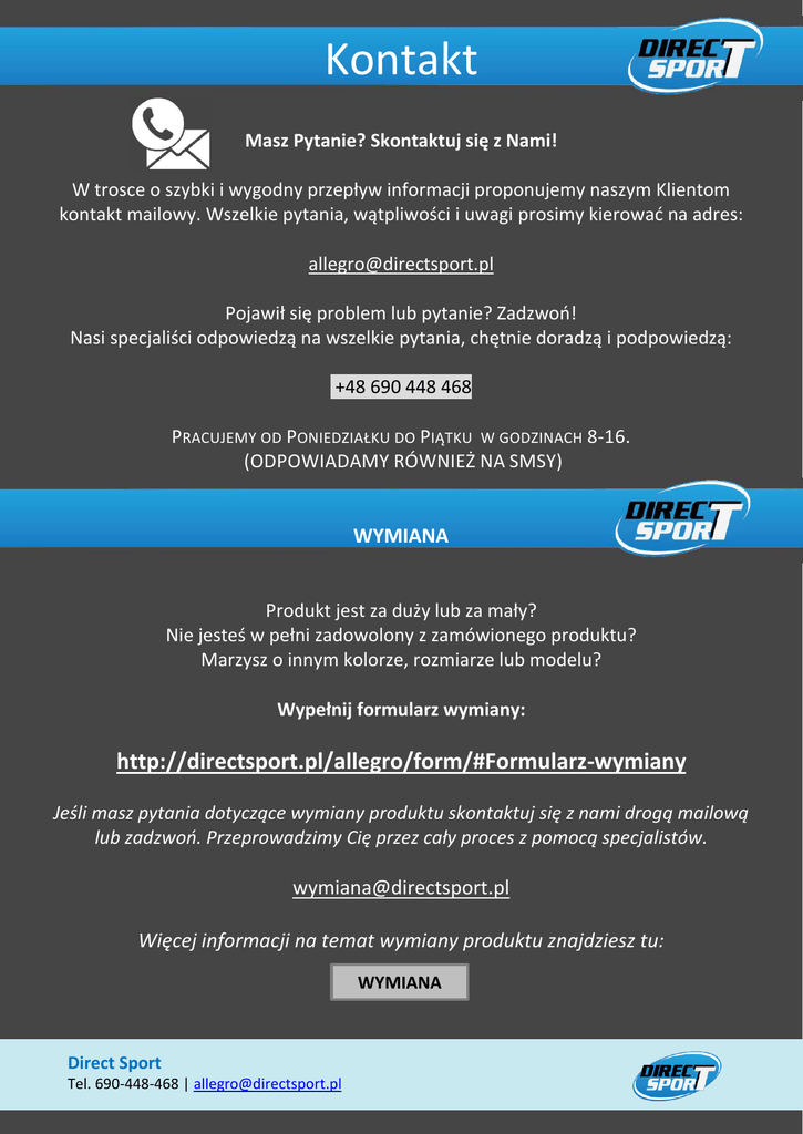 Kontakt Masz Pytanie? Skontaktuj się z Nami! W trosce o szybki i wygodny przepływ informacji proponujemy naszym Klientom kontakt mailowy. Wszelkie pytania, wątpliwości i uwagi prosimy kierowad na adres: [email protected] Pojawił się problem lub pytanie? Zadzwoo! Nasi specjaliści odpowiedzą na wszelkie pytania, chętnie doradzą i podpowiedzą: +48 690 448 468 PRACUJEMY OD PONIEDZIAŁKU DO PIĄTKU W GODZINACH 8-16. (ODPOWIADAMY RÓWNIEŻ NA SMSY) WYMIANA Produkt jest za duży lub za mały? Nie jesteś w pełni zadowolony z zamówionego produktu? Marzysz o innym kolorze, rozmiarze lub modelu? Wypełnij formularz wymiany: http://directsport.pl/allegro/form/#Formularz-wymiany Jeśli masz pytania dotyczące wymiany produktu skontaktuj się z nami drogą mailową lub zadzwoo. Przeprowadzimy Cię przez cały proces z pomocą specjalistów. [email protected] Więcej informacji na temat wymiany produktu znajdziesz tu: WYMIANA Direct Sport Tel. 690-448-468 | [email protected] ZWROT Produkt Ci nie odpowiada? Nie ma problemu, wypełnij formularz i odeślij go do nas. Wypełnij formularz zwrotu: http://directsport.pl/allegro/form/#Formularz-zwrotu Jeśli masz pytania dotyczące zwrotu produktu skontaktuj się z nami drogą mailową lub zadzwoo. Przeprowadzimy Cię przez cały proces z pomocą specjalistów. [email protected] Więcej informacji na temat zwrotu produktu znajdziesz tu: ZWROT REKLAMACJA Dostarczony produkt jest uszkodzony? Skontaktuj się z nami. Wypełnij formularz reklamacji i zwrotu: http://directsport.pl/allegro/form/#Formularz-reklamacyjny Jeśli masz pytania dotyczące reklamacji produktu skontaktuj się z nami drogą mailową lub zadzwoo. Przeprowadzimy Cię przez cały proces z pomocą specjalistów. [email protected] Więcej informacji na temat reklamacji produktu znajdziesz tu: REKLAMACJA Direct Sport Tel. 690-448-468 | [email protected]