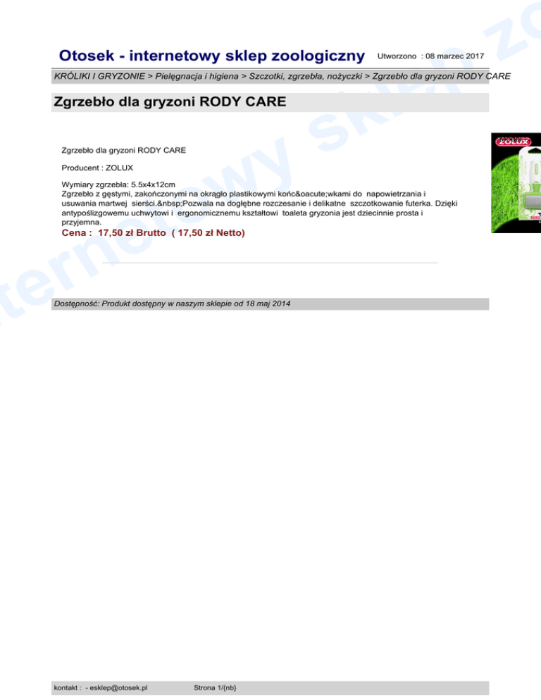 Otosek - internetowy sklep zoologiczny p le Utworzono : 08 marzec 2017 o z KRÓLIKI I GRYZONIE > Pielęgnacja i higiena > Szczotki, zgrzebła, nożyczki > Zgrzebło dla gryzoni RODY CARE Zgrzebło dla gryzoni RODY CARE y w to Zgrzebło dla gryzoni RODY CARE Producent : ZOLUX k s Wymiary zgrzebła: 5.5x4x12cm Zgrzebło z gęstymi, zakończonymi na okrągło plastikowymi końcówkami do napowietrzania i usuwania martwej sierści. Pozwala na dogłębne rozczesanie i delikatne szczotkowanie futerka. Dzięki antypoślizgowemu uchwytowi i ergonomicznemu kształtowi toaleta gryzonia jest dziecinnie prosta i przyjemna. e n r e t n Cena : 17,50 zł Brutto ( 17,50 zł Netto) Dostępność: Produkt dostępny w naszym sklepie od 18 maj 2014 kontakt : - [email protected] Strona 1/{nb} Model : 203