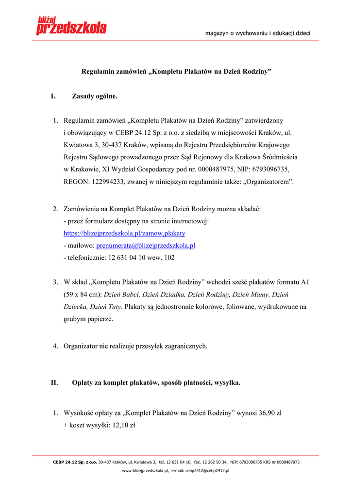 magazyn o wychowaniu i edukacji dzieci Regulamin zamówień „Kompletu Plakatów na Dzień Rodziny” I. Zasady ogólne. 1. Regulamin zamówień „Kompletu Plakatów na Dzień Rodziny” zatwierdzony i obowiązujący w CEBP 24.12 Sp. z o.o. z siedzibą w miejscowości Kraków, ul. Kwiatowa 3, 30-437 Kraków, wpisaną do Rejestru Przedsiębiorców Krajowego Rejestru Sądowego prowadzonego przez Sąd Rejonowy dla Krakowa Śródmieścia w Krakowie, XI Wydział Gospodarczy pod nr. 0000487975, NIP: 6793096735, REGON: 122994233, zwanej w niniejszym regulaminie także: „Organizatorem”. 2. Zamówienia na Komplet Plakatów na Dzień Rodziny można składać: - przez formularz dostępny na stronie internetowej: https://blizejprzedszkola.pl/zamow,plakaty - mailowo: [email protected] - telefonicznie: 12 631 04 10 wew. 102 3. W skład „Kompletu Plakatów na Dzień Rodziny” wchodzi sześć plakatów formatu A1 (59 x 84 cm): Dzień Babci, Dzień Dziadka, Dzień Rodziny, Dzień Mamy, Dzień Dziecka, Dzień Taty. Plakaty są jednostronnie kolorowe, foliowane, wydrukowane na grubym papierze. 4. Organizator nie realizuje przesyłek zagranicznych. II. Opłaty za komplet plakatów, sposób płatności, wysyłka. 1. Wysokość opłaty za „Komplet Plakatów na Dzień Rodziny” wynosi 36,90 zł + koszt wysyłki: 12,10 zł CEBP 24.12 Sp. z o.o. 30-437 Kraków, ul. Kwiatowa 3, tel. 12 631 04 10, fax. 12 262 50 34, NIP: 6793096735 KRS nr 0000487975 www.blizejprzedszkola.pl, e-mail: [email protected] magazyn o wychowaniu i edukacji dzieci 2. Jednorazowo Zamawiający może zamówić 2 „Komplety Plakatów na Dzień Rodziny” na koszt jednej przesyłki 12,10 zł. 3. Wysokość opłaty jest prezentowana w sposób jasny i precyzyjny. Organizator nie stosuje żadnych ukrytych opłat za zamówienie. 4. Składając zamówienie mailowo lub telefonicznie, należy podać dane nabywcy, dokładny adres dostawy, nazwę i ilość zamawianego produktu, oraz sposób płatności. 5. Sposób płatności: a) przedpłata na konto: wybierając ten sposób płatności, Zamawiający po złożeniu zamówienia otrzyma informację o wysokości kwoty oraz dane, na jakie należy dokonać przedpłaty za zamówienie. Po zaksięgowaniu wpłaty rozpocznie się realizacja zamówienia. b) przelew 14 dni (dotyczy tylko instytucji): przy wyborze tego sposobu płatności, komplet plakatów zostanie wysłany wraz z fakturą z 14-dniowym terminem płatności na adres podany w zamówieniu. Sposób płatności wybiera Zamawiający. 6. Przesyłki nadawane są paczką niestandardową w Poczcie Polskiej. Czas doręczenia uzależniony jest od Poczty Polskiej. III. Odstąpienie. 1. Na podstawie art. 27 Ustawy z dnia 30 maja 2014 r. o prawach konsumenta (Dz.U. 2014 poz. 827) Zamawiający będący Konsumentem ma prawo bez podawania CEBP 24.12 Sp. z o.o. 30-437 Kraków, ul. Kwiatowa 3, tel. 12 631 04 10, fax. 12 262 50 34, NIP: 6793096735 KRS nr 0000487975 www.blizejprzedszkola.pl, e-mail: [email protected] magazyn o wychowaniu i edukacji dzieci przyczyny i bez ponoszenia kosztów, z wyjątkiem kosztów określonych w ustępie 5 poniżej, odstąpić od zawartej umowy, składając Sprzedającemu oświadczenie o odstąpieniu od umowy w terminie 14 dni od daty wejścia Konsumenta w posiadanie kompletu plakatów lub w którym osoba trzecia inna niż przewoźnik i wskazana przez Konsumenta weszła w posiadanie plakatów. Po upływie tego terminu uprawnienie do odstąpienia wygasa. Do zachowania terminu na odstąpienie wystarczy wysłanie oświadczenia przed jego upływem. Oświadczenie o odstąpieniu należy kierować na adres: CEBP 24.12 Sp. z o.o., ul. Kwiatowa 3, 30-437 Kraków. Wzór oświadczenia o odstąpieniu stanowi załącznik nr 1 do niniejszego Regulaminu. 2. W przypadku odstąpienia od umowy Zamawiający powinien poinformować Organizatora o zamiarze odstąpienia drogą mailową, wskazując jednocześnie numer rachunku bankowego, na jaki po złożeniu oświadczenia winna być zwrócona cena zakupu. Brak przekazania takiej informacji nie wpływa jednak na skuteczność oświadczenia o odstąpieniu od umowy, a ma na celu jedynie przyspieszenie realizacji zwrotu. 3. Zamawiający powinien niezwłocznie odesłać doręczony mu produkt po złożeniu oświadczenia o odstąpieniu, jednak nie później niż w terminie 14 dni od dnia złożenia tego oświadczenia. Do zachowania terminu wystarczy nadanie przesyłki z produktem przed jego upływem. Jeżeli oświadczenie o odstąpieniu nie zostało złożone wcześniej, Zamawiający powinien przesłać pisemne oświadczenie o odstąpieniu od umowy wraz z produktem. 4. W przypadku skorzystania przez Zamawiającego z prawa odstąpienia od umowy, Konsument jest obowiązany odesłać towar w stanie niezmienionym, chyba że zmiana była konieczna do stwierdzenia charakteru, cech i funkcjonowania rzeczy. Zamawiający ponosi odpowiedzialność za zmniejszenie wartości rzeczy będące wynikiem korzystania z niej w sposób wykraczający poza konieczny do stwierdzenia CEBP 24.12 Sp. z o.o. 30-437 Kraków, ul. Kwiatowa 3, tel. 12 631 04 10, fax. 12 262 50 34, NIP: 6793096735 KRS nr 0000487975 www.blizejprzedszkola.pl, e-mail: [email protected] magazyn o wychowaniu i edukacji dzieci charakteru, cech i funkcjonowania rzeczy. 5. Zamawiający, korzystając z prawa odstąpienia od umowy, ponosi bezpośrednie koszty zwrotu towaru (poczta, kurier). IV. Reklamacje. 1. Organizator zobowiązany jest dostarczać produkty bez wad. 2. W przypadku gdy dostarczony produkt ma wadę podstawą rozpatrywania wszelkich reklamacji są przepisy ustawy z dnia 23 kwietnia 1964 roku Kodeks cywilny (Dz.U. 1964 Nr 16 poz. 93 z późn. zm.). 3. Reklamacje należy zgłaszać do Organizatora pisemnie na adres: CEBP 24.12 Sp. z o.o., ul. Kwiatowa 3, 30-437 Kraków lub e-mailowo na adres: [email protected]. 4. Organizator rozpoznaje reklamacje niezwłocznie, nie dłużej jednak niż w terminie 14 dni od doręczenia mu towaru. 5. Uwzględniając 