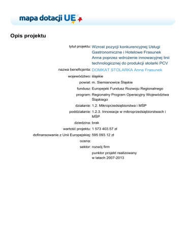 Opis projektu tytuł projektu: Wzrost pozycji konkurencyjnej Usługi Gastronomiczne i Hotelowe Frasunek Anna poprzez wdrożenie innowacyjnej linii technologicznej do produkcji stolarki PCV nazwa beneficjenta: DOMKAT STOLARKA Anna Frasunek województwo: śląskie powiat: m. Siemianowice Śląskie fundusz: Europejski Fundusz Rozwoju Regionalnego program: Regionalny Program Operacyjny Województwa Śląskiego działanie: 1.2. Mikroprzedsiębiorstwa i MŚP poddziałanie: 1.2.3. Innowacje w mikroprzedsiębiorstwach i MŚP dziedzina: brak wartość projektu: 1 573 403.57 zł dofinansowanie z Unii Europejskiej: 595 093.12 zł ocena: sektor: rozwój firm punktor projekt realizowany w latach 2007-2013