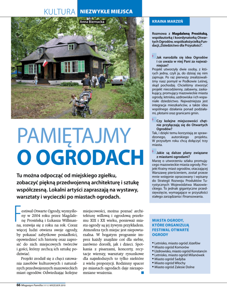 KULTURA NIEZWYKŁE MIEJSCA Anna Biernacka Kraina marzeń Rozmowa z Magdaleną Prosińską, współautorką i koordynatorką Otwartych Ogrodów, współzałożycielką Fundacji „Dziedzictwo dla Przyszłości”. ◗ Jak narodziła się idea Ogrodów i co uważa w niej Pani za najważniejsze? Projekt utworzyły dwie osoby, z których jedna, czyli ja, do dzisiaj się nim zajmuje. Po raz pierwszy zrealizowaliśmy nasz pomysł w Podkowie Leśnej, skąd pochodzę. Chcieliśmy stworzyć projekt niecodzienny, zabawny, zaskakujący, promujący mazowieckie miasta ogrody, letniska, uzdrowiska i ich wspaniałe dziedzictwo. Najważniejsza jest integracja mieszkańców, a także idea wspólnego działania ponad podziałami, płotami oraz granicami gmin. pamiętajmy o ogrodach Tu można odpocząć od miejskiego zgiełku, zobaczyć piękną przedwojenną architekturę i sztukę współczesną. Lokalni artyści zapraszają na wystawy, warsztaty i wycieczki po miastach ogrodach. F estiwal Otwarte Ogrody, wymyślony w 2004 roku przez Magdalenę Prosińską i Łukasza Willmanna, rozwija się z roku na rok. Coraz więcej ludzi otwiera swoje ogrody, by pokazać zabytkowe posiadłości, opowiedzieć ich historię oraz zaprosić do nich miejscowych twórców i gości, którzy zechcą ich sztukę podziwiać. Projekt zrodził się z chęci ratowania zasobów kulturowych i naturalnych przedwojennych mazowieckich miast ogrodów. Odwiedzając kolejne 66 Magazyn Familia (NR 8) wrzesień 2010 miejscowości, można poznać architekturę willową i ogrodową przełomu XIX i XX wieku, ponieważ miasta ogrody są jej żywym przykładem. Atmosfera tych miejsc jest niepowtarzalna. W bogatym programie imprez każdy znajdzie coś dla siebie, zarówno dorośli, jak i dzieci. Spotkania z pisarzami, koncerty, recytacje wierszy, warsztaty rysunkowe dla najmłodszych to tylko niektóre z wielu propozycji. Rodzinny spacer po miastach ogrodach daje niezapomniane wrażenia. n ◗ Czy kolejne miejscowości chęt- nie przyłączają się do Otwartych Ogrodów? Tak, i dzięki temu korzystają ze sprawdzonego, autorskiego projektu. W przyszłym roku chcą dołączyć trzy miasta. ◗ Jakie są dalsze plany związane z miastami ogrodami? Marzę o utworzeniu szlaku promującego mazowieckie miasta ogrody. Projekt Krainy miast ogrodów, otaczającej Warszawę pierścieniem, został przeze mnie wstępnie opracowany i wpisany do Strategii Rozwoju Produktów Turystycznych Województwa Mazowieckiego. To jednak gigantyczne przedsięwzięcie, wymagające w przyszłości stałego zarządzania i finansowania. Miasta ogrody, które organizują Festiwal Otwarte Ogrody • Letnisko, miasto ogród Józefów • Miasto ogród Komorów • Uzdrowisko, miasto ogród Konstancin • Letnisko, miasto ogród Milanówek • Miasto ogród Sadyba • Miasto ogród Włochy • Miasto ogród Zalesie Dolne