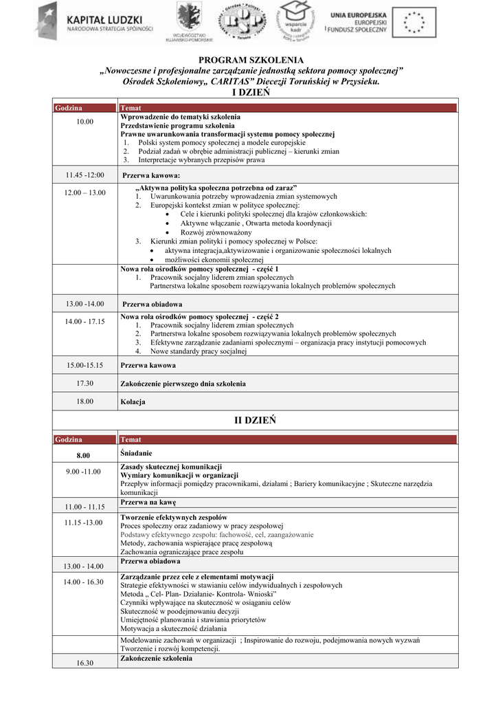 PROGRAM SZKOLENIA „Nowoczesne i profesjonalne zarządzanie jednostką sektora pomocy społecznej” Ośrodek Szkoleniowy„ CARITAS” Diecezji Toruńskiej w Przysieku. I DZIEŃ Godzina 10.00 11.45 -12:00 12.00 – 13.00 13.00 -14.00 14.00 - 17.15 15.00-15.15 Temat Wprowadzenie do tematyki szkolenia Przedstawienie programu szkolenia Prawne uwarunkowania transformacji systemu pomocy społecznej 1. Polski system pomocy społecznej a modele europejskie 2. Podział zadań w obrębie administracji publicznej – kierunki zmian 3. Interpretacje wybranych przepisów prawa Przerwa kawowa: „Aktywna polityka społeczna potrzebna od zaraz” 1. Uwarunkowania potrzeby wprowadzenia zmian systemowych 2. Europejski kontekst zmian w polityce społecznej: • Cele i kierunki polityki społecznej dla krajów członkowskich: • Aktywne włączanie , Otwarta metoda koordynacji • Rozwój zrównowaŜony 3. Kierunki zmian polityki i pomocy społecznej w Polsce: • aktywna integracja,aktywizowanie i organizowanie społeczności lokalnych • moŜliwości ekonomii społecznej Nowa rola ośrodków pomocy społecznej - część 1 1. Pracownik socjalny liderem zmian społecznych Partnerstwa lokalne sposobem rozwiązywania lokalnych problemów społecznych Przerwa obiadowa Nowa rola ośrodków pomocy społecznej - część 2 1. Pracownik socjalny liderem zmian społecznych 2. Partnerstwa lokalne sposobem rozwiązywania lokalnych problemów społecznych 3. Efektywne zarządzanie zadaniami społecznymi – organizacja pracy instytucji pomocowych 4. Nowe standardy pracy socjalnej Przerwa kawowa 17.30 Zakończenie pierwszego dnia szkolenia 18.00 Kolacja II DZIEŃ Godzina 8.00 9.00 -11.00 11.00 - 11.15 11.15 -13.00 13.00 - 14.00 14.00 - 16.30 16.30 Temat Śniadanie Zasady skutecznej komunikacji Wymiary komunikacji w organizacji Przepływ informacji pomiędzy pracownikami, działami ; Bariery komunikacyjne ; Skuteczne narzędzia komunikacji Przerwa na kawę Tworzenie efektywnych zespołów Proces społeczny oraz zadaniowy w pracy zespołowej Podstawy efektywnego zespołu: fachowość, cel, zaangaŜowanie Metody, zachowania wspierające pracę zespołową Zachowania ograniczające prace zespołu Przerwa obiadowa Zarządzanie przez cele z elementami motywacji Strategie efektywności w stawianiu celów indywidualnych i zespołowych Metoda „ Cel- Plan- Działanie- Kontrola- Wnioski” Czynniki wpływające na skuteczność w osiąganiu celów Skuteczność w poodejmowaniu decyzji Umiejętność planowania i stawiania priorytetów Motywacja a skuteczność działania Modelowanie zachowań w organizacji ; Inspirowanie do rozwoju, podejmowania nowych wyzwań Tworzenie i rozwój kompetencji. Zakończenie szkolenia