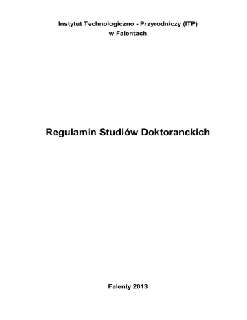 Instytut Technologiczno - Przyrodniczy (ITP) w Falentach Regulamin Studiów Doktoranckich Falenty 2013 Podstawy prawne regulaminu 1. Ustawa o instytutach badawczych z dnia 30 kwietnia 2010 r. (Dz.U. Nr 96, poz. 618) – tekst jednolity z dnia 1.01.2012 r.. 2. Ustawa o zmianie ustawy – Prawo o szkolnictwie wyŜszym, ustawy o stopniach naukowych i tytule naukowym ..., z dnia 18 marca 2011 r. (Dz.U. Nr 84, poz. 455) – tekst jednolity. 2a. Rozporządzenie MNiSW z dnia 19 lipca 2011 r. w sprawie warunków przyznawania stypendiów osobom, którym wszczęto przewód doktorski” (Dz.U. Nr 160, poz. 956). 2b. Rozporządzenie MNiSW w sprawie kształcenia na studiach w uczelniach i jednostkach naukowych z dnia 1 września 2011 r. (Dz.U. Nr 196, poz. 1169). 2c. Rozporządzenie MNiSW z dnia 22 września 2011 r. w sprawie szczegółowego trybu i warunków przeprowadzania czynności w przewodach doktorskich, w postępowaniu habilitacyjnym oraz w postępowaniu o nadanie tytułu profesora (Dz.U. Nr 204, poz. 1200). 3. Ustawa o stopniach naukowych i tytule naukowym oraz o stopniach i tytule w zakresie sztuki oraz o zmianie niektórych innych ustaw z dnia 18 marca 2011 r. (Dz.U. Nr 84, poz. 455) – tekst jednolity w brzmieniu obowiązującym od dnia 1 października 2011 r. 3a. Rozporządzenie MNiSW w sprawie studiów doktoranckich oraz stypendiów doktoranckich z dnia 5 października 2011 r. (Dz.U. Nr 225, poz. 1351). 4. Statut Instytutu Technologiczno – Przyrodniczego w Falentach. Spis treści strona Znaczenie uŜytych w regulaminie określeń ....................................................................................... 3 I. POSTANOWIENIA OGÓLNE ............................................................................................................... 4 II. KADRA I JEJ KOMPETENCJE .......................................................................................................... 6 Kierownik studiów ............................................................... 6 Wykładowcy / prowadzący zajęcia ..................................... 6 Opiekunowie naukowi ........................................................ 6 Kierownicy zespołów naukowo-badawczych ...................... 7 Rada Naukowa .................................................................. 7 Dyrektor Instytutu ............................................................... 8 Sekretariat studiów ............................................................. 8 III. ORGANIZACJA I REALIZACJA STUDIÓW ...................................................................................... 9 Organizacja zajęć .............................................................. 9 Indywidualny tok studiów .................................................. 9 Lektorat języka obcego nowoŜytnego .............................. 10 Sesja zaliczeniowo-egzaminacyjna ....................................10 Wpis warunkowy .............................................................. 11 Wznowienie studiów ......................................................... 12 Wznowienie procesu doktoryzowania .............................. 12 IV. OBOWIĄZKI I UPRAWNIENIA UCZESTNIKA STUDIÓW .................................................................12 Obowiązki uczestnika studiów .......................................... 12 Uprawnienia uczestnika studiów ....................................... 14 V. UKOŃCZENIE STUDIÓW DOKTORANCKICH ................................................................................ 16 Uwarunkowania ukończenia studiów ................................ 16 Koszty doktoryzowania ..................................................... 17 VI. POSTANOWIENIA KOŃCOWE ....................................................................................................... 17 2 Znaczenie uŜytych w regulaminie określeń (alfabetycznie): cykl studiów - czasokres trwania studiów doktoranckich, rozpoczynających się na jesieni (październik) lub na wiosnę (marzec); cykl studiów określony jest kolejnym numerem, np. SD-5; doktorant – uczestnik studiów doktoranckich; efekty kształcenia – końcowy zasób wiedzy, umiejętności i kompetencji naukowych i społecznych doktoranta, uzyskanych po ukończeniu studiów doktoranckich; uzyskanie kwalifikacji trzeciego stopnia – stopnia naukowego doktora nauk rolniczych; „Karta obiegowa” – dokument, potwierdzający zwrot przez doktoranta uŜyczonych mu przez Instytut przedmiotów i wywiązanie się przez niego z zobowiazań wobec Instytutu; „Karta przedmiotu” – dokument opracowywany przez wykładowcę / prowadzącego zajęcia, określający przede wszystkim: zakładane efekty kształcenia, formę zajęc, tryb podsumowania zajęć, wymiar godzinowy zajęć wraz z nakładem pracy doktoranta (punkty ECTS); „Karta rozprawy doktorskiej” – konspekt, dotyczący przygotowywanej przez doktoranta rozprawy doktorskiej, opracowany zgodnie z konstrukcją tej „Karty ...” (Zał. 1, 2, 3); „Karta semestralnej oceny postępów doktoranta w pracy naukowej” – sporządzony na podstawie „Karty rozprawy doktorskiej” , wykaz prac wykonanych w określonym semestrze, ich waga i ocena (Zał. 4, 5, 6); Komisja Doktorancka – komisja ds. rozpatrywania wniosków o przyznanie stypendium doktoranckiego – powołana przez Dyrektora Instytutu; Komisja Doktorska – komisja ds. przeprowadzenia przewodu doktorskiego - powołana przez Radę Naukową; Komisja Dyrekcyjna – komisja opiniująca wniosek doktoranta o wszczęcie przewodu doktorskiego - powołana przez Dyrektora Instytutu; Komisja Rekrutacyjna – komisja oceniająca kwalifikacje kandydata do podjęcia studiów doktoranckich i podejmująca decyzję w sprawie przyjęcia kandydata na studia – powołana przez Dyrektora Instytutu; otwarty charakter studiów – niesformalizowana moŜliwość uczestnictwa pracownika Instytutu w wybranych zajęciach doktoranckich, na zasadzie wolnego słuchacza; przerwanie st