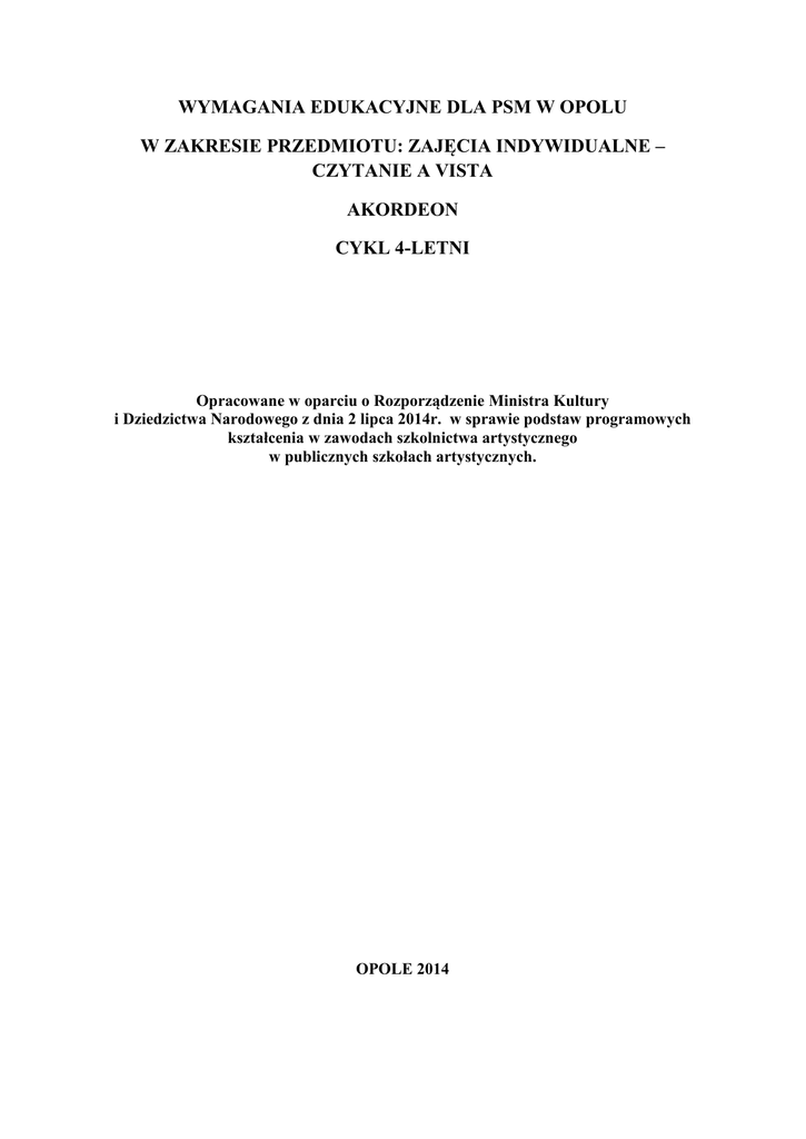 WYMAGANIA EDUKACYJNE DLA PSM W OPOLU W ZAKRESIE PRZEDMIOTU: ZAJĘCIA INDYWIDUALNE – CZYTANIE A VISTA AKORDEON CYKL 4-LETNI Opracowane w oparciu o Rozporządzenie Ministra Kultury i Dziedzictwa Narodowego z dnia 2 lipca 2014r. w sprawie podstaw programowych kształcenia w zawodach szkolnictwa artystycznego w publicznych szkołach artystycznych. OPOLE 2014 WYMAGANIA EDUKACYJNE 1. Sprawne wykonanie zapisu nutowego na instrumencie Uczeń wykonuje na instrumencie dostosowane do jego możliwości utwory muzyczne bez uprzedniego ćwiczenia. 2. Łączenie wiedzy teoretycznej z umiejętnościami praktycznymi Uczeń wykorzystuje w grze a vista podstawowe umiejętności w zakresie gry na instrumencie oraz wiedzę ogólnomuzyczną. 3. Samodzielne opracowywanie utworów Uczeń samodzielnie przygotowuje i wykonuje dostosowane do jego możliwości utwory muzyczne. 4. Rozbudzanie zainteresowania literaturą muzyczną Uczeń poznaje w sposób praktyczny literaturę muzyczną spoza bieżącego repertuaru. 5. Przygotowanie do gry zespołowej Uczeń wykorzystuje umiejętność gry a vista w pracy zespołowej. Dobierając materiał nutowy do czytania a'vista należy kierować się indywidualnym zaawansowaniem instrumentalnym ucznia w oparciu o zatwierdzony program nauczania na akordeon. Repertuar powinien obejmować 20 utworów ze wszystkich działów (etiudy, utwory polifoniczne, formy klasyczne i utwory dowolne) zawarte w programie niższym o dwie klasy w stosunku do wieku grającego, tzn. uczeń klasy V c/6 i III c/4 realizuje program klasy III c/6, uczeń klasy VI c/6 i IV c/4 – program klasy IV c/6. KRYTERIA OCENIANIA Ocena - celujący: – uczeń wykazuje umiejętności wykraczające poza program nauczania – jest indywidualnością artystyczną – uczeń potrafi wykonać tekst nutowy, bez uprzedniego przygotowania w tempie zbliżonym do tempa oznaczonego przez kompozytora Ocena - bardzo dobry: – uczeń potrafi poprawnie wykonać tekst nutowy, bez uprzedniego przygotowania, w wolnym tempie – uwzględnia charakterystyczne cechy kompozycji: metrum, tonację, charakter utworu – poprawnie odczytuje rytm – różnicuje artykulację – potrafi ogarnąć wzrokiem większe fragmenty utworu – dostrzega wskazówki wykonawcze – przestrzennie „wyczuwa'' klawiaturę bez konieczności patrzenia na nią – pracuje z zaangażowaniem Ocena - dobry: - uczeń realizuje tekst nutowy z nielicznymi błędami w wolnym tempie - potrafi ogarnąć wzrokiem krótkie fragmenty utworu - poprawnie wykonuje utwory o nielicznych problemach wykonawczych - jest zaangażowany Ocena – dostateczny: - uczeń wykonuje zapis nutowy z błędami w bardzo wolnym tempie – realizuje tylko wybrane elementy kompozycji – jest mało zaawansowany instrumentalnie, ale rokuje nadzieję na dalszy rozwój Ocena – dopuszczający: - uczeń wykazuje bardzo małe zainteresowanie przedmiotem – realizuje podstawowe elementy zapisu nutowego z licznymi błędami – nie realizuje wskazówek nauczyciela Ocena – niedostateczny: - uczeń nie nawiązuje współpracy z nauczycielem - nie rokuje nadziei na dalszy rozwój