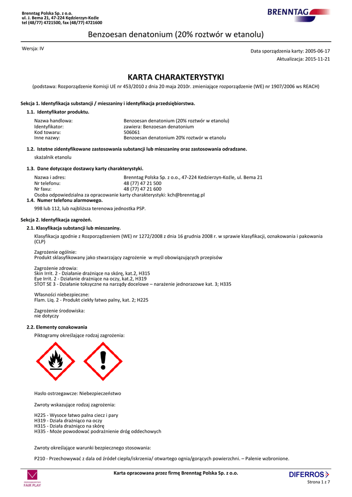 Brenntag Polska Sp. z o.o. ul. J. Bema 21, 47-224 Kędzierzyn-Koźle tel (48/77) 4721500, fax (48/77) 4721600 Benzoesan denatonium (20% roztwór w etanolu) Wersja: IV Data sporządzenia karty: 2005-06-17 Aktualizacja: 2015-11-21 KARTA CHARAKTERYSTYKI (podstawa: Rozporządzenie Komisji UE nr 453/2010 z dnia 20 maja 2010r. zmieniające rozporządzenie (WE) nr 1907/2006 ws REACH) Sekcja 1. Identyfikacja substancji / mieszaniny i identyfikacja przedsiębiorstwa. 1.1. Identyfikator produktu. Nazwa handlowa: Identyfikator: Kod towaru: Inne nazwy: Benzoesan denatonium (20% roztwór w etanolu) zawiera: Benzoesan denatonium 506061 Benzoesan denatonium 20% roztwór w etanolu 1.2. Istotne zidentyfikowane zastosowania substancji lub mieszaniny oraz zastosowania odradzane. skażalnik etanolu 1.3. Dane dotyczące dostawcy karty charakterystyki. Nazwa i adres: Brenntag Polska Sp. z o.o., 47-224 Kedzierzyn-Koźle, ul. Bema 21 Nr telefonu: 48 (77) 47 21 500 Nr faxu: 48 (77) 47 21 600 Osoba odpowiedzialna za opracowanie karty charakterystyki: [email protected] 1.4. Numer telefonu alarmowego. 998 lub 112, lub najbliższa terenowa jednostka PSP. Sekcja 2. Identyfikacja zagrożeń. 2.1. Klasyfikacja substancji lub mieszaniny. Klasyfikacja zgodnie z Rozporządzeniem (WE) nr 1272/2008 z dnia 16 grudnia 2008 r. w sprawie klasyfikacji, oznakowania i pakowania (CLP) Zagrożenie ogólnie: Produkt sklasyfikowany jako stwarzający zagrożenie w myśl obowiązujących przepisów Zagrożenie zdrowia: Skin Irrit. 2 - Działanie drażniące na skórę, kat.2, H315 Eye Irrit. 2 - Działanie drażniące na oczy, kat.2, H319 STOT SE 3 - Działanie toksyczne na narządy docelowe – narażenie jednorazowe kat. 3; H335 Własności niebezpieczne: Flam. Liq. 2 - Produkt ciekły łatwo palny, kat. 2; H225 Zagrożenie środowiska: nie dotyczy 2.2. Elementy oznakowania Piktogramy określające rodzaj zagrożenia: Hasło ostrzegawcze: Niebezpieczeństwo Zwroty wskazujące rodzaj zagrożenia: H225 - Wysoce łatwo palna ciecz i pary H319 - Działa drażniąco na oczy H315 - Działa drażniąco na skórę H335 - Może powodować podrażnienie dróg oddechowych Zwroty określające warunki bezpiecznego stosowania: P210 - Przechowywać z dala od źródeł ciepła/iskrzenia/ otwartego ognia/gorących powierzchni. – Palenie wzbronione. Karta opracowana przez firmę Brenntag Polska Sp. z o.o. Strona 1 z 7 Brenntag Polska Sp. z o.o. ul. J. Bema 21, 47-224 Kędzierzyn-Koźle tel (48/77) 4721500, fax (48/77) 4721600 Benzoesan denatonium (20% roztwór w etanolu) P233 - Przechowywać pojemnik szczelnie zamknięty P302+P352 - W przypadku kontaktu ze skórą: Umyć dużą ilością wody z mydłem. P280 - Stosować rękawice ochronne/odzież ochronną/ochronę oczu/ochronę twarzy. P305+P351+P338 - W przypadku dostania się do oczu: Ostrożnie płukać wodą przez kilka minut.Wyjąć soczewki kontaktowe, jeżeli są i można je łatwo usunąć. nadal płukać. P271 - Stosować wyłącznie na zewnątrz lub w dobrze wentylowanym pomieszczeniu. P312 - W przypadku złego samopoczucia skontaktować się z Ośrodkiem Zatruć lub z lekarzem. P405 - Przechowywać pod zamknięciem. P501 - Zawartość/pojemnik usuwać do upoważnionego odbiorcy odpadów 2.3. Inne zagrożenia. Sekcja 3. Skład / informacja o składnikach. Skład wg Rozporządzenia 1272/2008. Benzoesan denatonium 20% (Acute Tox. 4; H302, Eye Irrit. 2; H319, Skin Irrit. 2; H315, STOT SE 3; H335, CAS: 3734-33-6; WE: 223-095-2) Etanol > 80% (Flam. Liq. 2; H225, CAS: 64-17-5; WE: 200-578-6) Numer rejestracji: 01-2119457610-43-XXXX O ile wymienione są składniki niebezpieczne, znaczenie zwrotów H podane jest w p. 16 karty charakterystyki. Sekcja 4. Środki pierwszej pomocy. 4.1. Opis środków pierwszej pomocy. Wdychanie: W razie narażenia inhalacyjnego wyprowadzić poszkodowanego na świeże powietrze. Jeżeli pojawią się objawy należy skorzystać z pomocy medycznej. Kontakt ze skórą: W razie kontaktu ze skórą zdjąć przemoczoną odzież i buty, zmywać skórę dużą ilością wody, w razie potrzeby zapewnić konsultację dermatologiczną. Kontakt z oczami: W razie kontaktu z oczami przemywać je dużą ilością wody przy szeroko otwartych powiekach przez co najmniej 15 minut, w razie podrażnienia zapewnić pomoc medyczną (konsultacja okulistyczna) Spożycie: W razie spożycia nie wywoływać wymiotów jeżeli nie jest to zalecane przez personel medyczny. Nigdy nie podawać niczego doustnie osobie nieprzytomnej. W razie połkniecia dużych ilości produktu niezwłocznie wezwać lekarza. 4.2. Najważniejsze ostre i opóźnione objawy oraz skutki narażenia. 4.3. Wskazania dotyczące wszelkiej natychmiastowej pomocy lekarskiej i szczególnego postępowania z poszkodowanym. Sekcja 5. Postępowanie w przypadku pożaru. 5.1. Środki gaśnicze. piany odporne na alkohol, proszki gaśnicze, dwutlenek węgla, mgła wodna Nie stosować wody w pełnym strumieniu 5.2. Szczególne zagrożenia związane z substancją lub mieszaniną. Pary produktu mogą zbierać się w nisko położonych lub zamkniętych miejscach, przemieszczając się na znaczą odległość w kierunku źródła ognia i powodować (eksplozyjny) powrót płomienia. Opary mogą tworzyć z powietrzem mieszaninę wybuchową. Gorący pojemnik może eksplodować. Produkty spalania mogą zawierać tlenek i dwutlenek węgla, tlenki azotu. 5.3. Informacje dla straży pożarnej. Chłodzić sąsiednie pojemniki rozpylając na nie wodę z bezpiecznej odległości, o ile to możliwe, usunąć z obszru zagrożenia. Stosować niezależny aparat oddechowy oraz pełną odzież ochronną Sekcja 6. Postępowanie w przypadku niezamierzonego uwolnienia do środowiska. 6.1. Indywidualne środki ostrożności, wyposażenie ochronne i procedury w sytuacjach awaryjnych. -Rękawice ochronne -Okulary ochronne -Odzież i obuwie ochronne 6.2. Środki ostrożności w zakresie ochrony środowiska. 6.3. Metody i materiały zapobiegające rozprzestrzeniani