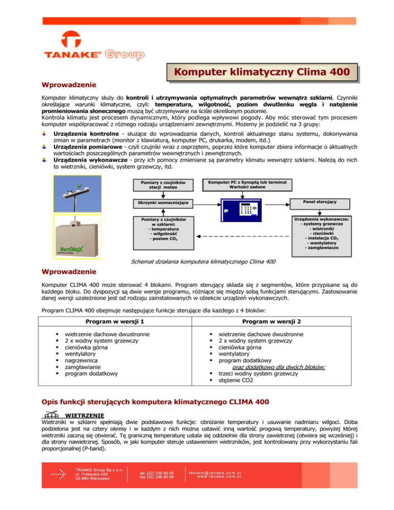 Komputer klimatyczny Clima 400 Wprowadzenie Komputer klimatyczny słuŜy do kontroli i utrzymywania optymalnych parametrów wewnątrz szklarni. Czynniki określające warunki klimatyczne, czyli: temperatura, wilgotność, poziom dwutlenku węgla i natęŜenie promieniowania słonecznego muszą być utrzymywane na ściśle określonym poziomie. Kontrola klimatu jest procesem dynamicznym, który podlega wpływowi pogody. Aby móc sterować tym procesem komputer współpracować z róŜnego rodzaju urządzeniami zewnętrznymi. MoŜemy je podzielić na 3 grupy: Urządzenia kontrolne - słuŜące do wprowadzania danych, kontroli aktualnego stanu systemu, dokonywania zmian w parametrach (monitor z klawiaturą, komputer PC, drukarka, modem, itd.) Urządzenia pomiarowe - czyli czujniki wraz z osprzętem, poprzez które komputer zbiera informacje o aktualnych wartościach poszczególnych parametrów wewnętrznych i zewnętrznych. Urządzenia wykonawcze - przy ich pomocy zmieniane są parametry klimatu wewnątrz szklarni. NaleŜą do nich to wietrzniki, cieniówki, system grzewczy, itd. Pomiary z czujników stacji meteo Komputer PC z Synoptą lub terminal Wartości zadane Panel sterujący Skrzynki wzmacniające Urządzenia wykonawcze: - systemy grzewcze - wietrzniki - cieniówki - instalacja CO2 - wentylatory - zamgławiacze Pomiary z czujników w szklarni: - temperatura - wilgotność - poziom CO2 Schemat działania komputera klimatycznego Clima 400 Wprowadzenie Komputer CLIMA 400 moŜe sterować 4 blokami. Program sterujący składa się z segmentów, które przypisane są do kaŜdego bloku. Do dyspozycji są dwie wersje programu, róŜniące się między sobą funkcjami sterującymi. Zastosowanie danej wersji uzaleŜnione jest od rodzaju zainstalowanych w obiekcie urządzeń wykonawczych. Program CLIMA 400 obejmuje następujące funkcje sterujące dla kaŜdego z 4 bloków: Program w wersji 1 wietrzenie dachowe dwustronne 2 x wodny system grzewczy cieniówka górna wentylatory nagrzewnica zamgławianie program dodatkowy Program w wersji 2 wietrzenie dachowe dwustronne 2 x wodny system grzewczy cieniówka górna wentylatory program dodatkowy oraz dodatkowo dla dwóch bloków: trzeci wodny system grzewczy stęŜenie CO2 Opis funkcji sterujących komputera klimatycznego CLIMA 400 WIETRZENIE Wietrzniki w szklarni spełniają dwie podstawowe funkcje: obniŜanie temperatury i usuwanie nadmiaru wilgoci. Doba podzielona jest na cztery okresy i w kaŜdym z nich moŜna ustawić inną wartość progową temperatury, powyŜej której wietrzniki zaczną się otwierać. Tę graniczną temperaturę ustala się oddzielnie dla strony zawietrznej (otwiera się wcześniej) i dla strony nawietrznej. Sposób, w jaki komputer steruje ustawieniem wietrzników, jest kontrolowany przy wykorzystaniu fali proporcjonalnej (P-band). SYSTEMY GRZEWCZE Kontrola systemów grzewczych odbywa się na podstawie pomiaru temperatury powietrza w szklarni. Komputer steruje temperaturą w szklarni poprzez sterowanie pracą pomp obiegowych i odpowiednie ustawienie zaworów mieszających, dodając do obiegu w zaleŜności od potrzeb większą lub mniejszą ilość ciepłej wody z pieca. W ten sposób utrzymuje wyliczoną przez siebie temperaturę rur grzewczych. W przypadku systemów ogrzewania gorącym powietrzem, komputer steruje załączaniem nagrzewnic. KOTARY (CIENIÓWKI) W komputerach serii CLIMA 400 moŜemy wyróŜnić trzy rodzaje kotar. Mogą one być stosowane jako: - osłona przed ucieczką ciepła tj. ekrany termiczne, - zabezpieczenie roślin przed nadmiernym promieniowaniem słonecznym, tj. kotary cieniujące, - narzędzie do regulacji długości dnia, tj. kotary zaciemniające. Przed zamknięciem lub otwarciem cieniówki, komputer moŜe odpowiednio zmienić parametry systemu grzewczego. W ten sposób moŜna do minimum ograniczyć wzrost temperatury po zamknięciu oraz spadek po otwarciu cieniówki. Cieniówka jest otwierana stopniowo, z moŜliwością ustalenia poszczególnych kroków i przerw między nimi. WENTYLATORY Ich włączanie moŜe być determinowane szeregiem okoliczności: - temperatura powietrza - wentylatory są włączane, jeśli zmierzona temperatura odbiega zbytnio (w górę lub w dół) od wartości zadanej dla głównego systemu grzewczego; - wilgotność - wentylatory są włączane, gdy wilgotność odbiega zbytnio od maksymalnej dopuszczalnej wartości; - cieniówki - moŜna zaprogramować włączenie wentylatorów w czasie zamykania cieniówek; - dozowanie dwutlenku węgla - moŜliwe jest włączenie wentylatorów w czasie, gdy ma miejsce dozowanie dwutlenku węgla. ZAMGŁAWIANIE (tylko w wersji 1 programu) Istnieje moŜliwość sterowania instalacją zamgławiającą (zraszającą). Sygnał do jej uruchomienia moŜe zostać podany przez komputer w przypadku zbyt niskiej wilgotności lub zbyt wysokiej temperatury. Istnieje moŜliwość ustalenia, w jakim okresie dnia ta funkcja ma być aktywna. STĘśENIE DWUTLENKU WĘGLA (tylko w wersji 2 programu) Oprogramowanie komputera CLIMA 400 pozwala na sterowanie róŜnego rodzaju systemami dozującymi dwutlenek węgla. MoŜe to być sterowanie centralne (z pieca lub z butli) lub teŜ z podziałem na poszczególne bloki (wytwornice CO2 lub zawory dozujące). W programie określa się czas dozowania i poziomy CO2 oraz ustala wpływ róŜnych czynników zewnętrznych. Oprogramowanie Synopta Do komputera CLIMA 400 dołączony jest moduł podstawowy oprogramowania Synopta, który umoŜliwia wprowadzanie i przeglądanie danych do systemu. Oprogramowanie instalowane jest na komputerze typu PC i pracuje w środowisku Windows. Synopta ma budowę modułową, dzięki czemu moŜna ją wzbogacać o kolejne funkcje, w zaleŜności od aktualnych potrzeb uŜytkownika. Poszczególne moduły rozszerzające pozwalają na gromadzenie i obróbkę duŜej ilości danych oraz tworzenie czytelnych zestawień prezentowanych w formie wykresów i tabel. Oprócz prezentacji na ekranie da