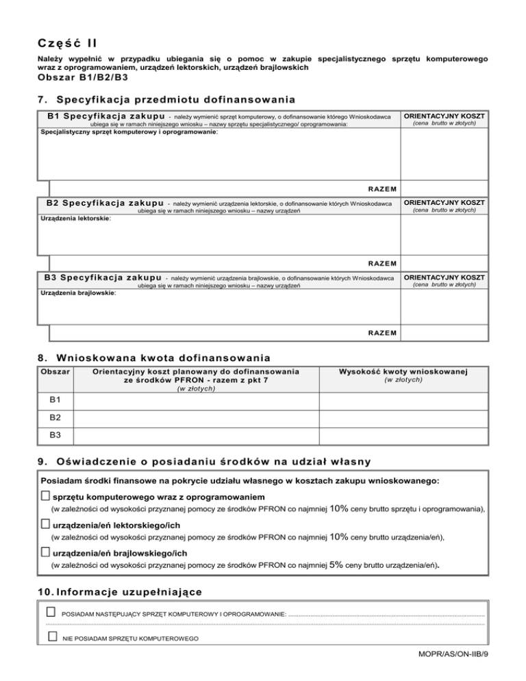Część II Należy wypełnić w przypadku ubiegania się o pomoc w zakupie specjalistycznego sprzętu komputerowego wraz z oprogramowaniem, urządzeń lektorskich, urządzeń brajlowskich Obszar B1/B2/B3 7. Specyfikacja przedmiotu dofinansow ania B1 Spec yfikacja z akupu - należy wymienić sprzęt komputerowy, o dofinansowanie którego Wnioskodawca ubiega się w ramach niniejszego wniosku – nazwy sprzętu specjalistycznego/ oprogramowania: ORIENTACYJNY KOSZT (cena brutto w złotych) Specjalistyczny sprzęt komputerowy i oprogramowanie: R AZ E M B2 Specyfikacja z akupu - należy wymienić urządzenia lektorskie, o dofinansowanie których Wnioskodawca ubiega się w ramach niniejszego wniosku – nazwy urządzeń ORIENTACYJNY KOSZT (cena brutto w złotych) Urządzenia lektorskie: R AZ E M B3 Specyfikacja z akupu - należy wymienić urządzenia brajlowskie, o dofinansowanie których Wnioskodawca ubiega się w ramach niniejszego wniosku – nazwy urządzeń ORIENTACYJNY KOSZT (cena brutto w złotych) Urządzenia brajlowskie: R AZ E M 8. Wnioskow ana kw ota dofinansow ania Obszar Orientacyjny koszt planowany do dofinansowania ze środków PFRON - razem z pkt 7 Wysokość kwoty wnioskowanej (w złotych) (w złotych) B1 B2 B3 9. Ośw iadczenie o posiadaniu śro dków na udział w łasny Posiadam środki finansowe na pokrycie udziału własnego w kosztach zakupu wnioskowanego: sprzętu komputerowego wraz z oprogramowaniem (w zależności od wysokości przyznanej pomocy ze środków PFRON co najmniej 10% ceny brutto sprzętu i oprogramowania), urządzenia/eń lektorskiego/ich (w zależności od wysokości przyznanej pomocy ze środków PFRON co najmniej 10% ceny brutto urządzenia/eń), urządzenia/eń brajlowskiego/ich (w zależności od wysokości przyznanej pomocy ze środków PFRON co najmniej 5% ceny brutto urządzenia/eń). 10. Informacje uzupełniające POSIADAM NASTĘPUJĄCY SPRZĘT KOMPUTEROWY I OPROGRAMOWANIE: .................................................................................................................... ................................................................................................................................................................................................................................................................... NIE POSIADAM SPRZĘTU KOMPUTEROWEGO MOPR/AS/ON-IIB/9 CZY WNIOSKODAWCA (LUB NA JEGO RZECZ INNA OSOBA) UZYSKAŁ WCZEŚNIEJ POMOC ZE ŚRODKÓW PFRON W ZAKUPIE SPRZĘTU KOMPUTEROWEGO i OPROGRAMOWANIA: NIE TAK w ...................... r o k u w r a m a c h .......................................................................... a t a k ż e w ...................... r o k u w r a m a c h … … … … … … … … … … … … … … … … … … … … … … … … … … … … … … … … … … . w s k a z a ć o s o b ę , k t ó r a j ą u z ys k a ł a … … … … … … … … … … … … … … … … … … … … … … … … … … … … … … … … … … … … … . 1. Oświadczam, że wszelkie dane zawarte we wniosku i załącznikach do niego są zgodne z prawdą oraz przyjmuję do wiadomości, że podanie danych niezgodnych z prawdą eliminuje wniosek z dalszego rozpatrywania. 2. Zobowiązuję się bezzwłocznie (nie później niż w terminie 7 dni od ich wystąpienia) zgłaszać Miejskiemu Ośrodkowi Pomocy Rodzinie w Białymstoku informacje o wszelkich zmianach dotyczących danych zawartych we wniosku i załącznikach do niego. 3. W ciągu 3 lat przed złożeniem niniejszego wniosku uzyskałam/em pomoc ze środków Państwowego Funduszu Rehabilitacji Osób Niepełnosprawnych na zakup specjalistycznego sprzętu komputerowego/ oprogramowania komputerowego/ urządzenia/eń lektorskiego/ich/ urządzenia/eń brajlowskiego/ich*: tak nie. 4. W ciągu 3 lat przed złożeniem niniejszego wniosku inna osoba na moją rzecz uzyskała pomoc ze środków Państwowego Funduszu Rehabilitacji Osób Niepełnosprawnych na zakup specjalistycznego sprzętu komputerowego/ oprogramowania komputerowego/ urządzenia/eń lektorskiego/ich/ urządzenia/eń brajlowskiego/ich*: tak nie. 5. W okresie wcześniejszym niż 3 lata przed złożeniem niniejszego wniosku uzyskałam/em dofinansowanie na zakup specjalistycznego sprzętu komputerowego/ oprogramowania komputerowego/ urządzenia/eń lektorskiego/ich/ urządzenia/eń brajlowskiego/ich* w ramach programów realizowanych przez Państwowy Fundusz Rehabilitacji Osób Niepełnosprawnych i zawarłam/em z Państwowym Funduszem Rehabilitacji Osób Niepełnosprawnych umowę dofinansowania, której okres obowiązywania jest dłuższy niż 3 lata i okres ten nie upłynął przed złożeniem niniejszego wniosku: tak nie. 6. W okresie wcześniejszym niż 3 lata przed złożeniem niniejszego wniosku inna osoba na moją rzecz uzyskała dofinansowanie na zakup specjalistycznego sprzętu komputerowego/ oprogramowania komputerowego/ urządzenia/eń lektorskiego/ich/ urządzenia/eń brajlowskiego/ich* w ramach programów realizowanych przez Państwowy Fundusz Rehabilitacji Osób Niepełnosprawnych i zawarła z Państwowym Funduszem Rehabilitacji Osób Niepełnosprawnych umowę dofinansowania, której okres obowiązywania jest dłuższy niż 3 lata i okres ten nie upłynął przed złożeniem niniejszego wniosku: tak nie. Wnioskodawca nie mogący pisać, lecz mogący czytać może złożyć wniosek bądź w ten sposób, że uczyni na dokumencie tuszowy odcisk palca, a obok tego odcisku inna osoba wypisze jego imię i nazwisko umieszczając swój podpis, bądź też w ten sposób, że zamiast Wnioskodawcy podpisze się inna osoba, a jej podpis będzie poświadczony przez notariusza lub wój ta (burmistrza, prezydenta miasta), starostę lub marszałka województwa z zaznaczeniem, że został złożony na życzenie nie mogącego pisać, lecz mogącego czytać. …………………………………………………………… (data i czyteln