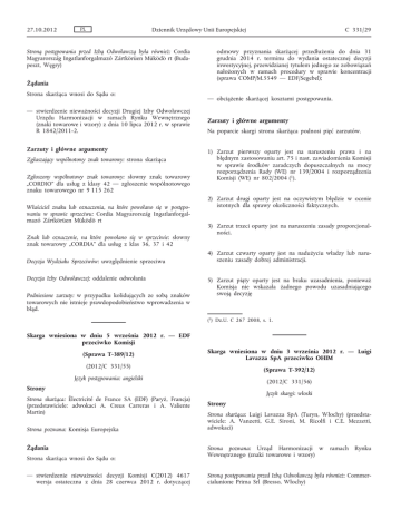 27.10.2012 PL Dziennik Urzędowy Unii Europejskiej Stroną postępowania przed Izbą Odwoławczą była również: Cordia Magyarország Ingatlanforgalmazó Zártkörüen Müködö rt (Buda peszt, Węgry) Żądania Strona skarżąca wnosi do Sądu o: — stwierdzenie nieważności decyzji Drugiej Izby Odwoławczej Urzędu Harmonizacji w ramach Rynku Wewnętrznego (znaki towarowe i wzory) z dnia 10 lipca 2012 r. w sprawie R 1842/2011-2. Zarzuty i główne argumenty Zgłaszający wspólnotowy znak towarowy: strona skarżąca Zgłoszony wspólnotowy znak towarowy: słowny znak towarowy „CORDIO” dla usług z klasy 42 — zgłoszenie wspólnotowego znaku towarowego nr 9 115 262 Właściciel znaku lub oznaczenia, na które powołano się w postępo waniu w sprawie sprzeciwu: Cordia Magyarország Ingatlanforgal mazó Zártkörüen Müködö rt Znak lub oznaczenie, na które powołano się w sprzeciwie: słowny znak towarowy „CORDIA” dla usług z klas 36, 37 i 42 Decyzja Wydziału Sprzeciwów: uwzględnienie sprzeciwu Decyzja Izby Odwoławczej: oddalenie odwołania Podniesione zarzuty: w przypadku kolidujących ze sobą znaków towarowych nie istnieje prawdopodobieństwo wprowadzenia w błąd. C 331/29 odmowy przyznania skarżącej przedłużenia do dnia 31 grudnia 2014 r. terminu do wydania ostatecznej decyzji inwestycyjnej, przewidzianej tytułem jednego ze zobowiązań nałożonych w ramach procedury w sprawie koncentracji (sprawa COMP/M.5549 — EDF/Segebel); — obciążenie skarżącej kosztami postępowania. Zarzuty i główne argumenty Na poparcie skargi strona skarżąca podnosi pięć zarzutów. 1) Zarzut pierwszy oparty jest na naruszeniu prawa i na błędnym zastosowaniu art. 75 i nast. zawiadomienia Komisji w sprawie środków zaradczych dopuszczalnych na mocy rozporządzenia Rady (WE) nr 139/2004 i rozporządzenia Komisji (WE) nr 802/2004 (1). 2) Zarzut drugi oparty jest na oczywistym błędzie w ocenie istotnych dla sprawy okoliczności faktycznych. 3) Zarzut trzeci oparty jest na naruszeniu zasady proporcjonal ności. 4) Zarzut czwarty oparty jest na nadużyciu władzy lub naru szeniu zasady dobrej administracji. 5) Zarzut piąty oparty jest na braku uzasadnienia, ponieważ Komisja nie wskazała żadnego powodu uzasadniającego swoją decyzję (1) Dz.U. C 267 2008, s. 1. Skarga wniesiona w dniu 5 września 2012 r. — EDF przeciwko Komisji (Sprawa T-389/12) Skarga wniesiona w dniu 3 września 2012 r. — Luigi Lavazza SpA przeciwko OHIM (2012/C 331/55) (Sprawa T-392/12) Język postępowania: angielski (2012/C 331/56) Strony Strona skarżąca: Électricité de France SA (EDF) (Paryż, Francja) (przedstawiciele: adwokaci A. Creus Carreras i A. Valiente Martin) Strona pozwana: Komisja Europejska Żądania Strona skarżąca wnosi do Sądu o: — stwierdzenie nieważności decyzji Komisji C(2012) 4617 wersja ostateczna z dnia 28 czerwca 2012 r. dotyczącej Język skargi: włoski Strony Strona skarżąca: Luigi Lavazza SpA (Turyn, Włochy) (przedsta wiciele: A. Vanzetti, G.E. Sironi, M. Ricolfi i C.E. Mezzetti, adwokaci) Strona pozwana: Urząd Harmonizacji w Wewnętrznego (znaki towarowe i wzory) ramach Rynku Stroną postępowania przed Izbą Odwoławczą była również: Commer cialunione Prima Srl (Bresso, Włochy)