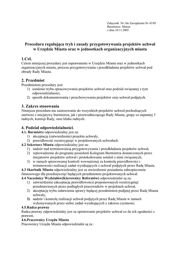 Załącznik Nr 1do Zarządzenia Nr 43/05 Burmistrza Miasta z dnia 10.11.2005 Procedura regulująca tryb i zasady przygotowywania projektów uchwał w Urzędzie Miasta oraz w jednostkach organizacyjnych miasta 1.Cel. Celem niniejszej procedury jest usprawnienie w Urzędzie Miasta oraz w jednostkach organizacyjnych miasta, procesu przygotowywania i przedkładania projektów uchwał pod obrady Rady Miasta. 2. Przedmiot Przedmiotem procedury jest: 1) ustalenie trybu opracowywania projektów uchwał oraz podział związanej z tym odpowiedzialności, 2) sposób dokumentowania i przechowywania projektów oraz uchwał podjętych. 3. Zakres stosowania Niniejsza procedura ma zastosowanie do wszystkich projektów uchwał pochodzących zarówno z inicjatywy burmistrza, jak i przewodniczącego Rady Miasta, grupy co najmniej 3 radnych, komisji Rady, oraz klubu radnych. 4. Podział odpowiedzialności. 4.1. Burmistrz odpowiedzialny jest za: 1) akceptację (zatwierdzenie) projektu uchwały, 2) prawidłowość rozstrzygnięć w projektowanych uchwałach. 4.2 Sekretarz Miasta odpowiedzialny jest za: 1) nadzór nad terminowością przygotowywania i przedkładania projektów uchwał, 2) wprowadzenie do programu posiedzeń Kolegium Burmistrza dostarczonych przez inicjatorów projektów uchwał i protokołowanie ustaleń z nimi związanych, 3) w ramach sprawowanej kontroli wewnętrznej za kontrolę prawidłowości i terminowości realizacji zadań wynikających z uchwał podjętych przez Radę Miasta. 4.3 Skarbnik Miasta odpowiedzialny jest za stwierdzenie posiadania zabezpieczenia finansowego dla przedsięwzięć będących przedmiotem projektowanych uchwał. 4.4 Naczelnicy Wydziałów(Kierownicy Referatów) odpowiedzialni są za: 1) zatwierdzenie (akceptację prawidłowości) proponowanych rozstrzygnięć przedstawionych przez podległych pracowników w projektach uchwał, 2) akceptację trybu załatwienia sprawy będącej przedmiotem podjętej przez Radę Miasta uchwały, 3) nadzór i kontrolę realizacji uchwał podjętych przez Radę Miasta w ramach wykonywanych przez siebie zadań wynikających z zakresu czynności. 4.5.Radca prawny Radca prawny odpowiedzialny jest za opiniowanie projektów uchwał co do ich zgodności z prawem. 4.6.Pracownicy Urzędu Miasta Pracownicy Urzędu Miasta odpowiedzialni są za : 1) sporządzanie projektów uchwał zgodnie z wymaganiami przepisów prawa i niniejszej procedury, 2) terminową realizację zapisów uchwał podjętych przez Radę, 3) terminowe przesyłanie uchwał do nadzoru. 5.Tryb postępowania. 5.1 Zasady opracowania projektu uchwały 1) wyznaczony przez bezpośredniego przełożonego pracownik przygotowuje projekt uchwały każdorazowo w formie odrębnego dokumentu(wzór – załącznik nr 1) 2) projekt uchwały powinien być zredagowany w sposób zwięzły, syntetyczny, przy użyciu wyrażeń w ich podstawowym znaczeniu, 3) projekt uchwały powinien zawierać co najmniej: a) oznaczenie podmiotu, z którego inicjatywy projekt powstał - w prawym górnym roku, b) tytuł uchwały (w tytule uchwały w oddzielnych wierszach umieszcza się: oznaczenie rodzaju aktu, nazwę organu wydającego uchwałę, ogólne określenie przedmiotu uchwały), c) podstawę prawną, d) treść uchwały- postanowienia merytoryczne, e) określenie źródła sfinansowania realizacji uchwały, jeżeli wywołuje skutki finansowe, f) wskazanie terminu obowiązywania lub wejścia w życie uchwały. 4) projekt uchwały powinien zawierać ponadto: a) imię i nazwisko oraz parafę osoby przygotowującej projekt, b) opinię radcy prawnego - w zakresie prawidłowości rozstrzygnięcia pod względem prawnym, c) opinię skarbnika miasta, w przypadku rozstrzygnięć powodujących skutki finansowe, d) parafę naczelnika wydziału (kierownika referatu) - akceptujących proponowane rozstrzygnięcie, jeśli autorem jest podległy pracownik. 5) osoby odpowiedzialne za wyrażenie opinii zaopatrują ją własnoręcznym podpisem, datą i pieczątką, 6) do projektu uchwały przygotowujący dołącza jej pisemne uzasadnienie, w którym wskazana jest potrzebę podjęcia tej uchwały oraz informacje o przewidywanych skutkach finansowych jej realizacji. 5.2 Zasady postępowania dotyczące zatwierdzenia oraz przekazania projektu uchwały. 1) projekty uchwał przygotowane zgodnie z zasadami zawartymi w punkcie 5.1 rejestrowane są w rejestrze prowadzonym przez sekretarza miasta, 2) po zarejestrowaniu projekty przedkładane są na posiedzenie Kolegium Burmistrza, 3) Burmistrz zapoznaje się z przedłożonymi projektami uchwał a następnie zatwierdza propozycję przedstawioną przez pracownika lub formułuje własną propozycję rozstrzygnięcia, 4) Burmistrz podpisując (akceptuje) zatwierdza projekt uchwały i uzasadnienia, bądź zwraca do wydziału (referatu) projekt do poprawy, 5) zatwierdzony (zaakceptowany) przez Burmistrza projekt uchwały wraz z uzasadnieniem przesyłany jest przez sekretarza miasta z pismem przewodnim do Przewodniczącego Rady Miasta, który kieruje go pod obrady Rady Miasta, 6) projekty uchwał dla których inicjatorem jest podmiot inny niż Burmistrz przedkładane są na ręce Przewodniczącego Rady Miasta, który przekazuje je do Burmistrza celem zaopiniowania, 7) po uzyskaniu opinii Burmistrza projekt uchwały zwracany jest przez sekretarza Przewodniczącemu Rady Miasta, 8) przed wyrażeniem swojej opinii Burmistrz zasięga opinii w szczególności radcy prawnego i skarbnika miasta. 5.3.Realizacja uchwał. 1) pracownik odpowiedzialny za przygotowanie projektu uchwały przesyła ją drogą elektroniczną do Biura Rady w ciągu trzech dni po jej przyjęciu przez Radę Miasta, 2) pracownik obsługi Biura Rady przygotowuje stosowne uchwały i przekazuje Przewodniczącemu do podpisu, 3) uchwały Rady Miasta w terminie 7-miu dni od ich podjęcia przesyłane są przez pracownika obsługi Biura Rady z pismem przewodnim podpisanym przez Burmistrza, Wojewodzie lub Regionalnej Izbie Obrachunkow
