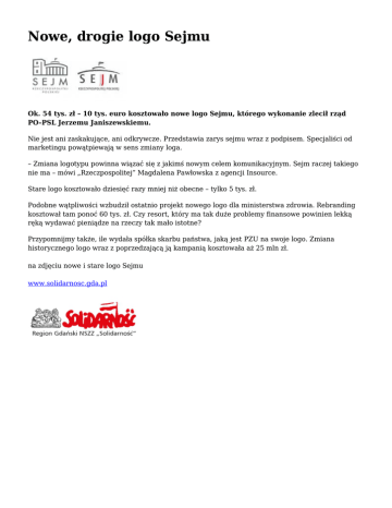 Nowe, drogie logo Sejmu Ok. 54 tys. zł – 10 tys. euro kosztowało nowe logo Sejmu, którego wykonanie zlecił rząd PO–PSL Jerzemu Janiszewskiemu. Nie jest ani zaskakujące, ani odkrywcze. Przedstawia zarys sejmu wraz z podpisem. Specjaliści od marketingu powątpiewają w sens zmiany loga. – Zmiana logotypu powinna wiązać się z jakimś nowym celem komunikacyjnym. Sejm raczej takiego nie ma – mówi „Rzeczpospolitej” Magdalena Pawłowska z agencji Insource. Stare logo kosztowało dziesięć razy mniej niż obecne – tylko 5 tys. zł. Podobne wątpliwości wzbudził ostatnio projekt nowego logo dla ministerstwa zdrowia. Rebranding kosztował tam ponoć 60 tys. zł. Czy resort, który ma tak duże problemy finansowe powinien lekką ręką wydawać pieniądze na rzeczy tak mało istotne? Przypomnijmy także, ile wydała spółka skarbu państwa, jaką jest PZU na swoje logo. Zmiana historycznego logo wraz z poprzedzającą ją kampanią kosztowała aż 25 mln zł. na zdjęciu nowe i stare logo Sejmu www.solidarnosc.gda.pl