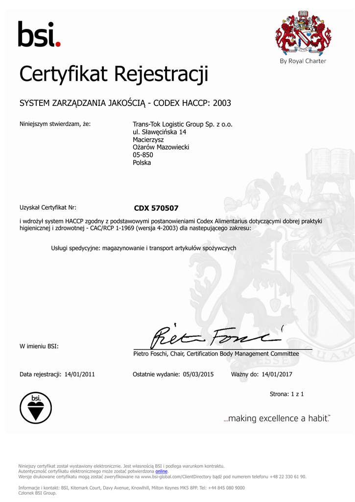 Certyfikat Rejestracji SYSTEM ZARZĄDZANIA JAKOŚCIĄ - CODEX HACCP: 2003 Niniejszym stwierdzam, że: Trans-Tok Logistic Group Sp. z o.o. ul. Sławęcińska 14 Macierzysz Ożarów Mazowiecki 05-850 Polska Uzyskał Certyfikat Nr: CDX 570507 i wdrożył system HACCP zgodny z podstawowymi postanowieniami Codex Alimentarius dotyczącymi dobrej praktyki higienicznej i zdrowotnej - CAC/RCP 1-1969 (wersja 4-2003) dla nastepującego zakresu: Usługi spedycyjne: magazynowanie i transport artykułów spożywczych W imieniu BSI: Pietro Foschi, Chair, Certification Body Management Committee Data rejestracji: 14/01/2011 Ostatnie wydanie: 05/03/2015 Ważny do: 14/01/2017 Strona: 1 z 1 Niniejszy certyfikat został wystawiony elektronicznie. Jest własnością BSI i podlega warunkom kontraktu. Autentyczność certyfikatu elektronicznego może zostać potwierdzona online. Wersje drukowane certyfikatu mogą zostać zweryfikowane na www.bsi-global.com/ClientDirectory bądź pod numerem telefonu +48 22 330 61 90. Informacje i kontakt: BSI, Kitemark Court, Davy Avenue, Knowlhill, Milton Keynes MK5 8PP. Tel: +44 845 080 9000 Członek BSI Group.