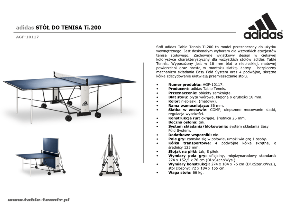 Stół adidas Table Tennis Ti.200 to model przeznaczony do użytku wewnętrznego. Jest doskonałym wyborem dla wszystkich etuzjastów tenisa stołowego. Zachowuje wyjątkowy design w ciekawej kolorystyce charakterystyczny dla wszystkich stołów adidas Table Tennis. Wyposażony jest w 16 mm blat o niebieskiej, matowej powierzchni oraz prostą w montażu siatkę. Łatwy i bezpieczny mechanizm składania Easy Fold System oraz 4 podwójne, skrętne kółka zdecydowanie ułatwiają przemieszczanie stołu. • • • • • • • • • • • • • • • • • Numer produktu: AGF-10117. Producent: adidas Table Tennis. Przeznaczenie: obiekty zamknięte. Blat stołu: płyta wiórowa, klejona o grubości 16 mm. Kolor: niebieski, (matowy). Rama wzmacniająca: 36 mm. Siatka w zestawie: COMP, ulepszone mocowanie siatki, regulacja wysokości. Konstrukcja rur: okrągłe, średnica 25 mm. Boczna osłona: tak. System składania/blokowania: system składania Easy Fold System. Dodatkowe wsporniki: nie. Pole gry: zamyka się w połowie, umożliwia grę 1 osoby. Kółka transportowe: 4 podwójne kółka skrętne, o średnicy 125 mm. Stojak na piłki: tak, 8 piłek. Wymiary pola gry: oficjalny, międzynarodowy standard: 274 x 152,5 x 76 cm (Dł.xSzer.xWys.). Wymiary konstrukcji: 274 x 184 x 76 cm (Dł.xSzer.xWys.), stół złożony: 72 x 184 x 155 cm. Waga stołu: 66 kg.