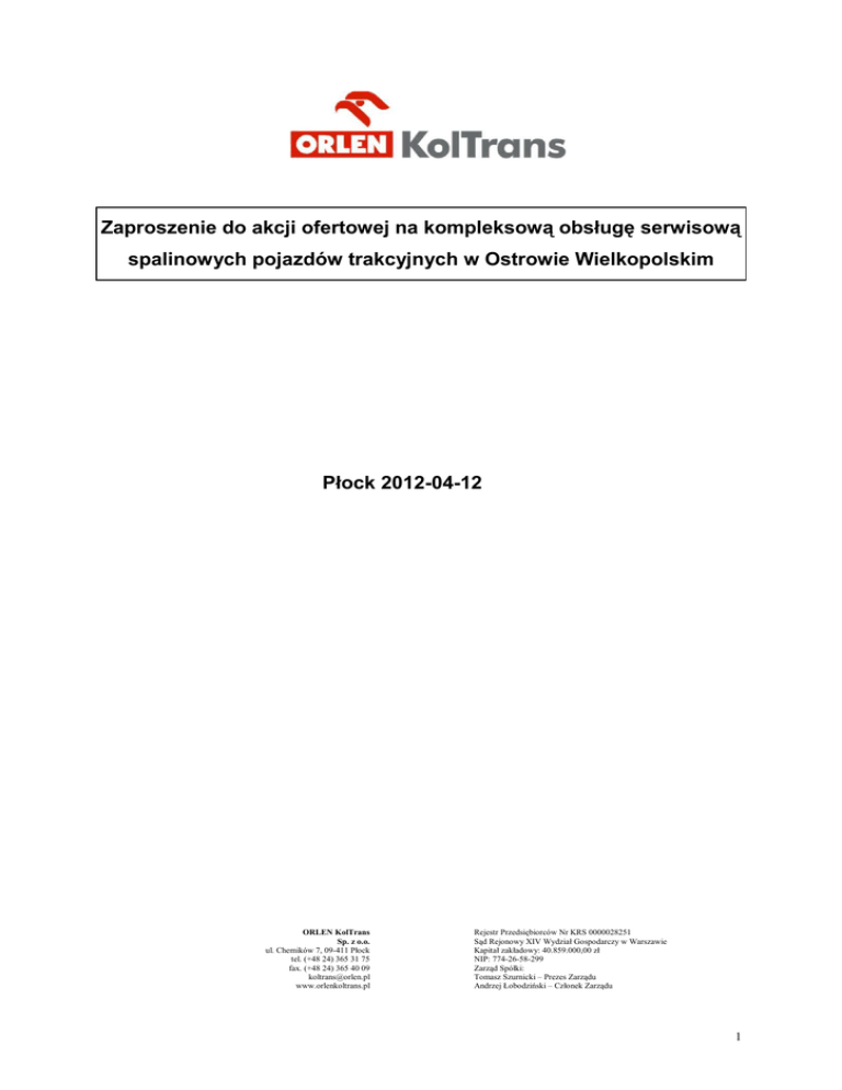 Zaproszenie do akcji ofertowej na kompleksową obsługę serwisową spalinowych pojazdów trakcyjnych w Ostrowie Wielkopolskim Płock 2012-04-12 ORLEN KolTrans Sp. z o.o. ul. Chemików 7, 09-411 Płock tel. (+48 24) 365 31 75 fax. (+48 24) 365 40 09 [email protected] www.orlenkoltrans.pl Rejestr Przedsiębiorców Nr KRS 0000028251 Sąd Rejonowy XIV Wydział Gospodarczy w Warszawie Kapitał zakładowy: 40.859.000,00 zł NIP: 774-26-58-299 Zarząd Spółki: Tomasz Szurnicki – Prezes Zarządu Andrzej Łobodziński – Członek Zarządu 1 I. Zlecający : ORLEN KolTrans Sp. z o.o. 09-411 Płock Ul. Chemików 7 NIP: 774-26-58-299 http://www.orlenkoltrans.pl, e-mail: [email protected], tel. 24 365 39 11, fax. 24 365 40 09 II. Informacje o postępowaniu ofertowym : 1. Postępowanie ofertowe prowadzone jest według wewnętrznych procedur obowiązujących w ORLEN KolTrans Sp. z o.o. 2. Dokumentacja Systemu Utrzymania lokomotyw zostanie udostępniona na wniosek oferenta po zapoznaniu się z warunkami zapytania ofertowego i ich pisemnej akceptacji. III. Przedmiot zlecenia: 1. Kompleksowa obsługa serwisowa lokomotyw obsługujących TP nr 74 PKN ORLEN S.A. w Ostrowie Wlkp. Specyfikacja pojazdów trakcyjnych: Jednostka macierzysta Typ pojazdu kolejowego Ostrów Wielkopolski M 62 Aktualny stan lokomotyw 0 TEM 2 SM 42 0 2 stałe Planowany stan lokomotyw 4 lok. (2 lok. od maja, 2 do końca roku) 2 lok. do końca roku 2 stałe (+1 do końca roku) Uwaga: liczba lokomotyw moŜe ulec zmianie! IV. Ogólne warunki realizacji usługi: 1. Wykonawca usługi zapewnia doświadczony personel posiadający kwalifikacje wymagane przy naprawach pojazdów trakcyjnych, zgodnie z DSU. 2. Wykonawca usługi zapewnia: sprzęt i narzędzia posiadające waŜne atesty, niezbędne do wykonywania prac przeglądowo-naprawczych. 3. Przedmiotowe prace naleŜy wykonywać zgodnie z Dokumentacją Systemu Utrzymania dla danego typu pojazdu kolejowego. 4. ORLEN KolTrans zapewnia części zamienne niezbędne do wykonywania napraw, materiały eksploatacyjne w postaci: oleju napędowego, silnikowego, spręŜarkowego, przekładniowego, osiowego, płynów do układu chłodzenia, płynów do spryskiwaczy szyb, wstawek hamulcowych, piasku oraz uszczelnień posiadających numery katalogowe lub indeksy. Pozostałe materiały eksploatacyjne w postaci smarów, klejów, uszczelniaczy, czyściwa, płynów do mycia pojazdów trakcyjnych zapewnia Wykonawca usługi. 5. Wykonawca usługi ma obowiązek przedstawienia zakresu prac naprawczych po ujawnieniu usterki (naprawy awaryjnej nie ujętej w cenniku) z podaniem kalkulacji na dane roboty naprawcze, określenie terminu realizacji prac, 2 gwarancji na wykonany zakres usługi oraz określenie przyczyny powstania usterki. 6. Przeglądy pojazdów trakcyjnych obejmują swoim zakresem wykonanie następujących prac, tj. sprawdzenie, legalizacja i naprawa: prędkościomierzy, urządzeń bezpieczeństwa CA, SHP i RS, manometrów oraz zaworów bezpieczeństwa, zgodnie z wymogami odpowiadającymi poszczególnym urządzeniom, przeglądy i naprawy instalacji radiowej oraz poszczególnych zespołów radiotelefonów przewoźnych. ORLEN KolTrans zapewnia wykonywanie badań doraźnych eksploatacyjnych zbiorników powietrznych zainstalowanych na pojazdach trakcyjnych. 7. Przygotowanie zbiorników spręŜonego powietrza zamontowanych na lokomotywach do badań i prób okresowych dokonywanych przez TDT wykonuje w ramach utrzymania pojazdów trakcyjnych w sprawności Wykonawca usługi (w przypadku konieczności demontaŜ/montaŜ zbiorników, badanie grubości ścian zbiornika). 8. Wykonawca usługi ma obowiązek wyznaczyć przedstawiciela, który będzie brał udział w komisjach dotyczących taboru trakcyjnego np. w przypadku komisji na okoliczność awarii lokomotyw podlegających gwarancji po naprawie okresowej w ZNTK. 9. Wykonawca usługi ma obowiązek sprawdzania podczas wykonywania przeglądów kontrolnych stanu wyposaŜenia pojazdów trakcyjnych, który musi odpowiadać wykazowi umieszonemu w kabinie maszynisty. 10. Wykonawca musi spełniać uwarunkowania prawne zgodne § 6, 7 15, Rozporządzenia Ministra Infrastruktury – Dz. U. 05.212.1771 z dnia 28 października 2005 r. z późniejszymi zmianami obowiązują Wykonawców usługi. IV. Kryteria wyboru ofert. 1. Ceny netto za poszczególne poziomy utrzymania i naprawy awaryjne. 2. Posiadane zaplecze techniczne w pobliŜu TP nr 74 PKN ORLEN S.A. w Ostrowie Wlkp. (kanał rewizyjny, suwnica, podnośniki np. typu Kutrufa, tor postojowy min. 100m). 3. Wykaz doświadczeń i referencje z zakresu wykonywania przeglądów okresowych, serwisu i napraw lokomotyw spalinowych typu: SM42, TEM-2 i M62. V. Treść składanych ofert i wymagane dokumenty. Warunkiem przyjęcia oferty jest przedłoŜenie wraz z ofertą niŜej wymienionych danych i dokumentów: 1. Nazwa firmy, adres, telefon kontaktowy, fax. 2. Nazwiska osób reprezentujących firmę. Odpis z Krajowego Rejestru Sądowego, w przypadku spółek Prawa Handlowego, lub zaświadczenie o wpisie do ewidencji działalności gospodarczej w przypadku osób fizycznych. 3. Decyzja w sprawie nadania nr Identyfikacji Podatkowej NIP. VI. Oferta winna zawierać. Część techniczna: 1. Długość okresów gwarancyjnych na naprawy awaryjne (min. 3 miesiące). 2. Dokumenty potwierdzające wiarygodność oferenta wskazane w pkt. V. 3. Wskazanie osoby do kontaktu. 3 4. Termin waŜności oferty (od 01.05.2012 do 30.04.2013). 5. Dyspozycyjność 24h / 365 dni w roku. 6. Oświadczenie oferentów – załącznik nr 1. Część cenowa: 1. Wypełniony cennik w formie elektronicznej dołączony do oferty, stanowiący Załącznik nr 2 do niniejszego zapytania. 2. Deklarację niezmienności cen w trakcie trwania umowy tj. od 01.05.2012 do 30.04.2013. 3. Sposób rozliczenia – z uwzględnieniem 45 dniowego terminu płatności faktur licząc od dnia otrzymania faktury. Pytania dodatkowe dotyczące zakresu ogłoszonej akcji ofertowej prosimy przesyła