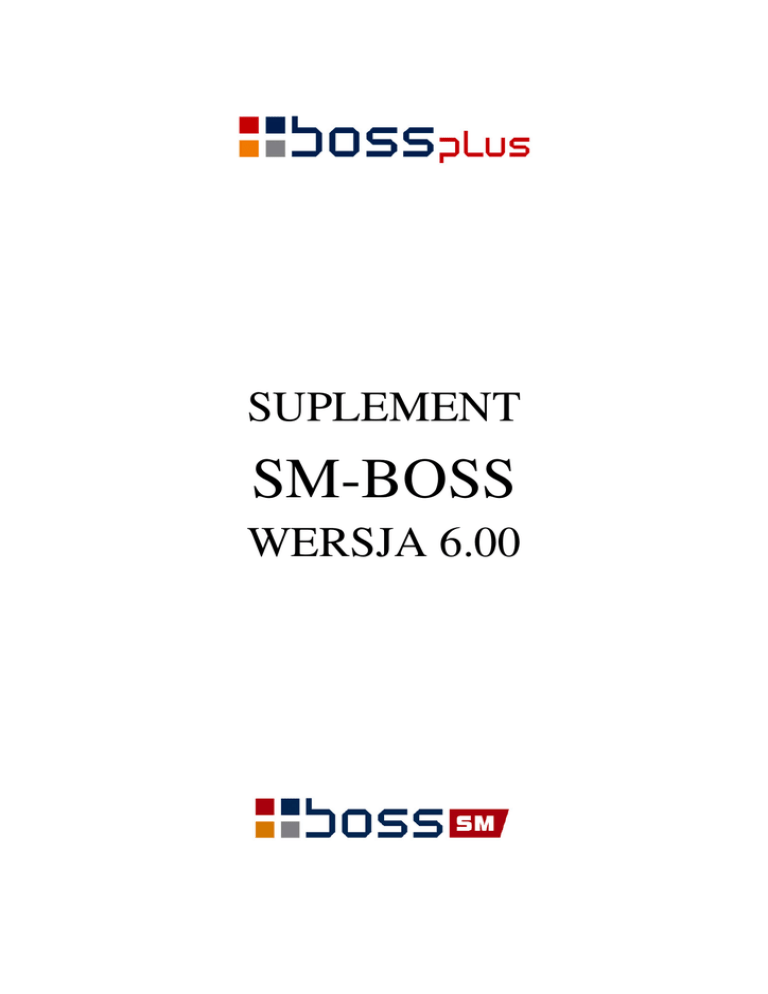 SUPLEMENT SM-BOSS WERSJA 6.00 SPIS TRE CI Wst p ......................................................................................................................................... 3 ZATRUDNIENIE..................................................................................................................... 4 FP, FG P – zmiany ................................................................................................................ 4 Nazwa zbioru z wydrukiem definiowanym ........................................................................... 6 Urlop bezpłatny niesta owy ................................................................................................... 6 Generowanie kalendarza dla wszystkich grup ....................................................................... 6 wiadectwo pracy .................................................................................................................. 6 Mo liwo definiowania stawek dla umów zlece i umów o dzieło z poziomu kadr ........... 7 Ekwiwalent za urlop............................................................................................................... 7 PIT-8AR ................................................................................................................................. 7 Sposób liczenia dodatku sta owego ....................................................................................... 7 Przypisanie do pracownika wysoko ci składek ZUS............................................................. 8 Mo liwo definiowania stawek dla umów zlece i umów o dzieło z poziomu Kadr .......... 8 Przekroczenie rocznej podstawy wymiaru składek................................................................ 9 ZAKUP/SPRZEDA ............................................................................................................. 10 Korekta do kilku faktur ........................................................................................................ 10 Wydruki definiowane – modyfikacja................................................................................... 11 Zestawienie wg grup sprzeda y ........................................................................................... 12 Zmiany na formularzu WZ z faktury ................................................................................... 12 Cena netto i brutto na formularzu faktury............................................................................ 12 KASA / BANK / ROZRACHUNKI ...................................................................................... 13 Zmiana w menu .................................................................................................................... 13 Sugeruj płatno ci do dnia ..................................................................................................... 13 Automatyczne generowanie not odsetkowych ..................................................................... 14 Emisja ponagle do zapłaty.................................................................................................. 14 Wyszukiwanie dowodów w ewidencji dowodów ................................................................ 15 Ewidencja tabeli słownikowej rachunków kontrahentów. ................................................... 15 Obsługa pola tre ................................................................................................................ 16 Odtwarzanie idobrot na bazie archiwów .............................................................................. 16 Wydruk z ewidencji kas ....................................................................................................... 16 Wydruk z ewidencji banków................................................................................................ 17 Data i godzina na ko cu raportu z kasy ............................................................................... 17 PRODUKCJA......................................................................................................................... 18 Zlecenia produkcyjne - zmiana widoku ............................................................................... 18 Wydruk zlecenia z nr technologii......................................................................................... 18 Wska nik migotania............................................................................................................. 18 Magazyn wyrobów gotowych w Technologii...................................................................... 19 Zbiorcze generowanie dokumentów PW ............................................................................. 19 Rozszerzenie wydruku z ewidencji raportów....................................................................... 19 Zmiany w uprawnieniach ..................................................................................................... 19 Wydruk kontrolny dokumentów magazynowych ................................................................ 20 FINANSE ................................................................................................................................ 21 Przedłu enie pola podpozycji do 4 znaków ......................................................................... 21 Konto przeciwstawne ........................................................................................................... 21 SM-BOSS ................................................................................................................................ 21 Miasto, gmina, powiat i województwo du ymi literami ...................................................... 21 2 Wst p Przekazujemy Pa stwu wersj 6.00 systemu SM-BOSS. Wprowadzili my w niej wiele zmian rozszerzaj cych funkcjonalno systemu. Zmiany zostały opisane w niniejszym suplemencie do instrukcji. Prosimy o zapoznanie si z jego tre ci przed wykonaniem upgrade’u i przed rozpocz ciem