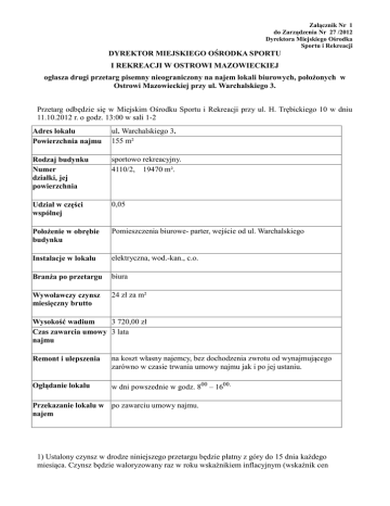 Załącznik Nr 1 do Zarządzenia Nr 27 /2012 Dyrektora Miejskiego Ośrodka Sportu i Rekreacji DYREKTOR MIEJSKIEGO OŚRODKA SPORTU I REKREACJI W OSTROWI MAZOWIECKIEJ ogłasza drugi przetarg pisemny nieograniczony na najem lokali biurowych, położonych w Ostrowi Mazowieckiej przy ul. Warchalskiego 3. Przetarg odbędzie się w Miejskim Ośrodku Sportu i Rekreacji przy ul. H. Trębickiego 10 w dniu 11.10.2012 r. o godz. 13:00 w sali 1-2 Adres lokalu Powierzchnia najmu ul. Warchalskiego 3. 155 m² Rodzaj budynku Numer działki, jej powierzchnia sportowo rekreacyjny. 4110/2, 19470 m². Udział w części wspólnej 0,05 Położenie w obrębie budynku Pomieszczenia biurowe- parter, wejście od ul. Warchalskiego Instalacje w lokalu elektryczna, wod.-kan., c.o. Branża po przetargu biura Wywoławczy czynsz miesięczny brutto 24 zł za m² 3 720,00 zł Wysokość wadium Czas zawarcia umowy 3 lata najmu Remont i ulepszenia na koszt własny najemcy, bez dochodzenia zwrotu od wynajmującego zarówno w czasie trwania umowy najmu jak i po jej ustaniu. Oglądanie lokalu w dni powszednie w godz. 800 – 1600. Przekazanie lokalu w po zawarciu umowy najmu. najem 1) Ustalony czynsz w drodze niniejszego przetargu będzie płatny z góry do 15 dnia każdego miesiąca. Czynsz będzie waloryzowany raz w roku wskaźnikiem inflacyjnym (wskaźnik cen towarów i usług konsumpcyjnych ogłaszany przez Prezesa Głównego Urzędu Statystycznego). 2) Najemca oprócz czynszu (wysokość ustalona w drodze przetargu ) zobowiązany będzie do pokrycia: a) opłat dodatkowych, które ulegną zmianie w przypadku zmiany stawek obecnie obowiązujących o procentowy wzrost stawek nowo przyjętych: b) opłat za energię elektryczną wg wskazań odczytu zainstalowanego podlicznika c) opłat za wodę, ścieki. i wywóz nieczystości stałych – 170 zł/mc d) opłat za c.o. – 291,40 zł/mc e) podatku od nieruchomości za 155 m2 budynku oraz za 973,5 m2 gruntu wg stawek określonych przez Radę Miasta. 3) Wszelkie ewentualne prace remontowe, przebudowy lub inne ulepszenia projektowane w lokalu wymagają każdorazowo pisemnej zgody Wynajmującego. 4) Oferent może złożyć tylko jedną ofertę. W przypadku złożenia więcej niż jednej oferty przez tego samego oferenta komisja odrzuci jego wszystkie oferty. 5) Pisemne oferty, w zamkniętych kopertach z dopiskiem „Oferta MOSiR Warchalskiego biura parter ” należy składać w terminie do 10.10.2012 roku w Miejskim Ośrodku Sportu i Rekreacji ul. H. Trębickiego 10, pokój nr 1-6 do godz. 16:00. 6) Pisemne oferty powinny być złożone na formularzu ofertowym (załącznik nr 1do ogłoszenia ) do pobrania w siedzibie MOSiR przy ul.H.Trębickiego10 sekretariat pok 1-6 lub na stronie internetowej MOSiR i zawierać: imię, nazwisko i adres oferenta lub nazwę firmy oraz siedzibę, jeżeli oferentem jest osoba prawna lub inny podmiot, datę sporządzenia oferty, oferowaną stawkę czynszu, oświadczenie, że oferent zapoznał się z warunkami przetargu i przyjmuje je bez zastrzeżeń(załącznik nr 2 do ogłoszenia do pobrania w siedzibię MOSiR przy ul. H.Trębickiego 10 sekretariat pokój 1-6 lub na stronie internetowej MOSiR) 7) Do oferty winien być załączony dowód wpłaty wadium. 8) Oferty będą podlegały ocenie przez komisję przetargową w zakresie proponowanej stawki czynszu. Wybrana zostanie oferta, w której zostanie zaproponowana największa stawka czynszu. W przypadku gdy zostaną złożone dwie lub więcej ofert z zaproponowaną taką samą stawką zamawiający uruchomi dodatkowe procedury w celu wyłonienia najkorzystniejszej oferty. 9) Zainteresowane osoby winny wpłacić wadium w terminie do dnia 10.10.2012 roku gotówką bezpośrednio do kasy MOSiR lub na konto BS Ostrów Mazowiecka nr 87 8923 0008 0016 7976 2000 0102 . Za datę wniesienia wadium uważa się dzień jego wpływu na wyżej wskazany rachunek. 10) Wygrywający przetarg zobowiązany jest do podpisania umowy najmu najpóźniej w terminie 14 dni od daty rozstrzygnięcia przetargu pod rygorem utraty praw do lokalu oraz wpłaconego wadium. 11) Wygrywający przetarg przed podpisaniem umowy najmu ustanawia zabezpieczenie należności najemcy względem wynajmującego związanych ze stosunkiem najmu (w wysokości miesięcznego czynszu brutto ) w formie kaucji pieniężnej. 12) Wpłacone wadium zostanie: zaliczone na poczet czynszu, jeżeli oferent wygra przetarg, zwrócone w ciągu 3 dni, jeżeli oferent nie wygra przetargu. 13) Dyrektorowi Miejskiego Ośrodka Sportu i Rekreacji przysługuje prawo zamknięcia przetargu bez wybrania którejkolwiek z ofert. Wszelkich informacji: - o lokalu udziela Andrzej Pasztaleniec bezpośrednio w siedzibie Miejskiego Ośrodka Sportu i Rekreacji przy ul. Warchalskiego 3 lub telefonicznie 500 014 251 w godz 8:00 do 16:00. - o procedurze przetargowej udziela Anna Kordek bezpośrednio w siedzibie Miejskiego Ośrodka Sportu i Rekreacji przy ul. H. Trębickiego 10 lub telefonicznie 0-29 645 21 56 w godz od 8:00 do 16:00.