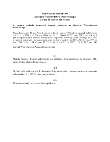 Uchwała Nr 196/181/05 Zarządu Województwa Pomorskiego z dnia 15 marca 2005 roku w sprawie nadania numeracji drogom gminnym na obszarze Województwa Pomorskiego. Na podstawie art. 10 ust. 7 pkt 2 ustawy z dnia 21 marca 1985 roku o drogach publicznych (t.j. Dz. U. z 2004 r. Nr 204 poz. 2086, zm. Dz.U. z 2004 r. Nr 273, poz. 2703) oraz § 4 ust.1 pkt 4 rozporządzenia Ministra Transportu i Gospodarki Morskiej z dnia 28 lutego 2000 roku w sprawie numeracji i ewidencji dróg oraz obiektów mostowych (Dz.U. Nr 32, poz. 393, ze zm.: z 2001 r. Dz. U. Nr 69, poz. 72, Dz.U. Nr 25, poz. 253; z 2003 r.: Dz. U. Nr 5, poz. 54) Zarząd Województwa Pomorskiego uchwala: §1 Nadaje numery drogom zaliczonym do kategorii dróg gminnych na obszarze 116. gmin Województwa Pomorskiego. §2 Wykaz dróg zaliczonych do kategorii dróg gminnych z nadaną numeracją stanowią załączniki nr 1 – 116 do niniejszej uchwały. §3 Uchwała wchodzi w życie z dniem podjęcia. Uzasadnienie. Zgodnie z przepisami ustawy z dnia 21 marca 1985 roku o drogach publicznych Zarząd Województwa nadaje numery drogom gminnym, po zaliczeniu ich do kategorii dróg gminnych. Numer drogi gminnej składa się z liczby sześciocyfrowej oraz wyróżnika literowego województwa określonego w przepisach ustawy Prawo o ruchu drogowym. Dla Województwa Pomorskiego wyróżnikiem literowym jest litera „G”. Dokonano uzgodnień z zarządcami dróg gminnych w 116. gminach województwa oraz uzyskano akceptację do zaproponowanej numeracji dróg i ulic gminnych.