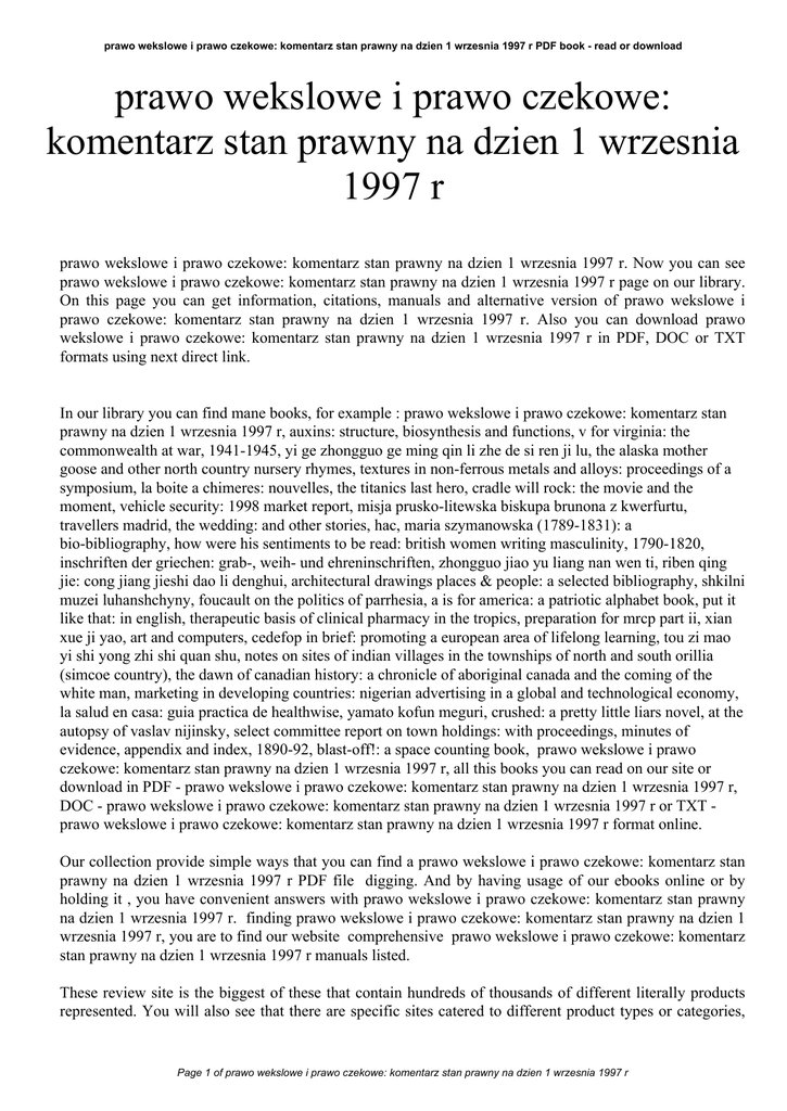 prawo wekslowe i prawo czekowe: komentarz stan prawny na dzien 1 wrzesnia 1997 r PDF book - read or download prawo wekslowe i prawo czekowe: komentarz stan prawny na dzien 1 wrzesnia 1997 r prawo wekslowe i prawo czekowe: komentarz stan prawny na dzien 1 wrzesnia 1997 r. Now you can see prawo wekslowe i prawo czekowe: komentarz stan prawny na dzien 1 wrzesnia 1997 r page on our library. On this page you can get information, citations, manuals and alternative version of prawo wekslowe i prawo czekowe: komentarz stan prawny na dzien 1 wrzesnia 1997 r. Also you can download prawo wekslowe i prawo czekowe: komentarz stan prawny na dzien 1 wrzesnia 1997 r in PDF, DOC or TXT formats using next direct link. In our library you can find mane books, for example : prawo wekslowe i prawo czekowe: komentarz stan prawny na dzien 1 wrzesnia 1997 r, auxins: structure, biosynthesis and functions, v for virginia: the commonwealth at war, 1941-1945, yi ge zhongguo ge ming qin li zhe de si ren ji lu, the alaska mother goose and other north country nursery rhymes, textures in non-ferrous metals and alloys: proceedings of a symposium, la boite a chimeres: nouvelles, the titanics last hero, cradle will rock: the movie and the moment, vehicle security: 1998 market report, misja prusko-litewska biskupa brunona z kwerfurtu, travellers madrid, the wedding: and other stories, hac, maria szymanowska (1789-1831): a bio-bibliography, how were his sentiments to be read: british women writing masculinity, 1790-1820, inschriften der griechen: grab-, weih- und ehreninschriften, zhongguo jiao yu liang nan wen ti, riben qing jie: cong jiang jieshi dao li denghui, architectural drawings places & people: a selected bibliography, shkilni muzei luhanshchyny, foucault on the politics of parrhesia, a is for america: a patriotic alphabet book, put it like that: in english, therapeutic basis of clinical pharmacy in the tropics, preparation for mrcp part ii, xian xue ji yao, art and computers, cedefop in brief: promoting a european area of lifelong learning, tou zi mao yi shi yong zhi shi quan shu, notes on sites of indian villages in the townships of north and south orillia (simcoe country), the dawn of canadian history: a chronicle of aboriginal canada and the coming of the white man, marketing in developing countries: nigerian advertising in a global and technological economy, la salud en casa: guia practica de healthwise, yamato kofun meguri, crushed: a pretty little liars novel, at the autopsy of vaslav nijinsky, select committee report on town holdings: with proceedings, minutes of evidence, appendix and index, 1890-92, blast-off!: a space counting book, prawo wekslowe i prawo czekowe: komentarz stan prawny na dzien 1 wrzesnia 1997 r, all this books you can read on our site or download in PDF - prawo wekslowe i prawo czekowe: komentarz stan prawny na dzien 1 wrzesnia 1997 r, DOC - prawo wekslowe i prawo czekowe: komentarz stan prawny na dzien 1 wrzesnia 1997 r or TXT prawo wekslowe i prawo czekowe: komentarz stan prawny na dzien 1 wrzesnia 1997 r format online. Our collection provide simple ways that you can find a prawo wekslowe i prawo czekowe: komentarz stan prawny na dzien 1 wrzesnia 1997 r PDF file digging. And by having usage of our ebooks online or by holding it , you have convenient answers with prawo wekslowe i prawo czekowe: komentarz stan prawny na dzien 1 wrzesnia 1997 r. finding prawo wekslowe i prawo czekowe: komentarz stan prawny na dzien 1 wrzesnia 1997 r, you are to find our website comprehensive prawo wekslowe i prawo czekowe: komentarz stan prawny na dzien 1 wrzesnia 1997 r manuals listed. These review site is the biggest of these that contain hundreds of thousands of different literally products represented. You will also see that there are specific sites catered to different product types or categories, Page 1 of prawo wekslowe i prawo czekowe: komentarz stan prawny na dzien 1 wrzesnia 1997 r prawo wekslowe i prawo czekowe: komentarz stan prawny na dzien 1 wrzesnia 1997 r PDF book - read or download niche categories or brands related with prawo wekslowe i prawo czekowe: komentarz stan prawny na dzien 1 wrzesnia 1997 r. So depending on just what you are searching, you will be able to choose ebooks prawo wekslowe i prawo czekowe: komentarz stan prawny na dzien 1 wrzesnia 1997 r to fit your own needs, prawo wekslowe i prawo czekowe: komentarz stan prawny na dzien 1 wrzesnia 1997 r. Page 2 of prawo wekslowe i prawo czekowe: komentarz stan prawny na dzien 1 wrzesnia 1997 r