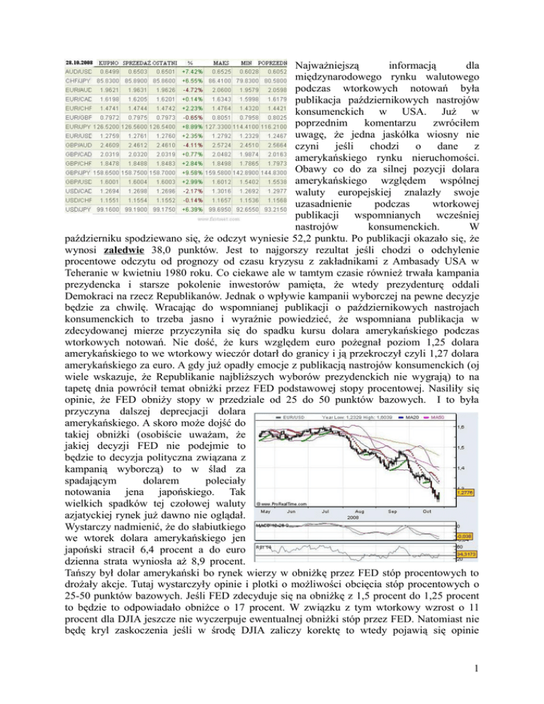 Najważniejszą informacją dla międzynarodowego rynku walutowego podczas wtorkowych notowań była publikacja październikowych nastrojów konsumenckich w USA. Już w poprzednim komentarzu zwróciłem uwagę, że jedna jaskółka wiosny nie czyni jeśli chodzi o dane z amerykańskiego rynku nieruchomości. Obawy co do za silnej pozycji dolara amerykańskiego względem wspólnej waluty europejskiej znalazły swoje uzasadnienie podczas wtorkowej publikacji wspomnianych wcześniej nastrojów konsumenckich. W październiku spodziewano się, że odczyt wyniesie 52,2 punktu. Po publikacji okazało się, że wynosi zaledwie 38,0 punktów. Jest to najgorszy rezultat jeśli chodzi o odchylenie procentowe odczytu od prognozy od czasu kryzysu z zakładnikami z Ambasady USA w Teheranie w kwietniu 1980 roku. Co ciekawe ale w tamtym czasie również trwała kampania prezydencka i starsze pokolenie inwestorów pamięta, że wtedy prezydenturę oddali Demokraci na rzecz Republikanów. Jednak o wpływie kampanii wyborczej na pewne decyzje będzie za chwilę. Wracając do wspomnianej publikacji o październikowych nastrojach konsumenckich to trzeba jasno i wyraźnie powiedzieć, że wspomniana publikacja w zdecydowanej mierze przyczyniła się do spadku kursu dolara amerykańskiego podczas wtorkowych notowań. Nie dość, że kurs względem euro pożegnał poziom 1,25 dolara amerykańskiego to we wtorkowy wieczór dotarł do granicy i ją przekroczył czyli 1,27 dolara amerykańskiego za euro. A gdy już opadły emocje z publikacją nastrojów konsumenckich (oj wiele wskazuje, że Republikanie najbliższych wyborów prezydenckich nie wygrają) to na tapetę dnia powrócił temat obniżki przez FED podstawowej stopy procentowej. Nasiliły się opinie, że FED obniży stopy w przedziale od 25 do 50 punktów bazowych. I to była przyczyna dalszej deprecjacji dolara amerykańskiego. A skoro może dojść do takiej obniżki (osobiście uważam, że jakiej decyzji FED nie podejmie to będzie to decyzja polityczna związana z kampanią wyborczą) to w ślad za spadającym dolarem poleciały notowania jena japońskiego. Tak wielkich spadków tej czołowej waluty azjatyckiej rynek już dawno nie oglądał. Wystarczy nadmienić, że do słabiutkiego we wtorek dolara amerykańskiego jen japoński stracił 6,4 procent a do euro dzienna strata wyniosła aż 8,9 procent. Tańszy był dolar amerykański bo rynek wierzy w obniżkę przez FED stóp procentowych to drożały akcje. Tutaj wystarczyły opinie i plotki o możliwości obcięcia stóp procentowych o 25-50 punktów bazowych. Jeśli FED zdecyduje się na obniżkę z 1,5 procent do 1,25 procent to będzie to odpowiadało obniżce o 17 procent. W związku z tym wtorkowy wzrost o 11 procent dla DJIA jeszcze nie wyczerpuje ewentualnej obniżki stóp przez FED. Natomiast nie będę kryl zaskoczenia jeśli w środę DJIA zaliczy korektę to wtedy pojawią się opinie 1 "mistrzów świata", że ewentualna obniżka została zdyskontowana przez rynek. Nie ulega wątpliwości, że wtorkowy ruch na rynku walutowym to była zasługa złych danych o nastrojach konsumenckich w USA oraz możliwości obniżenia przez FED podstawowej stopy procent. W ostatnim czasie kurs waluty amerykańskiej był zbyt silny w relacji do głównych walut a informacje o napływie środków do baków amerykańskich nieco inaczej wyglądają ze strony ostatnich doniesień z Polski. Otóż wtorek na polskim rynku walutowym pokazał po pierwsze, że warto czasami zajrzeć do tabeli ze wskaźnikami technicznymi. Również pokazał, że nie warto bezgranicznie wierzyć w raporty i opracowania sporządzane przez niektórych analityków. Szczególnie takich którzy nie rozumieją różnicy między słowem „pomyłka” a słowem „oszustwo”. W końcu wydało się skąd pojawiło się w końcówce ubiegłego tygodnia nieuzasadnione osłabianie złotego. Jeden z banków za pośrednictwem swoich analityków zaprezentował raport gospodarczy daleko odbiegający od rzeczywistości gospodarczej Polski. Efekt był taki, że inwestorzy po lekturze tego dzieła przystąpili gremialnie do sprzedawania złotego oraz polskich akcji. Specjalnie nie podaję nazwy tego banku bo wychodzę z założenia, że pomyłka jest rzeczą ludzką. W ostatnich latach mieliśmy już sławny raport o cenach miedzi, które miały zanotować 40 procentowy spadek a zanotowały wzrost. Teraz mamy pomylony z rzeczywistością raport gospodarczy. Przyjmijmy zasadę, że do trzech razy sztuka i za trzecim razem oszustów należy podawać z imienia i nazwiska. A wracając do spraw związanych z tabelką w której od pewnego czasu prezentuję wybrane wskaźniki techniczne dla wybranych relacji walut. Jeszcze wczoraj sygnalizowałem, że w relacji z niektórymi walutami złoty polski jest na zbyt słabym poziomie. Sugerowałem również, że do odreagowania może dojść w każdej chwili. I właśnie podczas wtorkowych notowań doszło do takiego odreagowania. Nie bez przyczyny złoty polski zyskał ponad 6 procent do dolara amerykańskiego oraz po prawie 4 procent do euro i dolara kanadyjskiego. Również zysk dzienny złotego względem franka szwajcarskiego ( oj cieszy to posiadaczy kredytów hipotecznych nominowanych w tej walucie) wyniósł ponad 6 procent. Zamiast wierzyć w nieprofesjonalnie sporządzane raporty gospodarcze czasami lepiej poczytać co to jest wskaźnik bezrobocia i sprzedaż detaliczna. A wtedy można spokojnie przyjmować pewne zmiany na rynku walutowym. Nawet na takim rynku jak polski. Nie będzie tajemnicą, że druga połowa tygodnia powinna przynieść kolejne umocnienie polskiej waluty. Z drugiej strony ma ona co odrabiać. Najważniejsze aby zmiany dzienne zaczęły zawierać się w skali jednego do dwóch procent. Wtedy będzie można powiedzieć, że na rynek wraca normalność. AF www.waluty.com AF® Treść powyższej analizy jest tylko i wyłącznie wyrazem osobistych poglądów jej autora i nie stanowi
