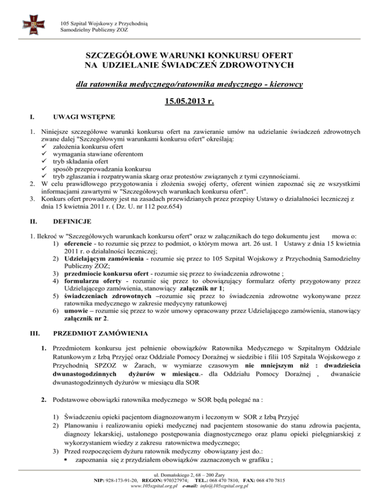 105 Szpital Wojskowy z Przychodnią Samodzielny Publiczny ZOZ SZCZEGÓŁOWE WARUNKI KONKURSU OFERT NA UDZIELANIE ŚWIADCZEŃ ZDROWOTNYCH dla ratownika medycznego/ratownika medycznego - kierowcy 15.05.2013 r. I. UWAGI WSTĘPNE 1. Niniejsze szczegółowe warunki konkursu ofert na zawieranie umów na udzielanie świadczeń zdrowotnych zwane dalej "Szczegółowymi warunkami konkursu ofert" określają: założenia konkursu ofert wymagania stawiane oferentom tryb składania ofert sposób przeprowadzania konkursu tryb zgłaszania i rozpatrywania skarg oraz protestów związanych z tymi czynnościami. 2. W celu prawidłowego przygotowania i złożenia swojej oferty, oferent winien zapoznać się ze wszystkimi informacjami zawartymi w "Szczegółowych warunkach konkursu ofert". 3. Konkurs ofert prowadzony jest na zasadach przewidzianych przez przepisy Ustawy o działalności leczniczej z dnia 15 kwietnia 2011 r. ( Dz. U. nr 112 poz.654) II. DEFINICJE 1. Ilekroć w "Szczegółowych warunkach konkursu ofert" oraz w załącznikach do tego dokumentu jest mowa o: 1) oferencie - to rozumie się przez to podmiot, o którym mowa art. 26 ust. 1 Ustawy z dnia 15 kwietnia 2011 r. o działalności leczniczej; 2) Udzielającym zamówienia - rozumie się przez to 105 Szpital Wojskowy z Przychodnią Samodzielny Publiczny ZOZ; 3) przedmiocie konkursu ofert - rozumie się przez to świadczenia zdrowotne ; 4) formularzu oferty - rozumie się przez to obowiązujący formularz oferty przygotowany przez Udzielającego zamówienia, stanowiący załącznik nr 1; 5) świadczeniach zdrowotnych –rozumie się przez to świadczenia zdrowotne wykonywane przez ratownika medycznego w zakresie medycyny ratunkowej 6) umowie – rozumie się przez to wzór umowy opracowany przez Udzielającego zamówienia, stanowiący załącznik nr 2. III. PRZEDMIOT ZAMÓWIENIA 1. Przedmiotem konkursu jest pełnienie obowiązków Ratownika Medycznego w Szpitalnym Oddziale Ratunkowym z Izbą Przyjęć oraz Oddziale Pomocy Doraźnej w siedzibie i filii 105 Szpitala Wojskowego z Przychodnią SPZOZ w Żarach, w wymiarze czasowym nie mniejszym niż : dwadzieścia dwunastogodzinnych dyżurów w miesiącu.- dla Oddziału Pomocy Doraźnej , dwanaście dwunastogodzinnych dyżurów w miesiącu dla SOR 2. Podstawowe obowiązki ratownika medycznego w SOR będą polegać na : 1) Świadczeniu opieki pacjentom diagnozowanym i leczonym w SOR z Izbą Przyjęć 2) Planowaniu i realizowaniu opieki medycznej nad pacjentem stosowanie do stanu zdrowia pacjenta, diagnozy lekarskiej, ustalonego postępowania diagnostycznego oraz planu opieki pielęgniarskiej z wykorzystaniem wiedzy z zakresu ratownictwa medycznego; 3) Przed rozpoczęciem dyżuru ratownik medyczny obowiązany jest do.: zapoznania się z przydziałem obowiązków zaznaczonych w grafiku ; ul. Domańskiego 2, 68 – 200 Żary NIP: 928-173-91-20, REGON: 970327974; TEL.: 068 470 7810, FAX: 068 470 7815 www.105szpital.org.pl e-mail: [email protected] 105 Szpital Wojskowy z Przychodnią Samodzielny Publiczny ZOZ przygotowania stanowiska pracy; sprawdzenia dokumentacji medycznej SOR z Izbą Przyjęć; 4) Do obowiązków ratownika medycznego przy przyjęciu pacjenta należy m.in.: przyjęcie pacjenta do oddziału – założenie dokumentacji medycznej, pobranie materiału do badań diagnostycznych i dostarczenie go oraz odbiór wyników z laboratorium, zapoznanie pacjenta z Kartą praw pacjenta 5) Do obowiązków ratownika medycznego w SOR z Izbą Przyjęć należy m.in.: asystowanie przy przyjęciu pacjenta przez lekarza, pielęgniarkę; asystowanie lekarzowi, pielęgniarce przy wykonywaniu zabiegów – intubacji, założenia wkłucia centralnego, zszywania rany, zakładania drenów, cewnikowania pęcherza moczowego, zakładania sondy żołądkowej uczestniczenie w wykonywaniu badań diagnostycznych u pacjenta 6) Do obowiązków medycznych ratownika medycznego w SOR z Izbą Przyjęć wykonywanych samodzielnie należy: wykonywanie czynności higieniczno – pielęgnacyjnych u pacjenta prowadzenie obserwacji pacjenta prowadzenie monitorowania czynności układu oddechowego, krążenia u pacjenta w zależności od jego stanu; prowadzenie resuscytacji krążeniowo-oddechowej podczas czynności ratujących życie odsysanie pacjenta podejmowanie tlenoterapii biernej lub wspomagania oddechu lub wentylacji zastępczej na zlecenie lekarza wykonywanie badania EKG wykonywanie kaniulacji żył obwodowych podawanie leków dożylnych , doustnych , doodbytniczych, podskórnych przy użyciu gotowych zestawów na zlecenie lekarza pobieranie krwi żylnej i włośniczkowej do badań laboratoryjnych oznaczanie poziomów glukozy w surowicy oraz badań gazometrycznych przy użyciu aparatury – glukometr, opatrywanie ran wykonywanie pomiarów tj. wzrostu , masy ciała, transportowanie krwi i preparatów krwiopochodnych oraz materiału biologicznego do badań prowadzenie dokumentacji medycznej pacjenta wykonywanie toalety pośmiertnej i transportowanie zwłok do pomieszczenia Pro Morte 7) Ratownik medyczny przeprowadza dezynfekcję aparatury medycznej w SOR zgodnie zobowiązującymi procedurami; 8) Zabezpiecza pacjenta przed urazami i czynnikami szkodliwymi dla jego zdrowia. 9) Zapewnia bezpieczeństwo pacjentom udającym się lub powracającym z zabiegu. 10) Towarzyszy pacjentom udającym się na inny oddział lub badanie diagnostyczne. 11) Przyjmuje i przekazuje w raporcie informacje dotyczące pacjentów. 12) Zgłasza bezwzględnie przełożonemu lub lekarzowi dyżurnemu przypadek popełnienia błędu zagrażającego życiu i zdrowiu pacjenta. 13) Zgłasza bezwzględnie przełożonemu lub lekarzowi dyżurnemu niemożności wykonania czynności medycznych i zabiegu diagnostycznego oraz higieniczno- pielęgnacyjnych. 14) Zgłasza Pielęgniarce Oddziałowej potrzeby uzupełniania sprzętu, leków, środków opatrunkowych oraz wadliwe funkcjonowanie lub uszkodzenia aparatury. 15) Wykonuje inne czynności na polecenie Kierownika i 