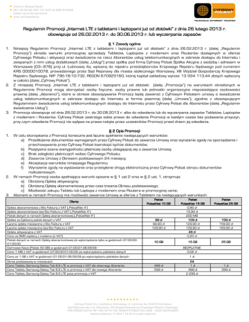 Centrum Obsługi Klienta 801 08 08 08, 222 127 222 lub 699 00 2222 (opłata wg taryfy operatora) www.cyfrowypolsat.pl Regulamin Promocji „Internet „Internet LTE z tabletami i laptopami już od złotówki” złotówki” z dnia 26 lutego 2013 r. obowiązuje od 26.02 26.02.2013 .02.2013 r. do 30.06.2013 r. lub wyczerpania zapasów § 1 Zasady ogólne 1. Niniejszy Regulamin Promocji „Internet LTE z tabletami i laptopami już od złotówki” z dnia 26.02.2013 r. (dalej „Regulamin Promocji”) określa warunki promocyjnej sprzedaży Tabletów, Laptopów z modemem oraz Routerów dostępnych w ofercie Cyfrowego Polsatu i aktywacji oraz świadczenia na rzecz Abonentów usług telekomunikacyjnych w zakresie dostępu do Internetu i związanych z nimi usług dodatkowych (dalej „Usługi”) przez spółkę pod firmą Cyfrowy Polsat Spółka Akcyjna z siedzibą i adresem w Warszawie (03–878) przy ul. Łubinowej 4a, wpisaną do rejestru przedsiębiorców Krajowego Rejestru Sądowego pod numerem KRS 0000010078, prowadzonego przez Sąd Rejonowy dla miasta stołecznego Warszawy, XIII Wydział Gospodarczy Krajowego Rejestru Sądowego, NIP 796-18-10-732, REGON 670925160, której kapitał zakładowy wynosi: 13 934 113,44 złotych wpłacony w całości (dalej „Cyfrowy Polsat”). 2. Z niniejszej Promocji „Internet LTE z tabletami i laptopami już od złotówki (dalej „Promocja”) na warunkach określonych w Regulaminie Promocji mogą skorzystać osoby fizyczne, osoby prawne lub jednostki organizacyjne nieposiadające osobowości prawnej (dalej „Abonenci”), które w okresie obowiązywania Promocji będą zawierać z Cyfrowym Polsatem umowy o świadczenie usług telekomunikacyjnych w zakresie dostępu do Internetu w formie pisemnej (dalej „Umowa”), zgodnie z obowiązującym Regulaminem świadczenia usług telekomunikacyjnych dostępu do Internetu przez Cyfrowy Polsat dla Abonentów (dalej „Regulamin świadczenia Usług”). 3. Promocja obowiązuje od dnia 26.02.2013 r. do 30.06.2013 r. albo do odwołania lub do wyczerpania zapasów Tabletów, Laptopów z modemem i Routerów. Cyfrowy Polsat zastrzega sobie prawo do odwołania Promocji w każdym czasie bez podawania przyczyn, przy czym odwołanie Promocji nie wpływa na prawa nabyte przez uczestników Promocji przed dniem jej odwołania. § 2 Opis Promocji 1. W celu skorzystania z Promocji konieczne jest łączne spełnienie następujących warunków: a) Przedłożenie dokumentów wymaganych przez Cyfrowy Polsat do zawarcia Umowy oraz wyrażenie zgody na sporządzenie i przechowywanie przez Cyfrowy Polsat kserokopii tychże dokumentów; b) Pozytywna ocena wiarygodności płatniczej osoby ubiegającej się o zawarcie Umowy; c) Brak zaległości płatniczych wobec Cyfrowego Polsatu; d) Zawarcie Umowy z Okresem podstawowym 24 miesięcy; e) Akceptacja warunków niniejszego Regulaminu; f) Wyrażenie zgody na wystawianie oraz przesyłanie drogą elektroniczną przez Cyfrowy Polsat obrazu dokumentów rozliczeniowych. 2. W ramach Promocji osoba spełniająca warunki opisane w § 1 ust 2 oraz w § 2 ust. 1, otrzymuje: a) Obniżoną Opłatę aktywacyjną; b) Obniżoną Opłatę abonamentową przez czas trwania Okresu podstawowego; c) Możliwość zakupu Tabletu lub Laptopa z modemem oraz Routera w promocyjnej cenie; 3. Abonent w ramach Promocji ma możliwość zawarcia Umowy w ofercie z Tabletem na następujących warunkach: Pakiet Pakiet PolsatNet 10 GB Oferta Opłata abonamentowa z Eko Fakturą z VAT („PolsatNet 4”) Opłata abonamentowa bez Eko Faktury z VAT („PolsatNet 4”) Pakiet danych w ramach Opłaty abonamentowej („PolsatNet 4”) Opłata za Cykliczny pakiet danych z VAT Łączna opłata miesięczna z Eko Fakturą z VAT Łączna opłata miesięczna bez Eko Faktury z VAT Opłata aktywacyjna z VAT Cena za SMS wysłany z modemu (z VAT) Pakiet danych w ramach Opłaty abonamentowej do wykorzystania tylko w godzinach 07:00:0001:00:00 Darmowe Noce (Pakiet 50 GB) w godzinach 01:00:01-06:59:59 Cena 1 MB z VAT w godzinach 07:00:00-01:00:00 po wykorzystaniu pakietów danych 99 zł 99,90 zł 109,90 zł 10 GB Pakiet PolsatNet 25 25 GB 15 GB 25 GB 159 159 zł 159,90 zł 169,90 zł BEZPŁATNIE 0,02 zł 1) Cena za 1 GB z VAT w godzinach 01:00:01-06:59:59 po wykorzystaniu pakietów danych Okres podstawowy w miesiącach Cena Tabletu Samsung Galaxy Tab 8.9 LTE w promocji z VAT dla obecnego Abonenta Cena Tabletu Samsung Galaxy Tab 8.9 LTE w promocji z VAT dla nowego Abonenta Cena Tabletu Samsung Galaxy Tab 8.9 LTE poza promocją z VAT Pakiet PolsatNet 15 GB 0,90 zł 10,90 zł 200 MB 129 129 zł 129,90 zł 139,90 zł 49 zł 0,20 zł 1 zł 499 zł 599 zł Cyfrowy Polsat S.A. z siedzibą w Warszawie, ul. Łubinowa 4a, 03-878 Warszawa Sąd Rejonowy dla m.st. Warszawy, XIII Wydział Gospodarczy Krajowego Rejestru Sądowego KRS 0000010078, NIP 796-18-10-732, REGON 670925160, GIOŚ – E0001824WZBW Kapitał zakładowy 13 934 113,44 zł w pełni wpłacony 24 1 zł 499 zł 2 299 zł 1 zł 399 zł Centrum Obsługi Klienta 801 08 08 08, 222 127 222 lub 699 00 2222 (opłata wg taryfy operatora) www.cyfrowypolsat.pl Pakiet Pakiet PolsatNet PolsatNet 2 GB PolsatNet 6 GB 0,90 zł 10,90 zł 200 MB 49 zł 79 zł 49,90 zł 79,90 zł 59,90 zł 89,90 zł 49 zł 0,20 zł Oferta Opłata abonamentowa z Eko Fakturą z VAT („PolsatNet 4”) Opłata abonamentowa bez Eko Faktury z VAT („PolsatNet 4”) Pakiet danych w ramach Opłaty abonamentowej („PolsatNet 4”) Opłata za Cykliczny pakiet danych z VAT Łączna opłata miesięczna z Eko Fakturą z VAT Łączna opłata miesięczna bez Eko Faktury z VAT Opłata aktywacyjna z VAT Cena za SMS wysłany z modemu (z VAT) Pakiet danych w ramach Opłaty abonamentowej do wykorzystania tylko w godzinach 07:00:00-01:00:00 2 GB Darmowe Noce (Pakiet 50 GB) w godzinach 01:00:01-06:59:59 Cena 1 MB z VAT w godzinach 07:00:00-01:00:00 po wykorzystaniu pakietów danych Cena za 1 GB z VAT w godzinach 01:00:01-06:59:59 po wykorzystan