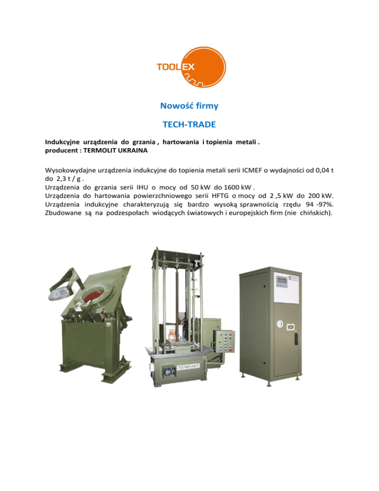 Nowość firmy TECH-TRADE Indukcyjne urządzenia do grzania , hartowania i topienia metali . producent : TERMOLIT UKRAINA Wysokowydajne urządzenia indukcyjne do topienia metali serii ICMEF o wydajności od 0,04 t do 2,3 t / g . Urządzenia do grzania serii IHU o mocy od 50 kW do 1600 kW . Urządzenia do hartowania powierzchniowego serii HFTG o mocy od 2 ,5 kW do 200 kW. Urządzenia indukcyjne charakteryzują się bardzo wysoką sprawnością rzędu 94 -97%. Zbudowane są na podzespołach wiodących światowych i europejskich firm (nie chińskich).