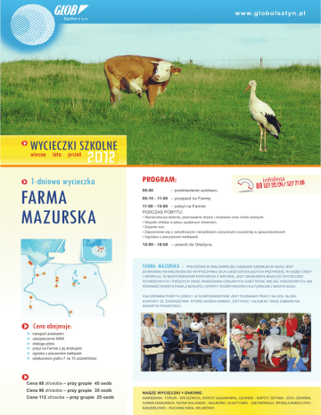 www.globolsztyn.pl WYCIECZKI SZKOLNE wiosna lato jesień 2012 1-dniowa wycieczka FARMA MAZURSKA PROGRAM: 08:00 – podstawienie autokaru infolinia 71 86 89 527 20 04 / 527 08:15 - 11:00 – przejazd na Farmę 11:00 - 15:00 – pobyt na Farmie PODCZAS POBYTU: • Wycieczka po terenie, poznawanie drzew i krzewów oraz roślin zielnych. • Wypiek chleba w piecu opalanym drewnem. • Dojenie kóz. • Zapoznanie się z zabytkowymi narzędziami używanymi wcześniej w gospodarstwach. • Ognisko z pieczeniem kiełbasek. 15:00 - 18:00 – powrót do Olsztyna. FARMA MAZURSKA – POŁOŻONA W MALOWNICZEJ OSADZIE SZAREJKI K/ EŁKU JEST DOSKONAŁYM MIEJSCEM DO WYPOCZYNKU DLA LUDZI KOCHAJĄCYCH PRZYRODĘ, W OAZIE CISZY I SPOKOJU, W BEZPOŚREDNIM KONTAKCIE Z NATURĄ, JEST ZNAKOMITĄ BAZĄ DO WYCIECZEK ROWEROWYCH I PIESZYCH ORAZ ZWIEDZANIA CIEKAWYCH ZABYTKÓW, MIEJSC WIDOKOWYCH JAK RÓWNIEŻ KORZYSTANIA Z BOGATEJ OFERTY ROZRYWKOWO-KULTURALNEJ MIASTA EŁKU. ZAŁOŻENIEM POBYTU DZIECI W GOSPODARSTWIE JEST POZNANIE PRACY NA WSI, BLISKI KONTAKT ZE ZWIERZĘTAMI, KTÓRE MOŻNA KARMIĆ, DOTYKAĆ I GŁASKAĆ ORAZ ZABAWA NA ŚWIEŻYM POWIETRZU. Cena obejmuje: ► transport autokarem ► ubezpieczenie NNW ► obsługa pilota ► pobyt na Farmie z jej atrakcjami ► ognisko z pieczeniem kiełbasek ► opiekunowie gratis (1 na 15 uczestników) Cena 88 zł/osoba – przy grupie 45 osób Cena 96 zł/osoba – przy grupie 35 osób Cena 112 zł/osoba – przy grupie 25 osób NASZE WYCIECZKI 1-DNIOWE: WARSZAWA, TORUŃ - KRUSZWICA, SOPOT (AQUAPARK), GDAŃSK - SOPOT, GDYNIA - ZOO, GDAŃSK, FARMA MAZURSKA, NOWA HOLANDIA - MALBORK, OLSZTYNEK - GIETRZWAŁD, ŹRÓDŁA RZEKI ŁYNY, KADZIDŁOWO - RUCIANE NIDA, WILIMOWO