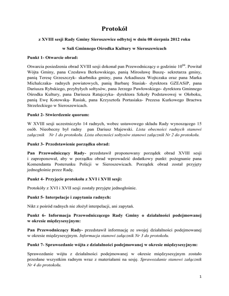 Protokół z XVIII sesji Rady Gminy Sieroszewice odbytej w dniu 08 sierpnia 2012 roku w Sali Gminnego Ośrodka Kultury w Sieroszewicach Punkt 1- Otwarcie obrad: Otwarcia posiedzenia obrad XVIII sesji dokonał pan Przewodniczący o godzinie 1004. Powitał Wójta Gminy, pana Czesława Berkowskiego, panią Mirosławę Buszę- sekretarza gminy, panią Teresę Grzeszczyk- skarbnika gminy, pana Arkadiusza Wojtczaka oraz pana Marka Michalczaka- radnych powiatowych, panią Barbarę Stasiak- dyrektora GZEASiP, pana Dariusza Rybskiego, przybyłych sołtysów, pana Jerzego Pawłowskiego- dyrektora Gminnego Ośrodka Kultury, pana Dariusza Ratajczyka- dyrektora Szkoły Podstawowej w Ołoboku, panią Ewę Kotowską- Rasiak, pana Krzysztofa Portasiaka- Prezesa Kurkowego Bractwa Strzeleckiego w Sieroszewicach. Punkt 2- Stwierdzenie quorum: W XVIII sesji uczestniczyło 14 radnych, wobec ustawowego składu Rady wynoszącego 15 osób. Nieobecny był radny pan Dariusz Majewski. Lista obecności radnych stanowi załącznik Nr 1 do protokołu. Lista obecności sołtysów stanowi załącznik Nr 2 do protokołu. Punkt 3- Przedstawienie porządku obrad: Pan Przewodniczący Rady- przedstawił proponowany porządek obrad XVIII sesji i zaproponował, aby w porządku obrad wprowadzić dodatkowy punkt: pożegnanie pana Komendanta Posterunku Policji w Sieroszewicach. Porządek obrad został przyjęty jednogłośnie przez Radę. Punkt 4- Przyjęcie protokołu z XVI i XVII sesji: Protokóły z XVI i XVII sesji zostały przyjęte jednogłośnie. Punkt 5- Interpelacje i zapytania radnych: Nikt z pośród radnych nie złożył interpelacji, ani zapytań. Punkt 6- Informacja Przewodniczącego Rady Gminy o działalności podejmowanej w okresie międzysesyjnym: Pan Przewodniczący Rady- przedstawił informację ze swojej działalności podejmowanej w okresie międzysesyjnym. Informacja stanowi załącznik Nr 3 do protokołu. Punkt 7- Sprawozdanie wójta z działalności podejmowanej w okresie międzysesyjnym: Sprawozdanie wójta z działalności podejmowanej w okresie międzysesyjnym zostało przesłane wszystkim radnym wraz z materiałami na sesję. Sprawozdanie stanowi załącznik Nr 4 do protokołu. 1 Pan Wójt-„ Z Panem Dariuszem współpracuję od siedmiu lat, odkąd został skierowany przez swoich przełożonych do pracy w Posterunku Policji w Sieroszewicach. Od początku wydawało mi się, że nasza współpraca będzie układać się dobrze i nie pomyliłem się. Pan Dariusz był otwarty na współpracę, występował w wielu sprawach dotyczących działalności policyjnej. W tym czasie zmodernizowano Posterunek i zakupiono samochód policyjny. Za tę wieloletnią służbę, bo 21 lat w policji i 7 lat na stanowisku kierownika Posterunku Policji w Sieroszewicach ,chciałbym Panu aspirantowi gorąco podziękować w imieniu swoim i wszystkich radnych. Jednocześnie życzymy, aby ten następny okres w życiu był bardzo udany i był czas na realizowanie swoich pasji i zainteresowań.” Pan Wójt wraz z Przewodniczącym Rady Gminy Sieroszewice wręczyli panu Dariuszowi kwiaty i pamiątkową statuetkę. Pan Dariusz Rybski- wyraził słowa wdzięczności dla wójta i radnych. „Nasza współpraca zaowocowała remontem posterunku, nowym radiowozem i różnym sprzętem potrzebnym do codziennych zadań służbowych. Od 1 sierpnia br. obowiązki kierownika Posterunku Policji w Sieroszewicach pełni komisarz Tomasz Gościniak z Wydziału Dochodzeniowo- Śledczego Komendy Powiatowej Policji w Ostrowie”. Wręczył wójtowi Gminy Sieroszewice Panu Czesławowi Berkowskiemu i Przewodniczącemu Rady Gminy,Pawłowi Siwakowi listy gratulacyjne. Punkt 8- Podjęcie uchwał Rady Gminy w sprawach: a) rozpatrzenie skargi na działalność dyrektora Szkoły Podstawowej w Ołoboku: Pan Stanisław Płomiński- przedstawił opinię Komisji Kultury, Oświaty, Zdrowia, Pomocy Społecznej i Promocji dotyczącą rozpatrzenia skargi na działalność dyrektora Szkoły Podstawowej w Ołoboku. Komisja uznała skargę za niezasadną. Opinia stanowi załącznik Nr 5 do protokołu z sesji. Pan Henryk Jędroszka- przedstawił opinię Komisji Rolnictwa, Rozwoju Gospodarczego i Infrastruktury dotyczącą rozpatrzenia skargi na dyrektora Szkoły Podstawowej w Ołoboku. Komisja uznała skargę za niezasadną. Opinia stanowi załącznik Nr 6 do protokołu z sesji. Pan Andrzej Gierlach- przedstawił opinię Komisji Budżetu, Finansów i Zaopatrzenia dot. rozpatrzenia skargi na działalność dyrektora Szkoły Podstawowej w Ołoboku. Komisja uznała skargę za niezasadną. Opinia stanowi załącznik Nr 7 do protokołu z sesji. Pan Przewodniczący Rady- otworzył dyskusję nad projektem uchwały w sprawie rozpatrzenia skargi nad działalność dyrektora Szkoły Podstawowej w Ołoboku. Nikt spośród radnych nie zgłosił się do dyskusji. Pan Przewodniczący Rady- prosił o zrozumienie Rady Gminy, bo sytuacja jest niekomfortowa dla wszystkich radnych. Stwierdził , że cały czas mam wątpliwość, czy Rada powinna się zajmować tą sprawą, ale Kuratorium Oświaty przysłało skargę do rozpatrzenia jako organowi prowadzącemu. 2 Pan Przewodniczący Rady- poddał pod głosowanie projektu uchwały w sprawie rozpatrzenia skargi na działalność dyrektora Szkoły Podstawowej w Ołoboku. Zgodnie z opiniami Komisji, Rada głosowała pierwszy projekt uchwały jako skargę niezasadną. Za przyjęciem uchwały głosowało 5 radnych, 9 radnych wstrzymało się od głosu. W wyniku przeprowadzonego głosowania powyższy projekt uchwały został przyjęty przez Radę. Uchwała Nr XVIII/132/2012 w sprawie rozpatrzenia skargi na działalność dyrektora Szkoły Podstawowej w Ołoboku stanowi załącznik 7a do protokołu. b) zmian w budżecie na 2012 rok: Pan Wójt- omówił projekt uchwały w sprawie zmian w budżecie na 2012 rok wraz z uzasadnieniem do uchwały. Pan Stanisław Płomiński- przedstawił pozytywną opinię Komisji Kultury, Oświaty, Zdrowia, Pomocy Spo