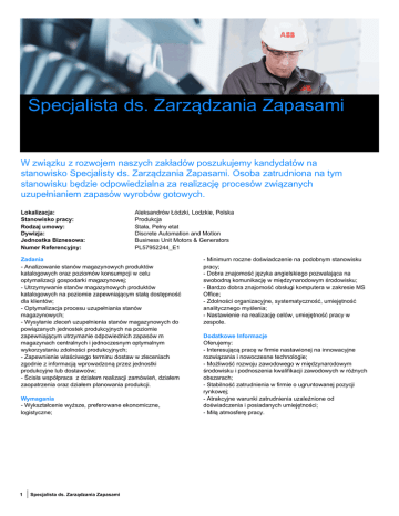 Specjalista ds. Zarządzania Zapasami W związku z rozwojem naszych zakładów poszukujemy kandydatów na stanowisko Specjalisty ds. Zarządzania Zapasami. Osoba zatrudniona na tym stanowisku będzie odpowiedzialna za realizację procesów związanych uzupełnianiem zapasów wyrobów gotowych. Lokalizacja: Stanowisko pracy: Rodzaj umowy: Dywizja: Jednostka Biznesowa: Numer Referencyjny: Aleksandrów Łódzki, Lodzkie, Polska Produkcja Stała, Pełny etat Discrete Automation and Motion Business Unit Motors & Generators PL57952244_E1 Zadania - Analizowanie stanów magazynowych produktów katalogowych oraz poziomów konsumpcji w celu optymalizacji gospodarki magazynowej; - Utrzymywanie stanów magazynowych produktów katalogowych na poziomie zapewniającym stałą dostępność dla klientów; - Optymalizacja procesu uzupełniania stanów magazynowych; - Wysyłanie zleceń uzupełnienia stanów magazynowych do powiązanych jednostek produkcyjnych na poziomie zapewniającym utrzymanie odpowiednich zapasów m magazynach centralnych i jednoczesnym optymalnym wykorzystaniu zdolności produkcyjnych; - Zapewnienie właściwego terminu dostaw w zleceniach zgodnie z informacją wprowadzoną przez jednostki produkcyjne lub dostawców; - Ścisła współpraca z działem realizacji zamówień, działem zaopatrzenia oraz działem planowania produkcji. Wymagania - Wykształcenie wyższe, preferowane ekonomiczne, logistyczne; 1 Specjalista ds. Zarządzania Zapasami - Minimum roczne doświadczenie na podobnym stanowisku pracy; - Dobra znajomość języka angielskiego pozwalająca na swobodną komunikację w międzynarodowym środowisku; - Bardzo dobra znajomość obsługi komputera w zakresie MS Office; - Zdolności organizacyjne, systematyczność, umiejętność analitycznego myślenia; - Nastawienie na realizację celów, umiejętność pracy w zespole. Dodatkowe Informacje Oferujemy: - Interesującą pracę w firmie nastawionej na innowacyjne rozwiązania i nowoczesne technologie; - Możliwość rozwoju zawodowego w międzynarodowym środowisku i podnoszenia kwalifikacji zawodowych w różnych obszarach; - Stabilność zatrudnienia w firmie o ugruntowanej pozycji rynkowej; - Atrakcyjne warunki zatrudnienia uzależnione od doświadczenia i posiadanych umiejętności; - Miłą atmosferę pracy. Informacje dodatkowe: Osoby zainteresowane prosimy o przesyłanie CV za pośrednictwem naszej strony klikając na przycisk „Aplikuj”. Zastrzegamy sobie prawo odpowiedzi wyłącznie na wybrane oferty. Wszystkie oferty powinny zawierać klauzulę: „Wyrażam zgodę na przetwarzanie moich danych osobowych zawartych w ofercie pracy zgodnie z Ustawą z dnia 29 sierpnia 1997 o ochronie danych osobowych (tekst jednolity Dz. U. 2002.101.926. z późn. zm.) dla potrzeb niezbędnych do realizacji procesu rekrutacji”. ABB (www.abb.com) jest liderem w technologiach dla energetyki i automatyki, które pozwalają klientom przemysłowym oraz zakładom użyteczności publicznej zwiększyć swoją efektywność, jednocześnie minimalizując oddziaływanie na środowisko naturalne. Grupa ABB zatrudnia około 140 000 pracowników w blisko 100 krajach świata. Our ambition. Your legacy. 2 Specjalista ds. Zarządzania Zapasami