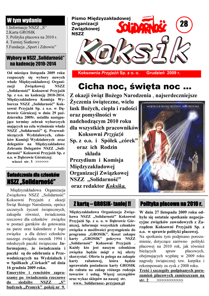 W tym wydaniu 1.Informacje NSZZ ,,S” 2.Karta GROSIK 3. Polityka płacowa na 2010 r. 4. Turniej Siatkowy 5.Fundacja ,,Sport i Zdrowie” Pismo Międzyzakładowej Organizacji Związkowej NSZZ 28 Wybory w NSZZ ,,Solidarność” na kadencję 2010-2014 Od miesiąca listopada 2009 roku rozpoczęły się wybory nowych władz Międzyzakładowej Organizacji Związkowej NSZZ ,,Solidarność” Koksowni Przyjaźń Sp. z o.o. na kadencję 2010-2014. Międzyzakładowa Komisja Wyborcza NSZZ „Solidarność” Koksowni Przyjaźń Sp. z o.o. w Dąbrowie Górniczej w dniu 29 października 2009r. ustaliła następujące terminy zebrań wyborczych mających na celu wyłonienie władz NSZZ ,,Solidarność” tj. Przewodniczących Wydziałowych, członków Komisji Wydziałowych oraz delegatów na Międzyzakładowe Zebranie Delegatów NSZZ „Solidarność” Koksowni Przyjaźń Sp. z o.o. w Dąbrowie Górniczej: więcej str. 3 >>>>>> Świadczenia dla członków NSZZ ,,Solidarność” Międzyzakładowa Organizacja Związkowa NSZZ ,,Solidarność” Koksowni Przyjaźń z okazji Świąt Bożego Narodzenia, oprócz szczerych życzeń świątecznych, zakupiła również, świadczenia rzeczowe dla członków związku w postaci garnków do gotowania na parze oraz kalendarze z logo związku a dla dzieci członków naszego związku rocznik 1994 i młodszych paczki świąteczne .Informujemy, że świadczenia i paczki są do odebrania u Przewodniczących na Wydziałach i w Spółkach ,,Córkach” od dnia 16 grudnia 2009 roku. Emerytów i rencistów zapraszamy po świadczenia rzeczowe do siedziby NSZZ ,,S” budynek ,,Promyk” pokój nr 9. Koksownia Przyjaźń Sp. z o. o. Grudzień 2009 r. Cicha noc, święta noc ... Z okazji świąt Bożego Narodzenia , najserdeczniejsze Życzenia świąteczne, wielu łask Bożych, ciepła i radości oraz pomyślności w nadchodzącym 2010 roku dla wszystkich pracowników Koksowni Przyjaźń Sp. z o.o. i Spółek ,,córek” oraz ich Rodzin składa Prezydium i Komisja Międzyzakładowej Organizacji Związkowej NSZZ ,,Solidarność” oraz redaktor Koksika. Z kartą – GROSIK- taniej !! Polityka płacowa na 2010 r. Międzyzakładowa Organizacja Związkowa NSZZ „Solidarność” Koksowni Przyjaźń Sp. z o. o. w Dąbrowie Górniczej, informuje wszystkich członków związku o możliwości przystąpienia do programu „GROSIK”. Koszt zakupu karty ,,GROSIK” pokrywa NSZZ ,,Solidarność” Koksowni Przyjaźń . Każdy kto jest naszym członkiem związku będzie mógł z tej oferty skorzystać. Oferta ta polega na zakupie karty rabatowej, która będzie uprawniała posiadacza karty GROSIK do rabatu na zakup różnego rodzaju towarów i usług. Więcej szczegółów oraz wykaz sklepów na naszej str. www. Solidarnosc- przyjazn.pl W dniu 27 listopada 2009 roku odbyło się ostatnie spotkanie negocjacyjne związków zawodowych z Zarządem Koksowni Przyjaźń Sp. z o.o. w sprawie polityki płacowej. Na spotkaniu tym podpisano porozumienie, dotyczące zarówno polityki płacowej na 2010 rok, jak również bieżących spraw płacowych, obejmujących wypłatę w 2009 roku nagrody świątecznej tzw. karpika i rekompensaty za zysk z 2008 roku. Treść i szczegóły podpisanych porozumień płacowych zamieszczam na str. 2 >>>>>>>>>>>