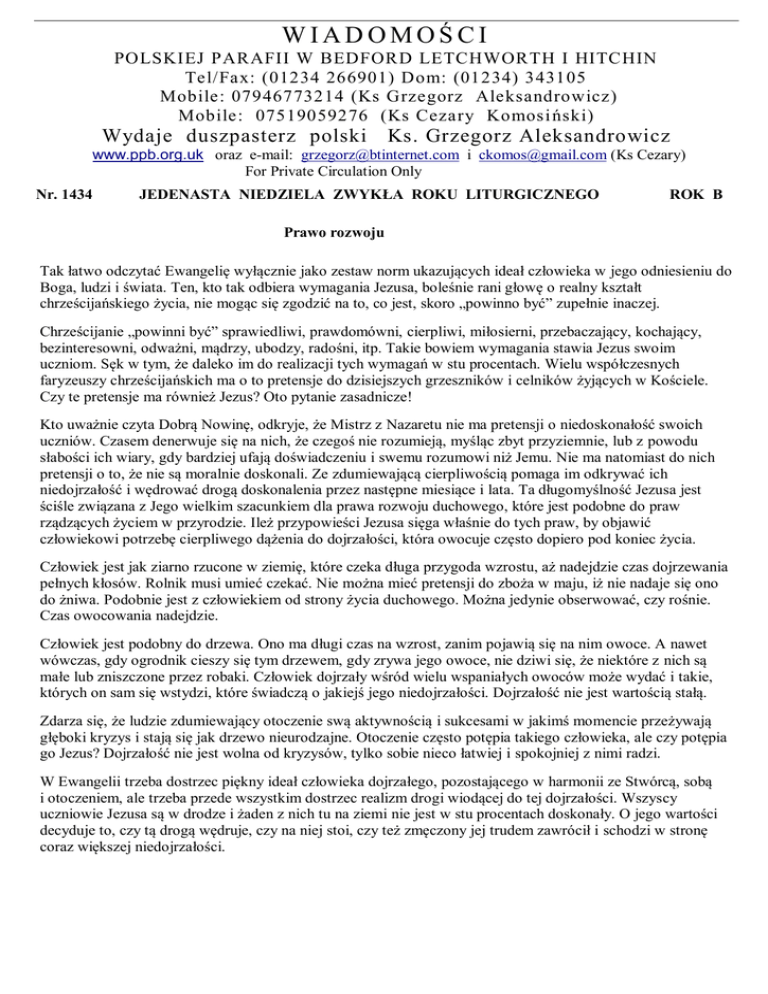 WIADOMOŚCI POLSKIEJ PARAFII W BEDFORD LETCHWORTH I HITCHIN Tel/Fax: (01234 266901) Dom: (01234) 343105 Mobile: 07946773214 (Ks Grzegorz Aleksandrowicz) Mobile: 07519059276 (Ks Cezary Komosi ński) Wydaje duszpasterz polski Ks. Grzegorz Aleksandrowicz www.ppb.org.uk oraz e-mail: [email protected] i [email protected] (Ks Cezary) For Private Circulation Only Nr. 1434 JEDENASTA NIEDZIELA ZWYKŁA ROKU LITURGICZNEGO ROK B Prawo rozwoju Tak łatwo odczytać Ewangelię wyłącznie jako zestaw norm ukazujących ideał człowieka w jego odniesieniu do Boga, ludzi i świata. Ten, kto tak odbiera wymagania Jezusa, boleśnie rani głowę o realny kształt chrześcijańskiego życia, nie mogąc się zgodzić na to, co jest, skoro „powinno być” zupełnie inaczej. Chrześcijanie „powinni być” sprawiedliwi, prawdomówni, cierpliwi, miłosierni, przebaczający, kochający, bezinteresowni, odważni, mądrzy, ubodzy, radośni, itp. Takie bowiem wymagania stawia Jezus swoim uczniom. Sęk w tym, że daleko im do realizacji tych wymagań w stu procentach. Wielu współczesnych faryzeuszy chrześcijańskich ma o to pretensje do dzisiejszych grzeszników i celników żyjących w Kościele. Czy te pretensje ma również Jezus? Oto pytanie zasadnicze! Kto uważnie czyta Dobrą Nowinę, odkryje, że Mistrz z Nazaretu nie ma pretensji o niedoskonałość swoich uczniów. Czasem denerwuje się na nich, że czegoś nie rozumieją, myśląc zbyt przyziemnie, lub z powodu słabości ich wiary, gdy bardziej ufają doświadczeniu i swemu rozumowi niż Jemu. Nie ma natomiast do nich pretensji o to, że nie są moralnie doskonali. Ze zdumiewającą cierpliwością pomaga im odkrywać ich niedojrzałość i wędrować drogą doskonalenia przez następne miesiące i lata. Ta długomyślność Jezusa jest ściśle związana z Jego wielkim szacunkiem dla prawa rozwoju duchowego, które jest podobne do praw rządzących życiem w przyrodzie. Ileż przypowieści Jezusa sięga właśnie do tych praw, by objawić człowiekowi potrzebę cierpliwego dążenia do dojrzałości, która owocuje często dopiero pod koniec życia. Człowiek jest jak ziarno rzucone w ziemię, które czeka długa przygoda wzrostu, aż nadejdzie czas dojrzewania pełnych kłosów. Rolnik musi umieć czekać. Nie można mieć pretensji do zboża w maju, iż nie nadaje się ono do żniwa. Podobnie jest z człowiekiem od strony życia duchowego. Można jedynie obserwować, czy rośnie. Czas owocowania nadejdzie. Człowiek jest podobny do drzewa. Ono ma długi czas na wzrost, zanim pojawią się na nim owoce. A nawet wówczas, gdy ogrodnik cieszy się tym drzewem, gdy zrywa jego owoce, nie dziwi się, że niektóre z nich są małe lub zniszczone przez robaki. Człowiek dojrzały wśród wielu wspaniałych owoców może wydać i takie, których on sam się wstydzi, które świadczą o jakiejś jego niedojrzałości. Dojrzałość nie jest wartością stałą. Zdarza się, że ludzie zdumiewający otoczenie swą aktywnością i sukcesami w jakimś momencie przeżywają głęboki kryzys i stają się jak drzewo nieurodzajne. Otoczenie często potępia takiego człowieka, ale czy potępia go Jezus? Dojrzałość nie jest wolna od kryzysów, tylko sobie nieco łatwiej i spokojniej z nimi radzi. W Ewangelii trzeba dostrzec piękny ideał człowieka dojrzałego, pozostającego w harmonii ze Stwórcą, sobą i otoczeniem, ale trzeba przede wszystkim dostrzec realizm drogi wiodącej do tej dojrzałości. Wszyscy uczniowie Jezusa są w drodze i żaden z nich tu na ziemi nie jest w stu procentach doskonały. O jego wartości decyduje to, czy tą drogą wędruje, czy na niej stoi, czy też zmęczony jej trudem zawrócił i schodzi w stronę coraz większej niedojrzałości. MSZE ŚWIĘTE I NABOŻEŃSTWA w BEDFORD: Charity Reg.No.1119423 JEDENASTA NIEDZIELA ZWYKŁA ROKU LITURGICZNEGO Rok B Godz. 9.30 - O błogosławieństwo Boże dla Anny i Michała w 4-tą rocznicę ślubu. Godz.11.00 - O zdrowie i błog. Boże dla Krzysztofa i Moniki z okazji rocznicy ślubu. Godz.19.00 - O zdrowie dla męża Ryszarda - int. żony z rodziną. Poniedziełek,15.06. Godz. 9.30 - za dusze ś.p. Marii Mazur i zmarłych z rodziny - int. córki. Błog. Jolanty Godz.19.00 - Intencja wolna. Wtorek, 16.06.2015 Godz. 9.30 - Intencja wolna. Godz.19.00 - Intencja wolna. Środa, 17.06.2015 Godz. 9.30 - Intencja wolna. Św. Brata Alberta Godz. 19.00 - Intencja wolna. Czwartek, 18.06.2015Godz. 9.30 - Intencja wolna Godz. 19.00 O błog.Boże dla Janusza Stanickiego z ok. 50-tych urodzin–int.Małgorzaty z dziećm Piatek, 19.06.2015 Godz.15.00 - Intencja wolna. Koronka do Miłosierdzia Bożego. Godz.19.00 Dziękcz.–błagalna w 40-tą rocz.ślubu Zenona i Jadwigi Topolewskich–int.córki Sobota, 20.06.2015 Godz. 9.30 - Intencja wolna. Godz.10.00 - ADORACJA NAJŚWIĘTSZEGO SAKRAMENTU. Godz. 19.00 za ś.p. Jadwigi i Augustyna Rekowskich i Bronisława Guzińskiego–int.rodziny. Niedziela,21.06.2015 DWUNASTA NIEDZIELA ZWYKŁA ROKU LITURGICZNEGO Rok B Godz. 9.30 - Intencja wolna. Godz.11.00 - za dusze ś.p. Henryka Świejkowskiego i zmarłych z rodziny - int. żony Godz.19.00 - Intencja wolna. Poniedziałek, 22.06. Godz. 9.30 - Intencja wolna. Godz.19.00 - Intencja wolna. Wtorek. 23.06.2015 Godz. 9.30 O zdrowie i błogosławieństwo Boże i opiekę Matki Bożej dla Janiny Sverdelean. Godz.19.00 - Intencja wolna. Środa, 24.06.2015 - UROCZYSTOŚĆ NARODZIN ŚWIĘTEGO JANA CHRZCICIELA. Godz. 9.30 - Intencja wolna. Godz.19.00 - O błogosławieństwo Boże dla Krzysztofa Wojno z okazji urodzin. Czwartek,25.06.2015 Godz. 9.30 - Intencja wolna. Godz.19.00 - Intencja wolna. Piątek, 26.06.2015 Godz.15.00 - Intencja wolna. Koronka do Miłosierdzia Bożego. Godz.19.00 - Intencja wolna. Sobota, 27.06.2015 Godz. 9.30 - Intencja wolna. Godz.19.00 - Intencja wolna. CHRZEST ŚW.: W naszym kościele w Bedford Sakrament Chrztu Swiętego otrzymał: BRIAN SŁAWOMIR KURDYKOWSKI w sobotę 6 czerwca 2015 r. Nowo ochr