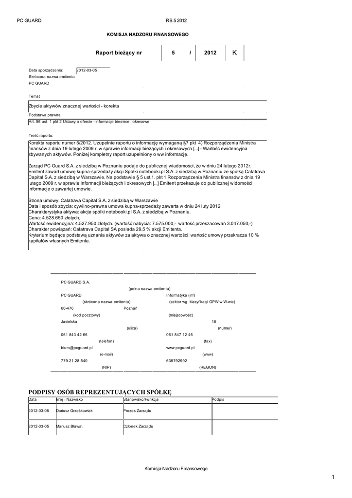 PC GUARD RB 5 2012 KOMISJA NADZORU FINANSOWEGO Raport bieżący nr Data sporządzenia: 5 / K 2012 2012-03-05 Skrócona nazwa emitenta PC GUARD Temat Zbycie aktywów znacznej wartości - korekta Podstawa prawna Art. 56 ust. 1 pkt 2 Ustawy o ofercie - informacje bieøπce i okresowe Treść raportu: Korekta raportu numer 5/2012. Uzupełnie raportu o informację wymaganą §7 pkt 4) Rozporządzenia Ministra finansów z dnia 19 lutego 2009 r. w sprawie informacji bieżących i okresowych [...] - Wartość ewidencyjna zbywanych aktywów. Poniżej kompletny raport uzupełniony o ww informację. Zarząd PC Guard S.A. z siedzibą w Poznaniu podaje do publicznej wiadomości, że w dniu 24 lutego 2012r. Emitent zawarł umowę kupna-sprzedaży akcji Spółki notebooki.pl S.A. z siedzibą w Poznaniu ze spółką Calatrava Capital S.A. z siedzibą w Warszawie. Na podstawie § 5 ust.1. pkt 1 Rozporządzenia Ministra finansów z dnia 19 lutego 2009 r. w sprawie informacji bieżących i okresowych [...] Emitent przekazuje do publicznej widomości informacje o zawartej umowie. Strona umowy: Calatrava Capital S.A. z siedzibą w Warszawie Data i sposób zbycia: cywilno-prawna umowa kupna-sprzedaży zawarta w dniu 24 luty 2012 Charakterystyka aktywa: akcje spółki notebooki.pl S.A. z siedzibą w Poznaniu. Cena: 4.528.650 złotych, Wartość ewidencyjna: 4.527.950 złotych. (wartość nabycia: 7.575.000,- wartość przeszacowań 3.047.050,-) Charakter powiązań: Calatrava Capital SA posiada 29,5 % akcji Emitenta. Kryterium będące podstawą uznania aktywów za aktywa o znacznej wartości: wartość umowy przekracza 10 % kapitałów własnych Emitenta. PC GUARD S.A. (pełna nazwa emitenta) PC GUARD Informatyka (inf) (skrócona nazwa emitenta) 60-476 (sektor wg. klasyfikacji GPW w W-wie) Poznań (kod pocztowy) (miejscowość) Jasielska 16 (ulica) (numer) 061 843 42 66 061 847 12 46 (telefon) (fax) [email protected] www.pcguard.pl (e-mail) (www) 779-21-28-540 639792992 (NIP) (REGON) PODPISY OSÓB REPREZENTUJĄCYCH SPÓŁKĘ Data Imię i Nazwisko Stanowisko/Funkcja 2012-03-05 Dariusz Grześkowiak Prezes Zarządu 2012-03-05 Mariusz Bławat Członek Zarządu Podpis Komisja Nadzoru Finansowego 1