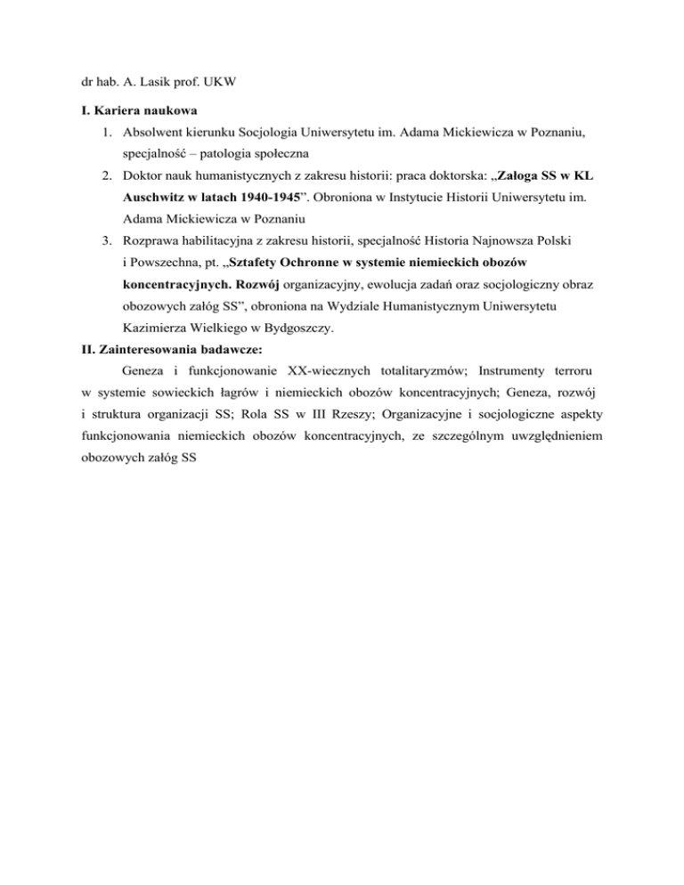 dr hab. A. Lasik prof. UKW I. Kariera naukowa 1. Absolwent kierunku Socjologia Uniwersytetu im. Adama Mickiewicza w Poznaniu, specjalność – patologia społeczna 2. Doktor nauk humanistycznych z zakresu historii: praca doktorska: „Załoga SS w KL Auschwitz w latach 1940-1945”. Obroniona w Instytucie Historii Uniwersytetu im. Adama Mickiewicza w Poznaniu 3. Rozprawa habilitacyjna z zakresu historii, specjalność Historia Najnowsza Polski i Powszechna, pt. „Sztafety Ochronne w systemie niemieckich obozów koncentracyjnych. Rozwój organizacyjny, ewolucja zadań oraz socjologiczny obraz obozowych załóg SS”, obroniona na Wydziale Humanistycznym Uniwersytetu Kazimierza Wielkiego w Bydgoszczy. II. Zainteresowania badawcze: Geneza i funkcjonowanie XX-wiecznych totalitaryzmów; Instrumenty terroru w systemie sowieckich łagrów i niemieckich obozów koncentracyjnych; Geneza, rozwój i struktura organizacji SS; Rola SS w III Rzeszy; Organizacyjne i socjologiczne aspekty funkcjonowania niemieckich obozów koncentracyjnych, ze szczególnym uwzględnieniem obozowych załóg SS