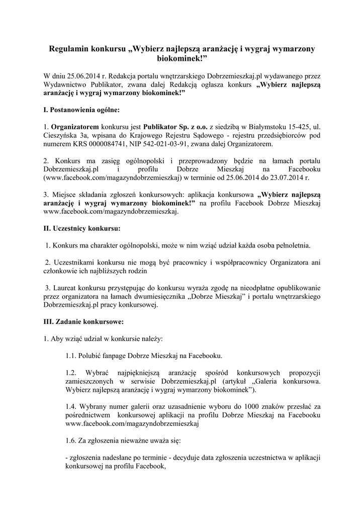 Regulamin konkursu „Wybierz najlepszą aranżację i wygraj wymarzony biokominek!” W dniu 25.06.2014 r. Redakcja portalu wnętrzarskiego Dobrzemieszkaj.pl wydawanego przez Wydawnictwo Publikator, zwana dalej Redakcją ogłasza konkurs „Wybierz najlepszą aranżację i wygraj wymarzony biokominek!” I. Postanowienia ogólne: 1. Organizatorem konkursu jest Publikator Sp. z o.o. z siedzibą w Białymstoku 15-425, ul. Cieszyńska 3a, wpisana do Krajowego Rejestru Sądowego - rejestru przedsiębiorców pod numerem KRS 0000084741, NIP 542-021-03-91, zwana dalej Organizatorem. 2. Konkurs ma zasięg ogólnopolski i przeprowadzony będzie na łamach portalu Dobrzemieszkaj.pl i profilu Dobrze Mieszkaj na Facebooku (www.facebook.com/magazyndobrzemieszkaj) w terminie od 25.06.2014 do 23.07.2014 r. 3. Miejsce składania zgłoszeń konkursowych: aplikacja konkursowa „Wybierz najlepszą aranżację i wygraj wymarzony biokominek!” na profilu Facebook Dobrze Mieszkaj www.facebook.com/magazyndobrzemieszkaj. II. Uczestnicy konkursu: 1. Konkurs ma charakter ogólnopolski, może w nim wziąć udział każda osoba pełnoletnia. 2. Uczestnikami konkursu nie mogą być pracownicy i współpracownicy Organizatora ani członkowie ich najbliższych rodzin 3. Laureat konkursu przystępując do konkursu wyraża zgodę na nieodpłatne opublikowanie przez organizatora na łamach dwumiesięcznika „Dobrze Mieszkaj” i portalu wnętrzarskiego Dobrzemieszkaj.pl pracy konkursowej. III. Zadanie konkursowe: 1. Aby wziąć udział w konkursie należy: 1.1. Polubić fanpage Dobrze Mieszkaj na Facebooku. 1.2. Wybrać najpiękniejszą aranżację spośród konkursowych propozycji zamieszczonych w serwisie Dobrzemieszkaj.pl (artykuł „Galeria konkursowa. Wybierz najlepszą aranżację i wygraj wymarzony biokominek”). 1.4. Wybrany numer galerii oraz uzasadnienie wyboru do 1000 znaków przesłać za pośrednictwem konkursowej aplikacji na profilu Dobrze Mieszkaj na Facebooku www.facebook.com/magazyndobrzemieszkaj 1.6. Za zgłoszenia nieważne uważa się: - zgłoszenia nadesłane po terminie - decyduje data zgłoszenia uczestnictwa w aplikacji konkursowej na profilu Facebook, - zgłoszenia od zgłaszających, którzy nie wypełnili zadań konkursowych określonych w punkcie III Regulaminu lub którzy zrezygnowali w trakcie trwania konkursu z fanpege`u Dobrzemieszkaj.pl, - zgłoszenia nie spełniające warunków Konkursu, w szczególności wybrane aranżacje wnętrze niezamieszczone w konkursowej galerii - zgłoszenia przesłane w inny sposób niż za pośrednictwem aplikacji konkursowej umieszczonej na profilu Dobrze Mieszkaj na Facebooku. IV. Jury konkursu 1. W Jury konkursu zasiadają: - Justyna Łotowska, redaktor naczelna dwumiesięcznika „Dobrze Mieszkaj” i portalu wnętrzarskiego Dobrzemieszkaj.pl - Ewa Kozioł, dziennikarka magazynu „Dobrze Mieszkaj” - Urszula Tatur, dziennikarka magazynu „Dobrze Mieszkaj” - Urszula Grynczel-Aronowicz, dziennikarka magazynu „Dobrze Mieszkaj” - Elżbieta Ławreniuk, dziennikarka magazynu „Dobrze Mieszkaj” - Izabela Kowalska, przedstawicielka firmy Kratki.pl 2. Jury wyłoni zwycięzców spośród osób, które spełniają kryteria uczestnictwa i prześlą zgłoszenie konkursowe za pośrednictwem aplikacji konkursowej na profilu Dobrze Mieszkaj na Facebooku. 3. Zastrzega się, że jury konkursu ma prawo do innego podziału nagród V. Nagrody: I miejsce - biokominek EGZUL z firmy Kratki.pl o wartości 2000 zł II miejsce - biokominek OSCAR biały z firmy Kratki.pl o wartości 1000 zł III miejsce – biokominek ROMEO z firmy Kratki.pl o wartości 700 zł Dwa równorzędne wyróżnienia – biokominki DELTA z firmy Kratki.pl o wartości 180 zł każdy VI. Przebieg konkursu 1. Konkurs zostanie ogłoszony dnia 25.06.2014 r. na łamach portalu Dobrzemieszkaj.pl oraz za pośrednictwem profilu magazynu Dobrze Mieszkaj na Facebooku (www.facebook.com/magazyndobrzemieszkaj) 2. Umieszczanie zgłoszeń konkursowych, o których mowa w pkt. III niniejszego regulaminu do dnia 23.07.2014 r. 3. Wyłonienie zwycięzców spośród prawidłowo nadesłanych prac konkursowych nastąpi na posiedzeniu jury dnia 28.07.2014 r. 4. Ogłoszenie wyników konkursu odbędzie się 1.08.2014 r. poprzez zamieszczenie listy laureatów na łamach portalu Dobrzemieszkaj.pl, profilu magazynu Dobrze Mieszkaj na Facebooku 5. Poinformowanie Zwycięzców o przyznaniu nagrody do dnia 10.08. 2014 r. VIII. Odbiór nagród 1. Nagrody rzeczowe nie podlegają wymianie na gotówkę 2. Nagrody zostaną dostarczone w ciągu 30 dni od ogłoszenia listy nagrodzonych na koszt Wydawnictwa lub w trybie ustalonym z laureatem 3. Laureaci są zobowiązani do przesłania potwierdzenia odbioru nagrody drogą mailową lub pisemną 4. W przypadku nie odebrania nagrody w wyznaczonym przez Organizatora terminie z przyczyn leżących po stronie Laureata prawo do nagrody wygasa. Nagrody nieodebrane z wyżej wymienionych przyczyn pozostają do dyspozycji organizatora konkursu. 5. Zgodnie z obowiązującymi przepisami prawnymi nagrody rzeczowe o wartości powyżej 760 zł podlegają opodatkowaniu podatkiem dochodowym od osób fizycznych w formie zryczałtowanej (10 % wartości nagród). Podatek zostanie opłacony przez wygrywającego przed odbiorem nagrody na rachunek wskazany przez Organizatora w ciągu 7 dni od momentu informacji od wygranej. W przypadku nieopłacenia przez zwycięzcę podatku nagroda przechodzi na rzecz Organizatora. IX. Postanowienia końcowe: 1. Dokonując zgłoszenia, uczestnik konkursu potwierdza, że wyraża zgodę na zasady konkursu zawarte w niniejszym regulaminie. 2. W ramach przystąpienia do konkursu uczestnik oświadcza, że: - posiada pełnię praw autorskich - osobistych i majątkowych - do zgłoszonej pracy konkursowej; - zgłoszona do konkursu praca konkursowa nie narusza praw osób trzecich, w szczególności praw majątkowych i osobistych; - zwalnia Organizatora ze wszelkich roszczeń osó