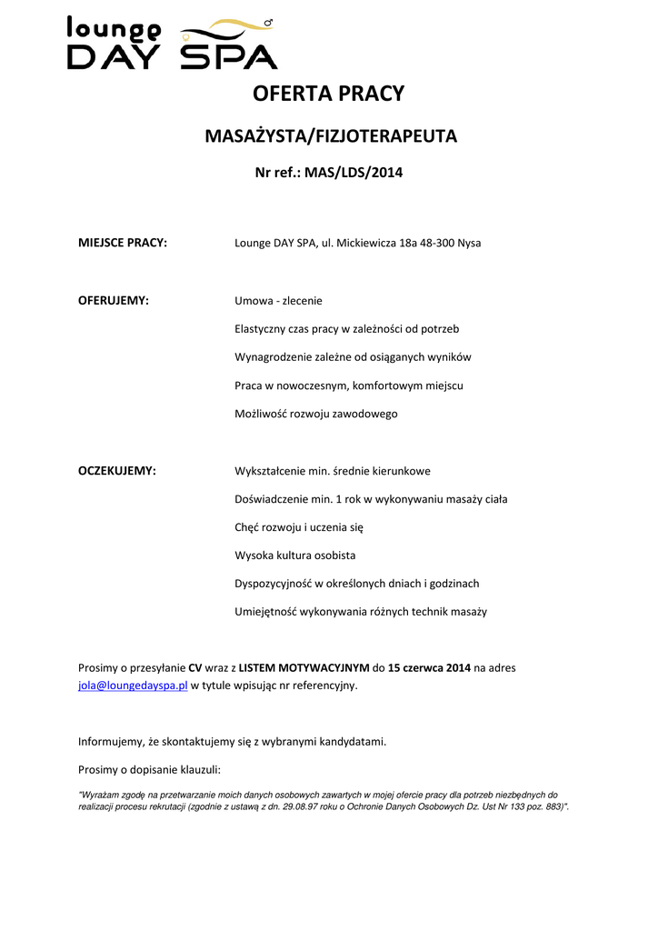 OFERTA PRACY MASAŻYSTA/FIZJOTERAPEUTA Nr ref.: MAS/LDS/2014 MIEJSCE PRACY: Lounge DAY SPA, ul. Mickiewicza 18a 48-300 Nysa OFERUJEMY: Umowa - zlecenie Elastyczny czas pracy w zależności od potrzeb Wynagrodzenie zależne od osiąganych wyników Praca w nowoczesnym, komfortowym miejscu Możliwość rozwoju zawodowego OCZEKUJEMY: Wykształcenie min. średnie kierunkowe Doświadczenie min. 1 rok w wykonywaniu masaży ciała Chęć rozwoju i uczenia się Wysoka kultura osobista Dyspozycyjność w określonych dniach i godzinach Umiejętność wykonywania różnych technik masaży Prosimy o przesyłanie CV wraz z LISTEM MOTYWACYJNYM do 15 czerwca 2014 na adres [email protected] w tytule wpisując nr referencyjny. Informujemy, że skontaktujemy się z wybranymi kandydatami. Prosimy o dopisanie klauzuli: "Wyrażam zgodę na przetwarzanie moich danych osobowych zawartych w mojej ofercie pracy dla potrzeb niezbędnych do realizacji procesu rekrutacji (zgodnie z ustawą z dn. 29.08.97 roku o Ochronie Danych Osobowych Dz. Ust Nr 133 poz. 883)".