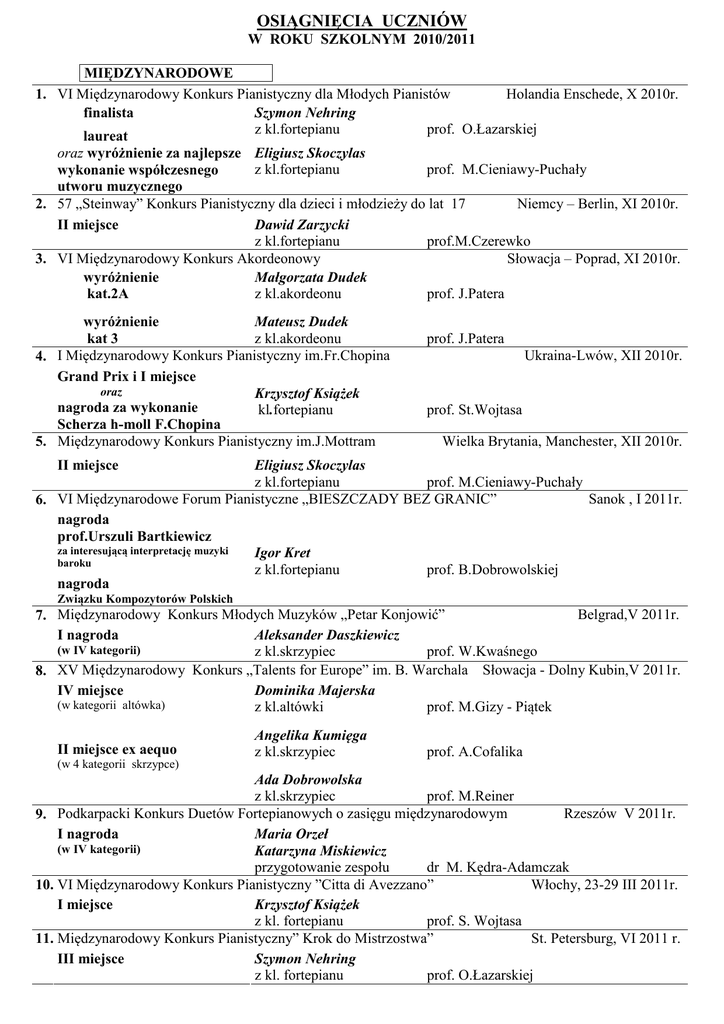 OSIĄGNIĘCIA UCZNIÓW W ROKU SZKOLNYM 2010/2011 MIĘDZYNARODOWE Holandia Enschede, X 2010r. 1. VI Międzynarodowy Konkurs Pianistyczny dla Młodych Pianistów finalista Szymon Nehring z kl.fortepianu prof. O.Łazarskiej laureat oraz wyróżnienie za najlepsze Eligiusz Skoczylas z kl.fortepianu prof. M.Cieniawy-Puchały wykonanie współczesnego utworu muzycznego Niemcy – Berlin, XI 2010r. 2. 57 „Steinway” Konkurs Pianistyczny dla dzieci i młodzieży do lat 17 II miejsce Dawid Zarzycki z kl.fortepianu prof.M.Czerewko Słowacja – Poprad, XI 2010r. 3. VI Międzynarodowy Konkurs Akordeonowy wyróżnienie Małgorzata Dudek z kl.akordeonu prof. J.Patera kat.2A wyróżnienie Mateusz Dudek z kl.akordeonu kat 3 4. I Międzynarodowy Konkurs Pianistyczny im.Fr.Chopina Grand Prix i I miejsce oraz Krzysztof Książek nagroda za wykonanie kl.fortepianu Scherza h-moll F.Chopina 5. Międzynarodowy Konkurs Pianistyczny im.J.Mottram prof. J.Patera Ukraina-Lwów, XII 2010r. prof. St.Wojtasa Wielka Brytania, Manchester, XII 2010r. II miejsce Eligiusz Skoczylas z kl.fortepianu prof. M.Cieniawy-Puchały Sanok , I 2011r. 6. VI Międzynarodowe Forum Pianistyczne „BIESZCZADY BEZ GRANIC” nagroda prof.Urszuli Bartkiewicz za interesującą interpretację muzyki Igor Kret baroku z kl.fortepianu prof. B.Dobrowolskiej nagroda Związku Kompozytorów Polskich Belgrad,V 2011r. 7. Międzynarodowy Konkurs Młodych Muzyków „Petar Konjowić” I nagroda Aleksander Daszkiewicz (w IV kategorii) z kl.skrzypiec prof. W.Kwaśnego 8. XV Międzynarodowy Konkurs „Talents for Europe” im. B. Warchala Słowacja - Dolny Kubin,V 2011r. IV miejsce Dominika Majerska (w kategorii altówka) z kl.altówki prof. M.Gizy - Piątek II miejsce ex aequo Angelika Kumięga z kl.skrzypiec prof. A.Cofalika (w 4 kategorii skrzypce) Ada Dobrowolska z kl.skrzypiec prof. M.Reiner Rzeszów V 2011r. 9. Podkarpacki Konkurs Duetów Fortepianowych o zasięgu międzynarodowym I nagroda Maria Orzeł (w IV kategorii) Katarzyna Miskiewicz przygotowanie zespołu dr M. Kędra-Adamczak Włochy, 23-29 III 2011r. 10. VI Międzynarodowy Konkurs Pianistyczny ”Citta di Avezzano” I miejsce Krzysztof Książek z kl. fortepianu prof. S. Wojtasa Międzynarodowy Konkurs Pianistyczny” Krok do Mistrzostwa” St. Petersburg, VI 2011 r. 11. III miejsce Szymon Nehring z kl. fortepianu prof. O.Łazarskiej 1. 2. 3. 4. OGÓLNOPOLSKIE 44 Festiwal Pianistyki Polskiej„EstradaMłodych” laureat Krzysztof Książek z kl. fortepianu Ogólnopolski Konkurs Wiedzy o Konkursach Chopinowskich II miejsce Agnieszka Żabińska przygotowanie . VII Ogólnopolski Konkurs Wibrafonowy Jakub Frączek II miejsce (kategoria zespoły kameralne) Grzegorz Pałka przygotowanie zespołu II miejsce Adam Wygoda (kategoria solistów) z kl. perkusji X Ogólnopolski Konkurs Kameralistyki Fortepianowej Słupsk , IX 2010r. prof. S. Wojtasa Łomża , IX 2010r. prof. H. Pianowska Opole, X 2010r. prof. L. Olejniczak prof. A. Ciborowskiego Toruń, 25.XI 2010r. Katarzyna Miśkiewicz Maria Orzeł przygotowanie zespołu dr M. Kędra-Adamczak Płock, XI 2010r. 5. XI Ogólnopolski Konkurs Pianistyczny im.L.Stefańskiego i H.Czerny-Stefańskiej Szymon Nehring wyróżnienie z kl. fortepianu prof. O. Łazarskiej Kraków, XI 2010r. 6. II Krakowski Ogólnopolski Konkurs Organowy wyróżnienie Julian Gołosz z kl. organów prof. M.Tuleji Warszawa XI 2010r. 7. Ogólnopolskie Przesłuchania CEA uczniów klas organów.- cz. nagraniowa I miejsce duet fortepianowy III miejsce Julian Gołosz z kl. organów 8. III Konkurs Pianistyczny im. Ireny Rolanowskiej. Magdalena Zębala z kl. fortepianu 9. III Ogólnopolski Konkurs im Grobliczów wyróżnienie Kumięga Angelika (grupa młodsza) z kl. skrzypiec prof. M.Tuleji Kraków, XI 2010r. III miejsce w gr. III prof.A.Nowak-Dańdy Kraków, XII 2010r. prof. A. Cofalika III nagroda Nowak Agata z kl. skrzypiec 10 Ogólnopolski Konkurs Kameralny ( grupa starsza) prof. A .Cofalika Katowice, III 2011r. I nagroda duet fortepianowy Maria Orzeł Katarzyna Miśkiewicz przygotowanie zespołu dr M. Kędra-Adamczak 11 I Krakowski Konkurs Smyczkowy Młodych Talentów (zasięg ogólnopolski) Kraków, III 2011r. II miejsce Konrad Krzysztofiak z kl. altówki prof. E.Mazurkowskiej-Morasiewicz 12 XV Międzynarodowy Mistrzowski Młodzieżowy Kurs Muzyczny Warszawa, III 2011 r. zakwalifikowano do udziału w Aleksandre Daszkiewicz kursie w Calgary (Kanada) z kl. skrzypiec 13 Ogólnopolskie Przesłuchania Zespołów Kameralnych CEA Katarzyna Miśkiewicz I miejsce Maria Orzeł duet fortepianowy II miejsce kwintet fortepianowy Eligiusz Skoczylas Aleksander Daszkiewicz Ada Dobrowolska Dominika Majerska Alicja Kozak prof. W. Kwaśnego Warszawa, III 2011r. przygotowanie zespołu dr M. Kędra-Adamczak przygotowanie zespołu prof. M. Giza-Piątek 14 33 Ogólnopolski Konkurs Zespołów Kameralnych II miejsce duet fortepianowy III miejsce ex Equo kwintet fortepianowy duet perkusyjny Wrocław, III 2011r. Maria Orzeł Katarzyna Miśkiewicz przygotowanie zespołu dr M. Kędra-Adamczak Eligiusz Skoczylas Aleksander Daszkiewicz Ada Dobrowolska Dominika Majerska Alicja Kozak przygotowanie zespołu prof. M. Giza-Piątek Jakub Frączek Grzegorz Pałka przygotowanie zespołu prof. L. Olejniczak 15 V Wrocławski Konkurs Młodych Altowiolistów 16 17 18 19 Wrocław, IV 2011r. II miejsce ( w starszej grupie) laureat (za najlepsze Dominika Majerska wykonanie utworu z kl. altówki obowiązkowego w grupie II) XIV Gorlickie Konfrontacje Akordeonowe II nagroda (w kategorii II) Małgorzata Dudek z kl.akordeonu Mateusz Dudek II nagroda (w kategorii III) z kl. akordeonu VI Ogólnopolski Konkurs Młodych Instrumentalistów Katarzyna Szydłowska z kl.skrzypiec III miejsce ex Equo Szymon Michalik z kl fagotu III Ogólnopolski Konkurs Gitarowy Dominik Toczek III miejsce z kl.gitary XX Mistrzostwa Polski Juniorów TAEKWON-DO prof. M.Gizy-Piątek Gorlice, IV 2011r. prof. J.Patera prof. J.Patera Jasło, IV 2011r. prof. A.Cofa
