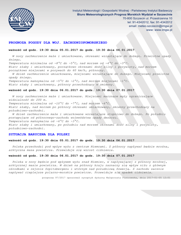 Instytut Meteorologii i Gospodarki Wodnej - Państwowy Instytut Badawczy Biuro Meteorologicznych Prognoz Morskich Wydział w Szczecinie 70-800 Szczecin ul. Przestrzenna 10 tel: 91-4342012, fax: 91-4342012 email: [email protected] www: www.imgw.pl PROGNOZA POGODY DLA WOJ. ZACHODNIOPOMORSKIEGO ważność od godz. 19:30 dnia 05.01.2017 do godz. 19:30 dnia 06.01.2017 W nocy zachmurzenie małe i umiarkowane, okresami wzrastające do dużego. Przelotne opady śniegu. Temperatura minimalna od -8°C do -5°C, nad morzem od -4°C do -3°C. Wiatr słaby i umiarkowany, początkowo okresami dość silny i porywisty, nad morzem początkowo miejscami w porywach do 60 km/h, północny. W dzień zachmurzenie umiarkowane, miejscami wzrastające do dużego. Miejscami przelotne opady śniegu. Temperatura maksymalna od -5°C do -2°C, nad morzem miejscami -1°C. Wiatr słaby i umiarkowany, północy przechodzący w zmienny. ważność od godz. 19:30 dnia 06.01.2017 do godz. 19:30 dnia 07.01.2017 W nocy zachmurzenie małe i umiarkowane. Miejscami marznące mgły ograniczające widzialność do 200 m. Temperatura minimalna od -10°C do -7°C, nad morzem -6°C. Wiatr słaby, nad morzem po północy okresami umiarkowany, zmienny przechodzący na południowo-zachodni. W dzień zachmurzenie małe i umiarkowane wzrastające stopniowo do dużego. Po południu postępujące od północnego-zachodu województwa opady deszczu. Temperatura maksymalna od -6°C do -3°C. Wiatr słaby i umiarkowany, po południu nad morzem okresami dość silny i porywisty, południowo-zachodni. SYTUACJA BARYCZNA DLA POLSKI ważność od godz. 19:30 dnia 05.01.2017 do godz. 19:30 dnia 06.01.2017 Polska przechodzi pod wpływ wyżu z centrum Niemcami. Z północy napływać będzie mroźna, arktyczna masa powietrza. Przewiduje się wzrost ciśnienia. ważność od godz. 19:30 dnia 06.01.2017 do godz. 19:30 dnia 07.01.2017 Polska w nocy będzie pod wpływem wyżu znad Niemiec, w napływającej z północy mroźnej, arktycznej masie powietrza. W dzień na północy kraju zaznaczy się wpływ niżu z głównym ośrodkami w rejonie Szpitsbergenu i wtórnym nad południową Szwecją. Z zachodu zacznie napływać cieplejsze polarno-morskie powietrze. Przewiduje się spadek ciśnienia. prognozę 97/2017 opracował synoptyk dyżurny Małgorzata Piotrowska, dnia 2017-01-05 12:01