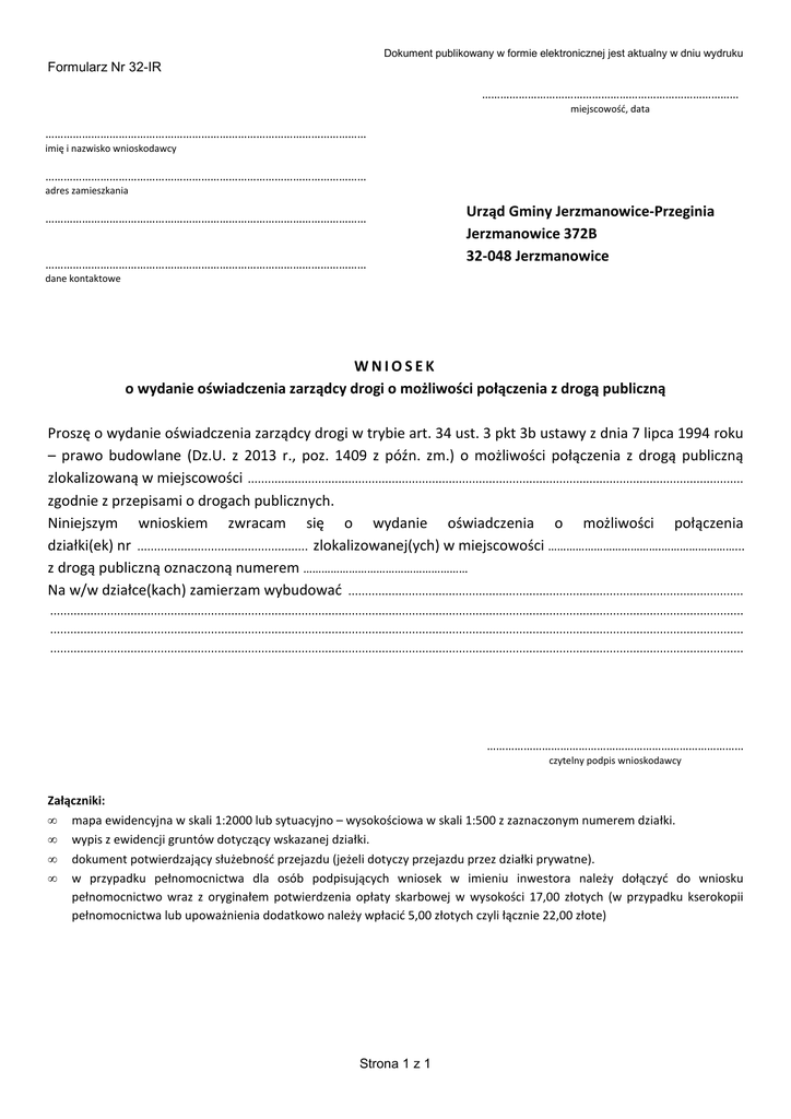Dokument publikowany w formie elektronicznej jest aktualny w dniu wydruku Formularz Nr 32-IR ………………………………………………………………………… miejscowość, data …………………………………………………………………………………………… imię i nazwisko wnioskodawcy …………………………………………………………………………………………… adres zamieszkania …………………………………………………………………………………………… …………………………………………………………………………………………… Urząd Gminy Jerzmanowice-Przeginia Jerzmanowice 372B 32-048 Jerzmanowice dane kontaktowe WNIOSEK o wydanie oświadczenia zarządcy drogi o możliwości połączenia z drogą publiczną Proszę o wydanie oświadczenia zarządcy drogi w trybie art. 34 ust. 3 pkt 3b ustawy z dnia 7 lipca 1994 roku – prawo budowlane (Dz.U. z 2013 r., poz. 1409 z późn. zm.) o możliwości połączenia z drogą publiczną zlokalizowaną w miejscowości .................................................................................................................................................... zgodnie z przepisami o drogach publicznych. Niniejszym wnioskiem zwracam się o wydanie oświadczenia o możliwości połączenia działki(ek) nr ................................................... zlokalizowanej(ych) w miejscowości ……………………………….……………………... z drogą publiczną oznaczoną numerem ……………………………………………… Na w/w działce(kach) zamierzam wybudować ...................................................................................................................... ............................................................................................................................................................................................................... ............................................................................................................................................................................................................... ............................................................................................................................................................................................................... ………………………………………………………………………… czytelny podpis wnioskodawcy Załączniki: • mapa ewidencyjna w skali 1:2000 lub sytuacyjno – wysokościowa w skali 1:500 z zaznaczonym numerem działki. • wypis z ewidencji gruntów dotyczący wskazanej działki. • dokument potwierdzający służebność przejazdu (jeżeli dotyczy przejazdu przez działki prywatne). • w przypadku pełnomocnictwa dla osób podpisujących wniosek w imieniu inwestora należy dołączyć do wniosku pełnomocnictwo wraz z oryginałem potwierdzenia opłaty skarbowej w wysokości 17,00 złotych (w przypadku kserokopii pełnomocnictwa lub upoważnienia dodatkowo należy wpłacić 5,00 złotych czyli łącznie 22,00 złote) Strona 1 z 1