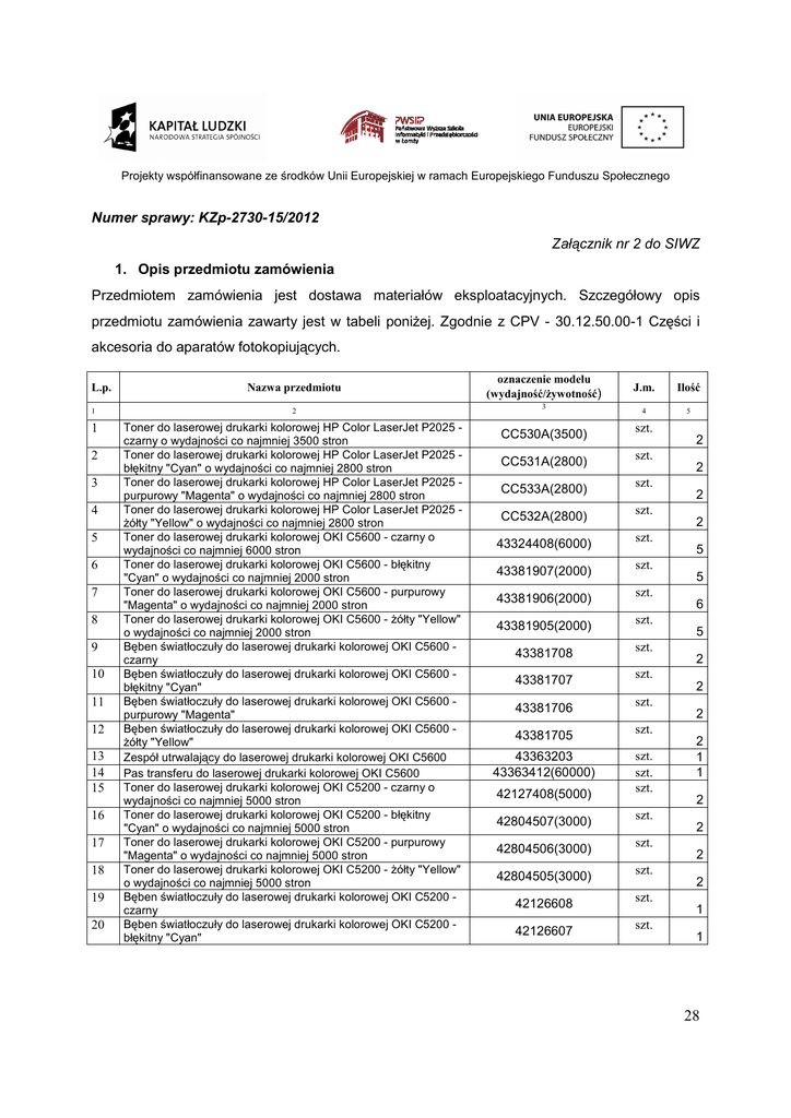 Projekty współfinansowane ze środków Unii Europejskiej w ramach Europejskiego Funduszu Społecznego Numer sprawy: KZp-2730-15/2012 Załącznik nr 2 do SIWZ 1. Opis przedmiotu zamówienia Przedmiotem zamówienia jest dostawa materiałów eksploatacyjnych. Szczegółowy opis przedmiotu zamówienia zawarty jest w tabeli poniŜej. Zgodnie z CPV - 30.12.50.00-1 Części i akcesoria do aparatów fotokopiujących. L.p. Nazwa przedmiotu 1 2 1 Toner do laserowej drukarki kolorowej HP Color LaserJet P2025 czarny o wydajności co najmniej 3500 stron Toner do laserowej drukarki kolorowej HP Color LaserJet P2025 błękitny "Cyan" o wydajności co najmniej 2800 stron Toner do laserowej drukarki kolorowej HP Color LaserJet P2025 purpurowy "Magenta" o wydajności co najmniej 2800 stron Toner do laserowej drukarki kolorowej HP Color LaserJet P2025 Ŝółty "Yellow" o wydajności co najmniej 2800 stron Toner do laserowej drukarki kolorowej OKI C5600 - czarny o wydajności co najmniej 6000 stron Toner do laserowej drukarki kolorowej OKI C5600 - błękitny "Cyan" o wydajności co najmniej 2000 stron Toner do laserowej drukarki kolorowej OKI C5600 - purpurowy "Magenta" o wydajności co najmniej 2000 stron Toner do laserowej drukarki kolorowej OKI C5600 - Ŝółty "Yellow" o wydajności co najmniej 2000 stron Bęben światłoczuły do laserowej drukarki kolorowej OKI C5600 czarny Bęben światłoczuły do laserowej drukarki kolorowej OKI C5600 błękitny "Cyan" Bęben światłoczuły do laserowej drukarki kolorowej OKI C5600 purpurowy "Magenta" Bęben światłoczuły do laserowej drukarki kolorowej OKI C5600 Ŝółty "Yellow" Zespół utrwalający do laserowej drukarki kolorowej OKI C5600 Pas transferu do laserowej drukarki kolorowej OKI C5600 Toner do laserowej drukarki kolorowej OKI C5200 - czarny o wydajności co najmniej 5000 stron Toner do laserowej drukarki kolorowej OKI C5200 - błękitny "Cyan" o wydajności co najmniej 5000 stron Toner do laserowej drukarki kolorowej OKI C5200 - purpurowy "Magenta" o wydajności co najmniej 5000 stron Toner do laserowej drukarki kolorowej OKI C5200 - Ŝółty "Yellow" o wydajności co najmniej 5000 stron Bęben światłoczuły do laserowej drukarki kolorowej OKI C5200 czarny Bęben światłoczuły do laserowej drukarki kolorowej OKI C5200 błękitny "Cyan" 2 3 4 5 6 7 8 9 10 11 12 13 14 15 16 17 18 19 20 oznaczenie modelu (wydajność/Ŝywotność) 3 J.m. Ilość 4 5 CC530A(3500) szt. CC531A(2800) szt. CC533A(2800) szt. CC532A(2800) szt. 43324408(6000) szt. 43381907(2000) szt. 43381906(2000) szt. 43381905(2000) szt. 43381708 szt. 43381707 szt. 43381706 szt. 43381705 szt. 43363203 43363412(60000) 42127408(5000) szt. szt. szt. 42804507(3000) szt. 42804506(3000) szt. 42804505(3000) szt. 42126608 szt. 42126607 szt. 2 2 2 2 5 5 6 5 2 2 2 2 1 1 2 2 2 2 1 1 28 Projekty współfinansowane ze środków Unii Europejskiej w ramach Europejskiego Funduszu Społecznego 21 22 23 24 25 26 27 28 29 30 31 32 33 34 35 36 37 38 39 40 41 42 43 44 45 46 47 Bęben światłoczuły do laserowej drukarki kolorowej OKI C5200 purpurowy "Magenta" Bęben światłoczuły do laserowej drukarki kolorowej OKI C5200 Ŝółty "Yellow" Zespół utrwalający do laserowej drukarki kolorowej OKI C5200 Pas transferu do laserowej drukarki kolorowej OKI C5200 Toner do laserowej drukarki kolorowej OKI C610 - czarny o wydajności co najmniej 8000 stron Toner do laserowej drukarki kolorowej OKI C610 - błękitny "Cyan" o wydajności co najmniej 6000 stron Toner do laserowej drukarki kolorowej OKI C610 - purpurowy "Magenta" o wydajności co najmniej 6000 stron Toner do laserowej drukarki kolorowej OKI C610 - Ŝółty "Yellow" o wydajności co najmniej 6000 stron Bęben światłoczuły do laserowej drukarki kolorowej OKI C610 czarny Bęben światłoczuły do laserowej drukarki kolorowej OKI C610 błękitny "Cyan" Bęben światłoczuły do laserowej drukarki kolorowej OKI C610 purpurowy "Magenta" Bęben światłoczuły do laserowej drukarki kolorowej OKI C610 Ŝółty "Yellow" Zespół utrwalający do laserowej drukarki kolorowej OKI C610 Pas transferu do laserowej drukarki kolorowej OKI C610 Toner do laserowego kolorowego urządzenia wielofunkcyjnego Kyocera FS-2026MFP - czarny o wydajności co najmniej 7000 stron Toner do laserowego kolorowego urządzenia wielofunkcyjnego Kyocera FS-2026MFP - błękitny "Cyan" o wydajności co najmniej 5000 stron Toner do laserowego kolorowego urządzenia wielofunkcyjnego Kyocera FS-2026MFP - purpurowy "Magenta" o wydajności co najmniej 5000 stron Toner do laserowego kolorowego urządzenia wielofunkcyjnego Kyocera FS-2026MFP - Ŝółty "Yellow" o wydajności co najmniej 5000 stron Toner do laserowej drukarki monochromatycznej HP LaserJet P2055 o wydajności co najmniej 6500 stron Toner do laserowej drukarki monochromatycznej HP LaserJet P1006 o wydajności co najmniej 1500 stron Toner do laserowej drukarki monochromatycznej HP LaserJet P2015, HP LaserJet 2727 NFS o wydajności co najmniej 7000 stron Toner do laserowej drukarki monochromatycznej HP LaserJet 1018 o wydajności co najmniej 2000 stron Toner do laserowej drukarki monochromatycznej HP LaserJet 1320, HP LaserJet 3390 o wydajności co najmniej 6000 stron Toner do laserowej drukarki monochromatycznej HP LaserJet 2300 o wydajności co najmniej 6000 stron Toner do laserowej drukarki monochromatycznej HP LaserJet 2420 o wydajności co najmniej 12000 stron Toner do laserowej drukarki monochromatycznej HP LaserJet 1566 o wydajności co najmniej 2100 stron Toner do laserowej drukarki monochromatycznej HP LaserJet 42126606 szt. 42127405 szt 42625503 42158712 44315308(8000) szt szt szt. 44315307(6000) szt. 44315306(6000) szt. 44315305(6000) szt. 44315108(20000) szt. 44315107(20000) szt. 44315106(20000) szt. 44315105(20000) szt. 44289103(60000) 44341902(60000) szt. szt. szt. 1 1 1 1 2 2 2 2 1 1 1 1 1 1 TK-590K(7000) 2 szt. TK-590C(5000) 2 szt. TK-590M(5000) 2 szt. TK-590Y(5000) 2 CE505X(6500) szt. 35A(1500) szt. 20 5 szt. 53X