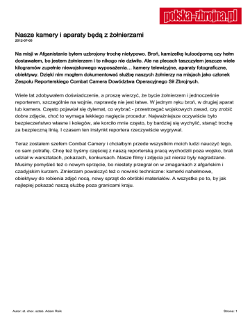 Nasze kamery i aparaty będą z żołnierzami 2012-07-05 Na misji w Afganistanie byłem uzbrojony trochę nietypowo. Broń, kamizelkę kuloodporną czy hełm dostawałem, bo jestem żołnierzem i to nikogo nie dziwiło. Ale na plecach taszczyłem jeszcze wiele kilogramów zupełnie niewojskowego wyposażenia… kamery telewizyjne, aparaty fotograficzne, obiektywy. Dzięki nim mogłem dokumentować służbę naszych żołnierzy na misjach jako członek Zespołu Reporterskiego Combat Camera Dowództwa Operacyjnego Sił Zbrojnych. Wiele lat zdobywałem doświadczenie, a proszę wierzyć, że bycie żołnierzem i jednocześnie reporterem, szczególnie na wojnie, naprawdę nie jest łatwe. W jednym ręku broń, w drugiej aparat lub kamera. Często pojawiał się dylemat, co wybrać - przestrzegać wojskowych zasad, czy zrobić dobre zdjęcie, choć to wymaga lekkiego nagięcia procedur. Najważniejsze oczywiście było bezpieczeństwo własne i kolegów, ale korciło mnie często, by bardziej się wychylić, stanąć trochę za bezpieczną linią. I czasem ten instynkt reportera rzeczywiście wygrywał. Teraz zostałem szefem Combat Camery i chciałbym przede wszystkim moich ludzi nauczyć tego, co sam potrafię. Chcę też byśmy częściej z naszą reporterską pracą wychodzili poza wojsko, brali udział w warsztatach, pokazach, konkursach. Nasze filmy i zdjęcia już nieraz były nagradzane. Musimy pomyśleć też o nowym sprzęcie, bo niestety przegrał on w zmaganiach z afgańskim i czadyjskim kurzem. Zmierzam powalczyć też o nowinki techniczne: kamerki nahełmowe, obiektywy do robienia zdjęć nocą, nowy sprzęt do obróbki materiałów. A wszystko po to, by jak najlepiej pokazać naszą służbę poza granicami kraju. Autor: st. chor. sztab. Adam Roik Strona: 1