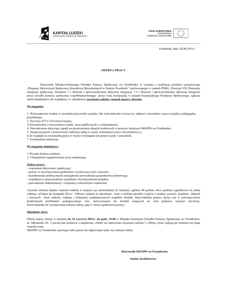 Frombork, dnia 02.06.2011r. OFERTA PRACY Kierownik Miejsko-Gminnego Ośrodka Pomocy Społecznej we Fromborku w związku z realizacją projektu systemowego „Program Aktywizacji Społeczno-Zawodowej Bezrobotnych w Gminie Frombork” realizowanego w ramach POKL, Priorytet VII, Promocja integracji społecznej, Działanie 7.1 Rozwój i upowszechnienie aktywnej integracji, 7.1.1 Rozwój i upowszechnianie aktywnej integracji przez ośrodki pomocy społecznej współfinansowanego przez Unię Europejską w ramach Europejskiego Funduszu Społecznego, ogłasza nabór kandydatów do współpracy w charakterze asystenta rodziny ramach umowy zlecenia Wymagania: 1. Wykształcenie średnie w zawodzie pracownik socjalny, lub wykształcenie wyższe na jednym z kierunków: praca socjalna, pedagogika, psychologia, 2. Życiorys (CV) i list motywacyjny, 3.Oświadczenie o korzystaniu w pełni praw publicznych i o niekaralności, 4. Oświadczenie dotyczące zgody na przetwarzanie danych osobowych w procesie rekrutacji MGOPS we Fromborku, 5. Dyspozycyjność ( konieczność realizacji usług w czasie wskazanym przez zleceniodawcę ), 6.Ze względu na ewentualną pracę w terenie wymagane jest prawo jazdy i samochód, 7. Ewentualnie referencje. Wymagania dodatkowe: 1.Wysoka kultura osobista , 2. Umiejętność organizowania życia rodzinnego, Zakres pracy: - wspieranie aktywności społecznej, - pomoc w rozwiązywaniu problemów wychowawczych z dziećmi, - kształtowanie praktycznych umiejętności prowadzenia gospodarstwa domowego, - współpraca z pracownikiem socjalnym i koordynatorem projektu, - prowadzenie dokumentacji związanej z udzielonym wsparciem. Asystent rodziny będzie wspierał rodzinę w miejscu jej zamieszkania (2 rodziny), ogółem 80 godzin, dwie godziny tygodniowo na jedną rodzinę, od lipca do listopada 2011r. Główne zadania to określenie wraz z rodziną sposobu wyjścia z trudnej sytuacji, ustalenie słabych i mocnych stron rodziny, rodzaju i kolejności podejmowanych wspólnie działań. Indywidualna pomoc służyć ma w rozwiązywaniu konkretnych problemów podopiecznego oraz motywowanie do działań mających na celu poprawę sytuacji życiowej. Koszt dojazdu do wyznaczonej rodziny należy ująć w stawce godzinowej pracy. Składanie ofert: Ofertę należy złożyć w terminie do 22 czerwca 2011r. do godz. 15.00 w Miejsko-Gminnym Ośrodku Pomocy Społecznej we Fromborku, ul. Młynarska 5b, ( pocztą lub osobiście z dopiskiem „Nabór na stanowisko asystenta rodziny”). Oferty, które wpłyną po terminie nie będą rozpatrywane. MGOPS we Fromborku zastrzega sobie prawo do odpowiedzi tylko na wybrane oferty. Kierownik MGOPS we Fromborku Janina Jachimowicz
