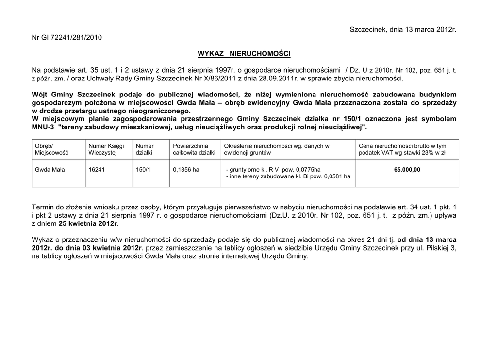 Szczecinek, dnia 13 marca 2012r. Nr GI 72241/281/2010 WYKAZ NIERUCHOMOŚCI Na podstawie art. 35 ust. 1 i 2 ustawy z dnia 21 sierpnia 1997r. o gospodarce nieruchomościami / Dz. U z 2010r. Nr 102, poz. 651 j. t. z późn. zm. / oraz Uchwały Rady Gminy Szczecinek Nr X/86/2011 z dnia 28.09.2011r. w sprawie zbycia nieruchomości. Wójt Gminy Szczecinek podaje do publicznej wiadomości, że niżej wymieniona nieruchomość zabudowana budynkiem gospodarczym położona w miejscowości Gwda Mała – obręb ewidencyjny Gwda Mała przeznaczona została do sprzedaży w drodze przetargu ustnego nieograniczonego. W miejscowym planie zagospodarowania przestrzennego Gminy Szczecinek działka nr 150/1 oznaczona jest symbolem MNU-3 "tereny zabudowy mieszkaniowej, usług nieuciążliwych oraz produkcji rolnej nieuciążliwej". Obręb/ Miejscowość Numer Księgi Wieczystej Numer działki Powierzchnia całkowita działki Gwda Mała 16241 150/1 0,1356 ha Określenie nieruchomości wg. danych w ewidencji gruntów - grunty orne kl. R V pow. 0,0775ha - inne tereny zabudowane kl. Bi pow. 0,0581 ha Cena nieruchomości brutto w tym podatek VAT wg stawki 23% w zł 65.000,00 Termin do złożenia wniosku przez osoby, którym przysługuje pierwszeństwo w nabyciu nieruchomości na podstawie art. 34 ust. 1 pkt. 1 i pkt 2 ustawy z dnia 21 sierpnia 1997 r. o gospodarce nieruchomościami (Dz.U. z 2010r. Nr 102, poz. 651 j. t. z późn. zm.) upływa z dniem 25 kwietnia 2012r. Wykaz o przeznaczeniu w/w nieruchomości do sprzedaży podaje się do publicznej wiadomości na okres 21 dni tj. od dnia 13 marca 2012r. do dnia 03 kwietnia 2012r. przez zamieszczenie na tablicy ogłoszeń w siedzibie Urzędu Gminy Szczecinek przy ul. Pilskiej 3, na tablicy ogłoszeń w miejscowości Gwda Mała oraz stronie internetowej Urzędu Gminy.