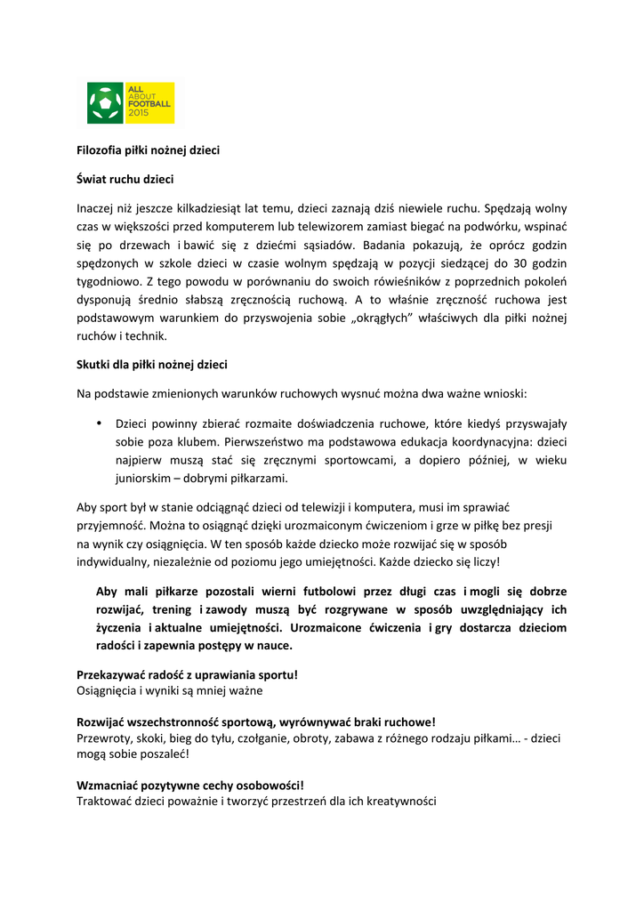 Filozofia piłki nożnej dzieci Świat ruchu dzieci Inaczej niż jeszcze kilkadziesiąt lat temu, dzieci zaznają dziś niewiele ruchu. Spędzają wolny czas w większości przed komputerem lub telewizorem zamiast biegać na podwórku, wspinać się po drzewach i bawić się z dziećmi sąsiadów. Badania pokazują, że oprócz godzin spędzonych w szkole dzieci w czasie wolnym spędzają w pozycji siedzącej do 30 godzin tygodniowo. Z tego powodu w porównaniu do swoich rówieśników z poprzednich pokoleń dysponują średnio słabszą zręcznością ruchową. A to właśnie zręczność ruchowa jest podstawowym warunkiem do przyswojenia sobie „okrągłych” właściwych dla piłki nożnej ruchów i technik. Skutki dla piłki nożnej dzieci Na podstawie zmienionych warunków ruchowych wysnuć można dwa ważne wnioski: • Dzieci powinny zbierać rozmaite doświadczenia ruchowe, które kiedyś przyswajały sobie poza klubem. Pierwszeństwo ma podstawowa edukacja koordynacyjna: dzieci najpierw muszą stać się zręcznymi sportowcami, a dopiero później, w wieku juniorskim – dobrymi piłkarzami. Aby sport był w stanie odciągnąć dzieci od telewizji i komputera, musi im sprawiać przyjemność. Można to osiągnąć dzięki urozmaiconym ćwiczeniom i grze w piłkę bez presji na wynik czy osiągnięcia. W ten sposób każde dziecko może rozwijać się w sposób indywidualny, niezależnie od poziomu jego umiejętności. Każde dziecko się liczy! Aby mali piłkarze pozostali wierni futbolowi przez długi czas i mogli się dobrze rozwijać, trening i zawody muszą być rozgrywane w sposób uwzględniający ich życzenia i aktualne umiejętności. Urozmaicone ćwiczenia i gry dostarcza dzieciom radości i zapewnia postępy w nauce. Przekazywać radość z uprawiania sportu! Osiągnięcia i wyniki są mniej ważne Rozwijać wszechstronność sportową, wyrównywać braki ruchowe! Przewroty, skoki, bieg do tyłu, czołganie, obroty, zabawa z różnego rodzaju piłkami… -‐ dzieci mogą sobie poszaleć! Wzmacniać pozytywne cechy osobowości! Traktować dzieci poważnie i tworzyć przestrzeń dla ich kreatywności Uczyć piłki nożnej małymi krokami! Właściwy trening techniczny w sposób celowy rozpoczyna się najwcześniej od kategorii wiekowej E, taktyka dopiero od kategorii D Zwracać uwagę na każde dziecko! Każde ma swoje silny strony i każde jest zuchem! Poziom rozwojowy przedszkolaków Przedszkolaki potrafią się skoncentrować tylko na ograniczonej przestrzeni pola gry. Ich trudna do utrzymania uwaga wymaga wielu urozmaiceń, dlatego też gra powinna zapewniać liczne akcje ze strzałem do bramki i wysoki procent udziału w grze dla każdego dziecka. Jeśli chodzi o wymagania kondycyjne, są one niewielkie. Wszystkie te uwagi są argumentami przemawiającymi na korzyść małych i przejrzystych pól gry i niewielkich drużyn. Cechy fizyczne Nogi w porównaniu do ogólnej budowy ciała są jeszcze dość krótkie, mięśnie nie są mocno rozwinięte i pokryte poduszkami tłuszczowymi. Przedszkolaki nie potrafią jeszcze uprawiać sportu ukierunkowanego na cel – grają swobodnie starając się podążać za podanymi wskazówkami. Cechy psychospołeczne Ze względu na niewielkie zdolności koncentracyjne konieczna jest częsta zmiana wariantów gry. Dzieci na tym poziomie rozwojowym odkrywają swoje otoczenie przez intensywną obserwację i doświadczenia ruchowe. Cele dydaktyczne Naturalna chęć ruchu powinna być wspierana. Przedszkolaki potrzebują wielu doświadczeń ruchowych, z i bez piłki zebranych podczas swobodnej gry. Muszą mieć możliwość wyszalenia się! Kluby sportowe mają charakter wspólnot społecznych. Zgodnie z badaniami przeprowadzonymi przez Związek Sportowy Wirtembergii oprócz treningu prowadzonego kompetentnie i w zaangażowany sposób liczy się przede wszystkim atmosfera panująca w klubie. Decyduje ona w zasadniczy sposób o tym, czy dziecko zwiąże się z nim na dłużej. Trening piłki nożnej dzieci i postrzeganie osób prowadzących jako autorytetów tworzy podstawy do tworzenia silnych więzi z klubem na poziomie zarówno emocjonalnym jak i społecznym. Dla dzieci ważna jest, abyś: • • • • • • • miał do nich serce troszczył się zawsze o pozytywną bezstresową atmosferę na zajęciach znał sytuację życiową każdego z nich przekazywał pozytywne wartości i zasady uzgadniał wspólnie z nimi reguły gry okazywał zainteresowanie, reagował z humorem, grał razem z nimi często je chwalił • pielęgnował rytuały zespołowe Aspekty organizacyjne (rozgrywki) Aspekty organizacyjne podzielić można na dwie części. Jeśli chodzi o kluby, wielu trenerów walczy z popularnym stereotypem „chłopca do wszystkiego”. Niezapomniane wrażenia dzieci związane z rozgrywkami sportowymi mogą zostać zakłócone, jeśli przeniesie się na nie pośpiech i gorączka związana z ferworem ich przygotowań. Wsparcie opiekuna odciąża trenera i ma pozytywny wpływ także na dzieci. A przecież rozgrywki także z punktu widzenia związków sportowych organizowane są dla dobra dzieci. Następujące propozycje zapewnią dzieciom radość z gry i dostosowane do wieku postępy w nauce: • • • • Wielkość drużyn: wszyscy biorą udział w grze Rozmiary pola: krótkie drogi biegu, wiele akcji Zasady gry: proste i zrozumiałe Rozgrywki: brak presji na osiągnięcia, gra bez nadmiernych obciążeń Zawody: Radość i satysfakcja dla każdego dziecka