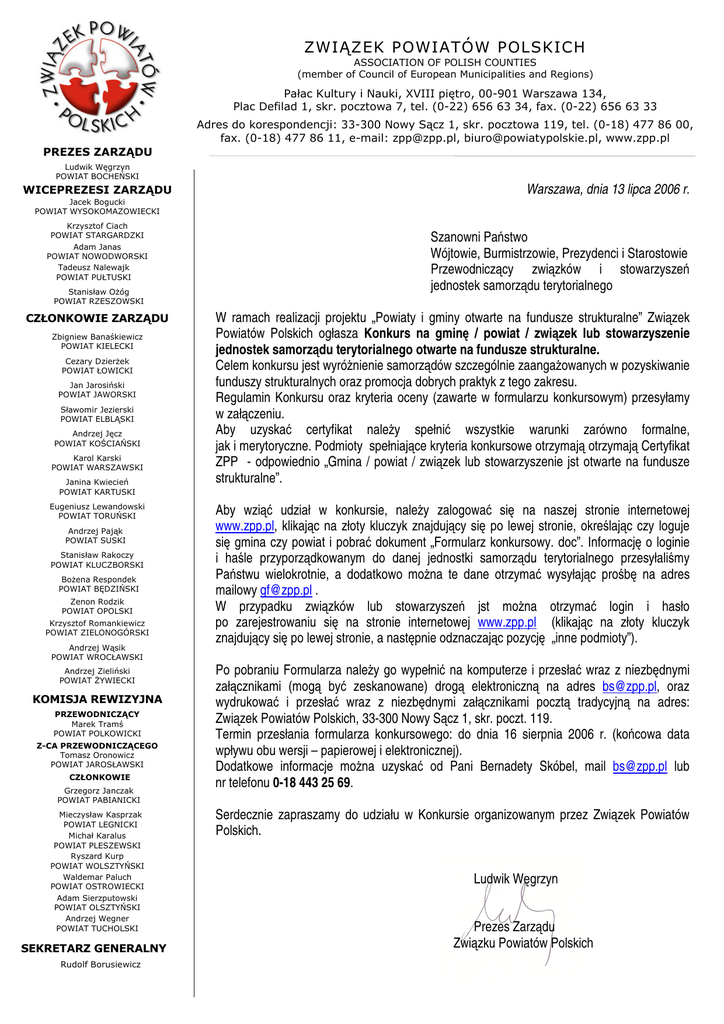 ! " ! 8 ! # $! %& ' $( !) ! # * ! +,-. /# ,001203 !$4!5!367, !%3,$+9 4#5!:,# 9 01;;(<=<<667, !>9 01;;(<=<<666 % $% + $ % ?@661600 5* A 43,$+9 4#5!332,# 9 013B(7::B<00, !>9 013B(7::B<33, 1 ! @4 C4 9 , C 5!# * $+ 9 ,5559 4 9 %5+ /' 4* D E Warszawa, dnia 13 lipca 2006 r. F ! +D ' + G " 4*$4# !K &L &8 %! F ! !$ 8 & !% $4 ! 5!? + M # ! $) !5 HI' & ' 5 D! !J+ 5 4 4!*84 H + M F ! F ! $N$+ F & ) !5 F 4 $+ D % 4 ?F /4 O E ! F ! !$+ & ! 5 & ' $4 N 5! % 5$+ & E % 4 ? !? A+ # ! $) !5 &!+ 4* D & D H !& $ % + DP8 E & %4+ 4*$4# & !+ 5 4 L & % 4 ? A$+ & M %4 ? N$+ QG "! + !$4 F& ! J 5 4 M L 4 ' 4F ! 4!+ D " 4*$) !5 !$ 4!+ L " K!) ! ! $ Szanowni Pa stwo Wójtowie, Burmistrzowie, Prezydenci i Starostowie Przewodnicz cy zwi zków i stowarzysze jednostek samorz du terytorialnego W ramach realizacji projektu „Powiaty i gminy otwarte na fundusze strukturalne” Zwi zek Powiatów Polskich ogłasza Konkurs na gmin / powiat / zwi zek lub stowarzyszenie jednostek samorz du terytorialnego otwarte na fundusze strukturalne. Celem konkursu jest wyró nienie samorz dów szczególnie zaanga owanych w pozyskiwanie funduszy strukturalnych oraz promocja dobrych praktyk z tego zakresu. Regulamin Konkursu oraz kryteria oceny (zawarte w formularzu konkursowym) przesyłamy w zał czeniu. Aby uzyska certyfikat nale y spełni wszystkie warunki zarówno formalne, jak i merytoryczne. Podmioty spełniaj ce kryteria konkursowe otrzymaj otrzymaj Certyfikat ZPP - odpowiednio „Gmina / powiat / zwi zek lub stowarzyszenie jst otwarte na fundusze strukturalne”. Aby wzi udział w konkursie, nale y zalogowa si na naszej stronie internetowej www.zpp.pl, klikaj c na złoty kluczyk znajduj cy si po lewej stronie, okre laj c czy loguje si gmina czy powiat i pobra dokument „Formularz konkursowy. doc”. Informacj o loginie i ha le przyporz dkowanym do danej jednostki samorz du terytorialnego przesyłali my Pa stwu wielokrotnie, a dodatkowo mo na te dane otrzyma wysyłaj c pro b na adres mailowy [email protected] . W przypadku zwi zków lub stowarzysze jst mo na otrzyma login i hasło po zarejestrowaniu si na stronie internetowej www.zpp.pl (klikaj c na złoty kluczyk znajduj cy si po lewej stronie, a nast pnie odznaczaj c pozycj „inne podmioty”). Po pobraniu Formularza nale y go wypełni na komputerze i przesła wraz z niezb dnymi zał cznikami (mog by zeskanowane) drog elektroniczn na adres [email protected], oraz wydrukowa i przesła wraz z niezb dnymi zał cznikami poczt tradycyjn na adres: Zwi zek Powiatów Polskich, 33-300 Nowy S cz 1, skr. poczt. 119. Termin przesłania formularza konkursowego: do dnia 16 sierpnia 2006 r. (ko cowa data wpływu obu wersji – papierowej i elektronicznej). Dodatkowe informacje mo na uzyska od Pani Bernadety Skóbel, mail [email protected] lub nr telefonu 0-18 443 25 69. Serdecznie zapraszamy do udziału w Konkursie organizowanym przez Zwi zek Powiatów Polskich. &*$4!% GE ! ! K & %! 4 #5$+ GE %4 ? ' !% &% D $5 4 Ludwik W grzyn Prezes Zarz du Zwi zku Powiatów Polskich
