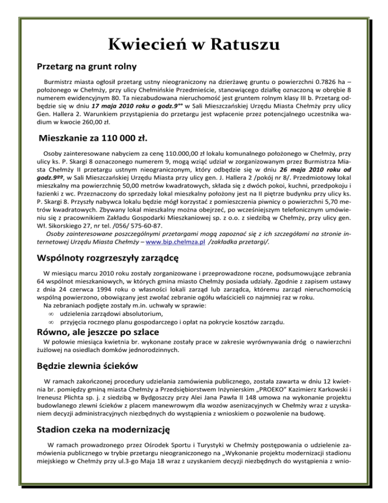 Kwiecień w Ratuszu Przetarg na grunt rolny Burmistrz miasta ogłosił przetarg ustny nieograniczony na dzierżawę gruntu o powierzchni 0.7826 ha – położonego w Chełmży, przy ulicy Chełmińskie Przedmieście, stanowiącego działkę oznaczoną w obrębie 8 numerem ewidencyjnym 80. Ta niezabudowana nieruchomość jest gruntem rolnym klasy III b. Przetarg odbędzie się w dniu 17 maja 2010 roku o godz.9°° w Sali Mieszczańskiej Urzędu Miasta Chełmży przy ulicy Gen. Hallera 2. Warunkiem przystąpienia do przetargu jest wpłacenie przez potencjalnego uczestnika wadium w kwocie 260,00 zł. Mieszkanie za 110 000 zł. Osoby zainteresowane nabyciem za cenę 110.000,00 zł lokalu komunalnego położonego w Chełmży, przy ulicy ks. P. Skargi 8 oznaczonego numerem 9, mogą wziąć udział w zorganizowanym przez Burmistrza Miasta Chełmży II przetargu ustnym nieograniczonym, który odbędzie się w dniu 26 maja 2010 roku od godz.9ºº, w Sali Mieszczańskiej Urzędu Miasta przy ulicy gen. J. Hallera 2 /pokój nr 8/. Przedmiotowy lokal mieszkalny ma powierzchnię 50,00 metrów kwadratowych, składa się z dwóch pokoi, kuchni, przedpokoju i łazienki z wc. Przeznaczony do sprzedaży lokal mieszkalny położony jest na II piętrze budynku przy ulicy ks. P. Skargi 8. Przyszły nabywca lokalu będzie mógł korzystać z pomieszczenia piwnicy o powierzchni 5,70 metrów kwadratowych. Zbywany lokal mieszkalny można obejrzeć, po wcześniejszym telefonicznym umówieniu się z pracownikiem Zakładu Gospodarki Mieszkaniowej sp. z o.o. z siedzibą w Chełmży, przy ulicy gen. Wł. Sikorskiego 27, nr tel. /056/ 575-60-87. Osoby zainteresowane poszczególnymi przetargami mogą zapoznać się z ich szczegółami na stronie internetowej Urzędu Miasta Chełmży – www.bip.chelmza.pl /zakładka przetargi/. Wspólnoty rozgrzeszyły zarządcę W miesiącu marcu 2010 roku zostały zorganizowane i przeprowadzone roczne, podsumowujące zebrania 64 wspólnot mieszkaniowych, w których gmina miasto Chełmży posiada udziały. Zgodnie z zapisem ustawy z dnia 24 czerwca 1994 roku o własności lokali zarząd lub zarządca, któremu zarząd nieruchomością wspólną powierzono, obowiązany jest zwołać zebranie ogółu właścicieli co najmniej raz w roku. Na zebraniach podjęte zostały m.in. uchwały w sprawie: • udzielenia zarządowi absolutorium, • przyjęcia rocznego planu gospodarczego i opłat na pokrycie kosztów zarządu. Równo, ale jeszcze po szlace W połowie miesiąca kwietnia br. wykonane zostały prace w zakresie wyrównywania dróg o nawierzchni żużlowej na osiedlach domków jednorodzinnych. Będzie zlewnia ścieków W ramach zakończonej procedury udzielania zamówienia publicznego, została zawarta w dniu 12 kwietnia br. pomiędzy gminą miasta Chełmży a Przedsiębiorstwem Inżynierskim „PROEKO” Kazimierz Karkowski i Ireneusz Plichta sp. j. z siedzibą w Bydgoszczy przy Alei Jana Pawła II 148 umowa na wykonanie projektu budowlanego zlewni ścieków z placem manewrowym dla wozów asenizacyjnych w Chełmży wraz z uzyskaniem decyzji administracyjnych niezbędnych do wystąpienia z wnioskiem o pozwolenie na budowę. Stadion czeka na modernizację W ramach prowadzonego przez Ośrodek Sportu i Turystyki w Chełmży postępowania o udzielenie zamówienia publicznego w trybie przetargu nieograniczonego na „Wykonanie projektu modernizacji stadionu miejskiego w Chełmży przy ul.3-go Maja 18 wraz z uzyskaniem decyzji niezbędnych do wystąpienia z wnio- 2 skiem o pozwolenie na budowę”, najkorzystniejszą ofertą na wykonanie w/w zadania okazała się oferta złożona przez Przedsiębiorstwo Projektowo-Budowlane „EKOBUD” s. c. Ewa i Remigiusz Owczarek Domosin II nr 89B. Oferent wykona projekt modernizacji stadionu za cenę 52.460,00 zł /brutto/. Ruszyła rewitalizacja Bulwaru 1000-lecia W kwietniu br. rozpoczęły się roboty budowlane związane z realizacją unijnego projektu pn. ”REWITALIZACJA STREFY ŚRÓDMIEJSKIEJ CHEŁMŻY W CZĘŚCI ZLOKALIZOWANEJ PRZY JEZIORZE CHEŁMŻYŃSKIM OD UL.TUMSKIEJ DO UL.TORUŃSKIEJ – etap I”. W ramach projektu modernizacji poddane zostaną ulice: Wodna, Sądowa, Żeglarska, Łazienna, fragment ulicy Strzeleckiej /na odcinku pomiędzy ulicą Bulwar 1000-lecia i Kopernika/ oraz Bulwar 1000-lecia. Zakładana jest całkowita wymiana istniejących nawierzchni drogowych, chodników i parkingów na nowe, z jednoczesnym usunięciem obecnie istniejącej podbudowy. Jezdnie oraz parkingi w ulicach Sądowej, Łaziennej, Strzeleckiej i Wodnej pokryte zostaną betonową kostką kamienną. Natomiast chodniki wykonane będą z kostki klinkierowej w kolorze czerwonym. Przebudowane zostaną również schody terenowe znajdujące się na ulicy Żeglarskiej, tego typu prace trwają już w części ulicy Strzeleckiej /na odcinku od ul. Kopernika do ul. Bulwar 1000-lecia/. Ich nawierzchnię stanowić będzie cegła klinkierowa oraz kamienna szara. W strefie objętej rewitalizacją wykonywane są też roboty polegające na rozbudowie kanalizacji deszczowej. Przebudowa schodów terenowych przy ulicy Strzeleckiej Prace budowlane przy nawierzchni ulicy Wodnej „Światowy Dzień Książki” W związku z obchodami „Światowego Dnia Książki” w Świetlicy Miejskiej odbył się cykl spotkań, podczas których przedstawiciele lokalnych władz i osoby znane w środowisku naszego miasta czytały dzieciom polskie legendy i baśnie. Spotkania te cieszyły się dużym zainteresowaniem ze strony dzieci i obfitowały w py- 3 tania, dotyczące nie tylko bajek, ale i spraw związanych z wykonywanym zawodem, czy pełnioną funkcją zaproszonego gościa. W miłej atmosferze czas szybko upłynął, a my mamy nadzieję na ciąg dalszy… „Wszak śpiewać każdy może…”. Dla dzieci uzdolnionych wokalnie i zainteresowanych poznaniem tej sztuki, jak i jej doskonaleniem, w Świetlicy Miejskiej odbywają się warsztaty wokalne. Jest to miła alternatywa spędzania wolnego 