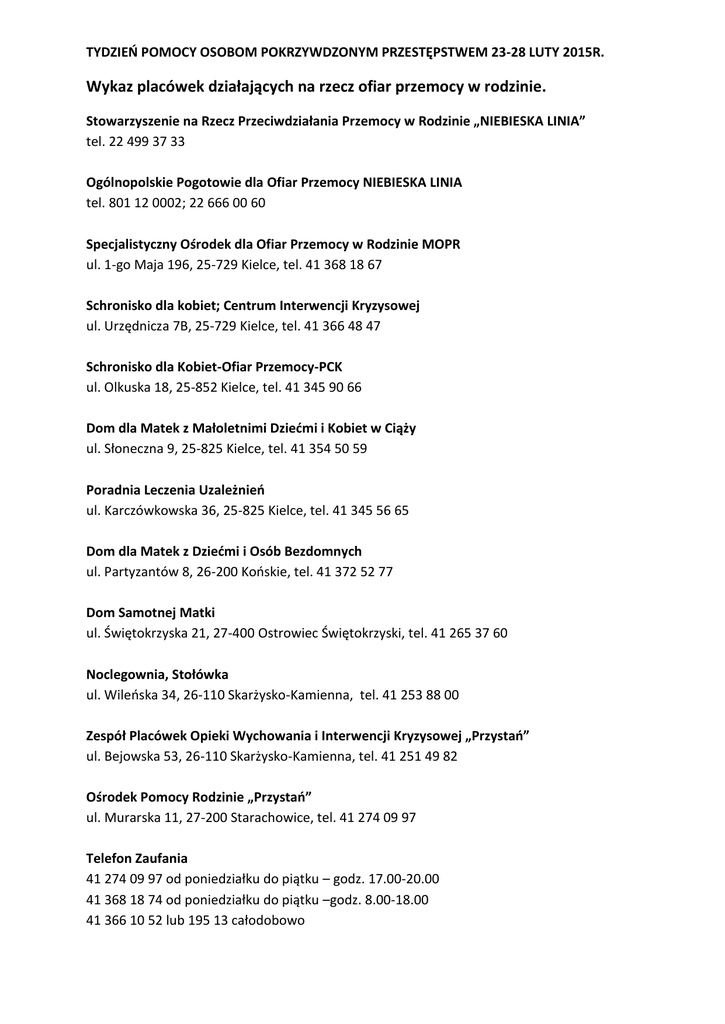 TYDZIEŃ POMOCY OSOBOM POKRZYWDZONYM PRZESTĘPSTWEM 23-28 LUTY 2015R. Wykaz placówek działających na rzecz ofiar przemocy w rodzinie. Stowarzyszenie na Rzecz Przeciwdziałania Przemocy w Rodzinie „NIEBIESKA LINIA” tel. 22 499 37 33 Ogólnopolskie Pogotowie dla Ofiar Przemocy NIEBIESKA LINIA tel. 801 12 0002; 22 666 00 60 Specjalistyczny Ośrodek dla Ofiar Przemocy w Rodzinie MOPR ul. 1-go Maja 196, 25-729 Kielce, tel. 41 368 18 67 Schronisko dla kobiet; Centrum Interwencji Kryzysowej ul. Urzędnicza 7B, 25-729 Kielce, tel. 41 366 48 47 Schronisko dla Kobiet-Ofiar Przemocy-PCK ul. Olkuska 18, 25-852 Kielce, tel. 41 345 90 66 Dom dla Matek z Małoletnimi Dziećmi i Kobiet w Ciąży ul. Słoneczna 9, 25-825 Kielce, tel. 41 354 50 59 Poradnia Leczenia Uzależnień ul. Karczówkowska 36, 25-825 Kielce, tel. 41 345 56 65 Dom dla Matek z Dziećmi i Osób Bezdomnych ul. Partyzantów 8, 26-200 Końskie, tel. 41 372 52 77 Dom Samotnej Matki ul. Świętokrzyska 21, 27-400 Ostrowiec Świętokrzyski, tel. 41 265 37 60 Noclegownia, Stołówka ul. Wileńska 34, 26-110 Skarżysko-Kamienna, tel. 41 253 88 00 Zespół Placówek Opieki Wychowania i Interwencji Kryzysowej „Przystań” ul. Bejowska 53, 26-110 Skarżysko-Kamienna, tel. 41 251 49 82 Ośrodek Pomocy Rodzinie „Przystań” ul. Murarska 11, 27-200 Starachowice, tel. 41 274 09 97 Telefon Zaufania 41 274 09 97 od poniedziałku do piątku – godz. 17.00-20.00 41 368 18 74 od poniedziałku do piątku –godz. 8.00-18.00 41 366 10 52 lub 195 13 całodobowo