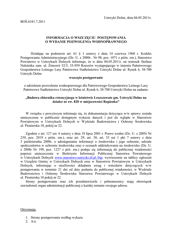 Ustrzyki Dolne, dnia 04.05.2011r. BOŚ.6341.7.2011 INFORMACJA O WSZCZĘCIU POSTĘPOWANIA O WYDANIE POZWOLENIA WODNOPRAWNEGO Działając na podstawie art. 61 § 1 ustawy z dnia 14 czerwca 1960 r. Kodeks Postępowania Administracyjnego (Dz. U. z 2000r. Nr 98, poz. 1071 z późn. zm.), Starostwo Powiatowe w Ustrzykach Dolnych informuje, Ŝe w dniu 04.05.2011r. na wniosek Stefana Naleśnika zam. ul. Zimowit 52/5, 35-959 Rzeszów występującego w imieniu Państwowego Gospodarstwa Leśnego Lasy Państwowe Nadleśnictwo Ustrzyki Dolne ul. Rynek 6, 38-700 Ustrzyki Dolne wszczęto postępowanie o udzielenie pozwolenia wodnoprawnego dla Państwowego Gospodarstwa Leśnego Lasy Państwowe Nadleśnictwo Ustrzyki Dolne ul. Rynek 6, 38-700 Ustrzyki Dolne na zadanie: „Budowa zbiornika retencyjnego w leśnictwie Leszczowate gm. Ustrzyki Dolne na działce nr ew. 820 w miejscowości Ropienka” W związku z powyŜszym informuje się, Ŝe dokumentacja dotycząca w/w sprawy została umieszczona w publicznie dostępnym wykazie danych i jest do wglądu w Starostwie Powiatowym w Ustrzykach Dolnych w Wydziale Budownictwa i Ochrony Środowiska ul. Pionierska 10, pokój nr 22. Zgodnie z art. 127 ust. 6 ustawy z dnia 18 lipca 2001 r. Prawo wodne (Dz. U. z 2005r Nr 239, poz. 2019 z późn. zm.), oraz art. 29, art. 30, art. 33 ust 1 pkt 7 ustawy z dnia 3 października 2008r. o udostępnianiu informacji o środowisku i jego ochronie, udziale społeczeństwa w ochronie środowiska oraz o ocenach oddziaływania na środowisko (Dz. U. z 2008r Nr 199, poz. 1227 z póź. zm.) podaje się informację do publicznej wiadomości poprzez umieszczenie w Biuletynie Informacji Publicznej Starostwa Powiatowego w Ustrzykach Dolnych www.starostwo-ustrzyki.itl.pl./bip, wywieszenie na tablicy ogłoszeń w Urzędzie Gminy w Ustrzykach Dolnych oraz w Starostwie Powiatowym w Ustrzykach Dolnych, informując o moŜliwości składania uwag i wniosków dotyczących w/w postępowania w terminie 21 dni od daty podania do publicznej wiadomości, w Wydziale Budownictwa i Ochrony Środowiska Starostwa Powiatowego w Ustrzykach Dolnych ul. Pionierska 10 pokój nr 22. Strony postępowania oraz ich przedstawiciele i pełnomocnicy mają obowiązek zawiadomić organ administracji publicznej o kaŜdej zmianie swojego adresu. Otrzymują: 1. Strony postępowania według wykazu 2. A/a Strony postępowania: 1. Regionalny Zarząd Gospodarki Wodnej w Krakowie Zarząd Zlewni Sanu z/s w Przemyślu ul. WybrzeŜe Ojca Św. Jana Pawła II 6, 37-700 Przemyśl + operat wodnoprawny 2. Urząd Gminy w Ustrzykach Dolnych ( z prośbą o wywieszenie na tablicy ogłoszeń) 3. Okręg Polskiego Związku Wędkarskiego w Krośnie ul. Jasna 26a, 38-404 Krosno 4. tablica ogłoszeń w/m